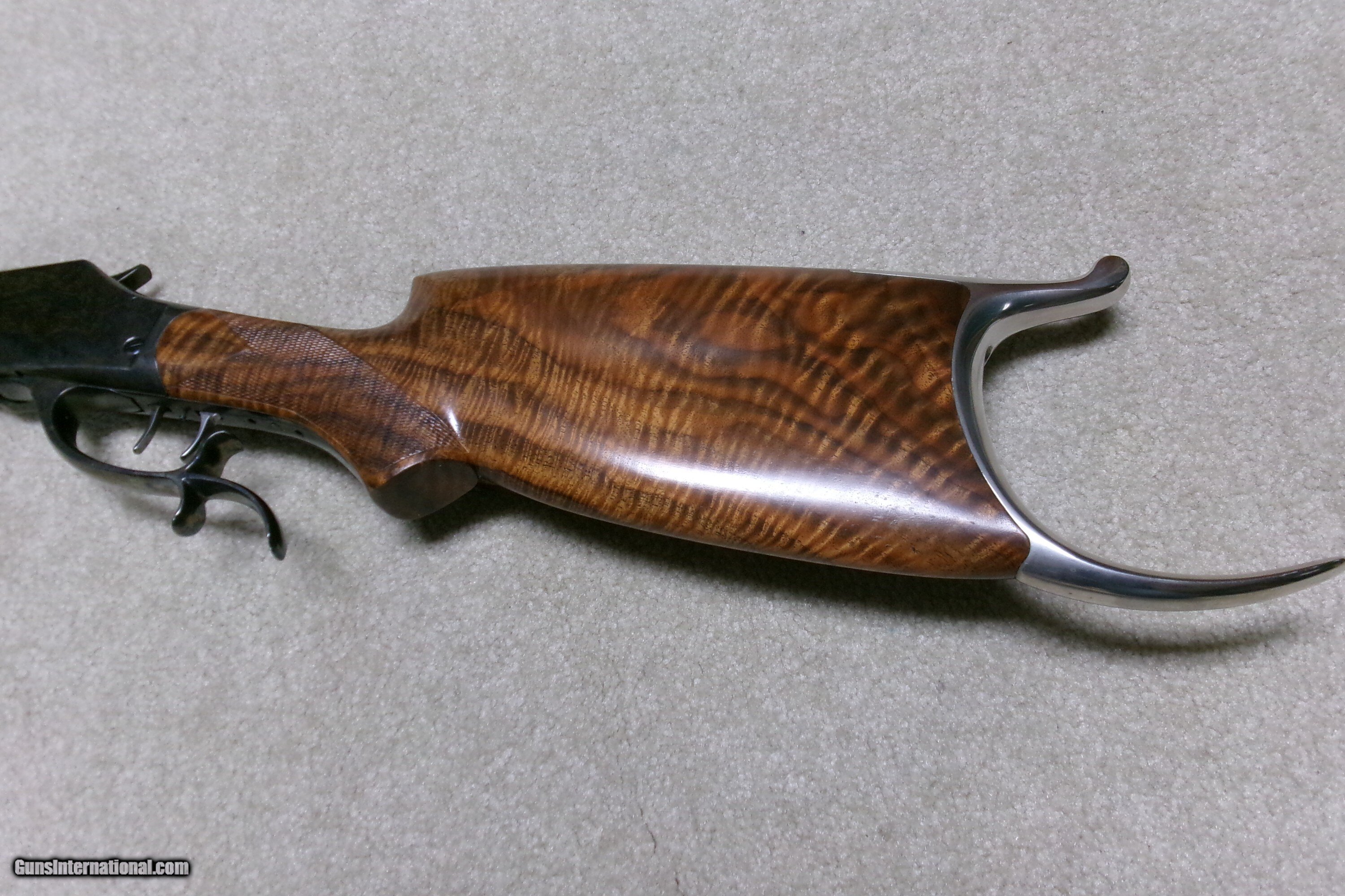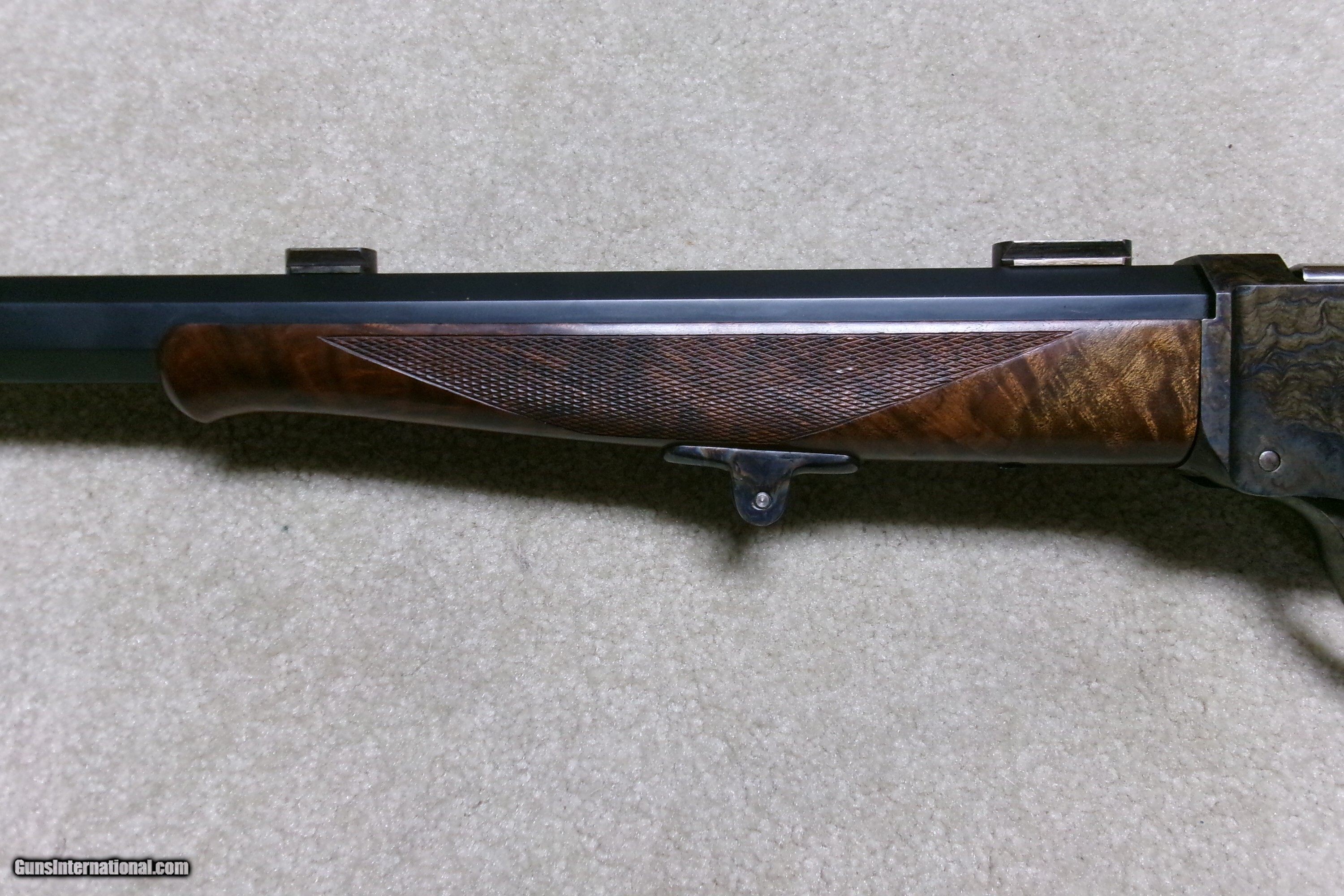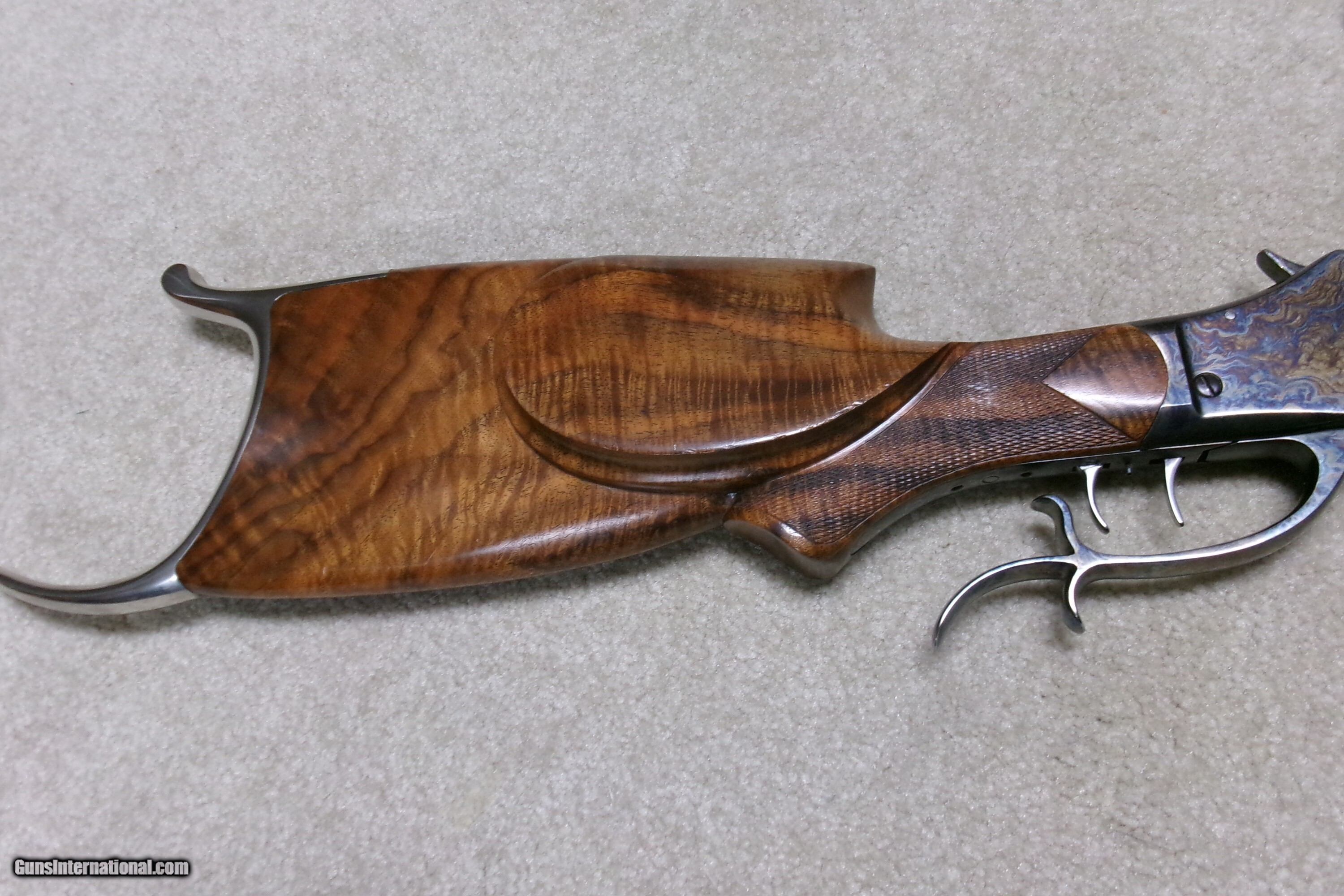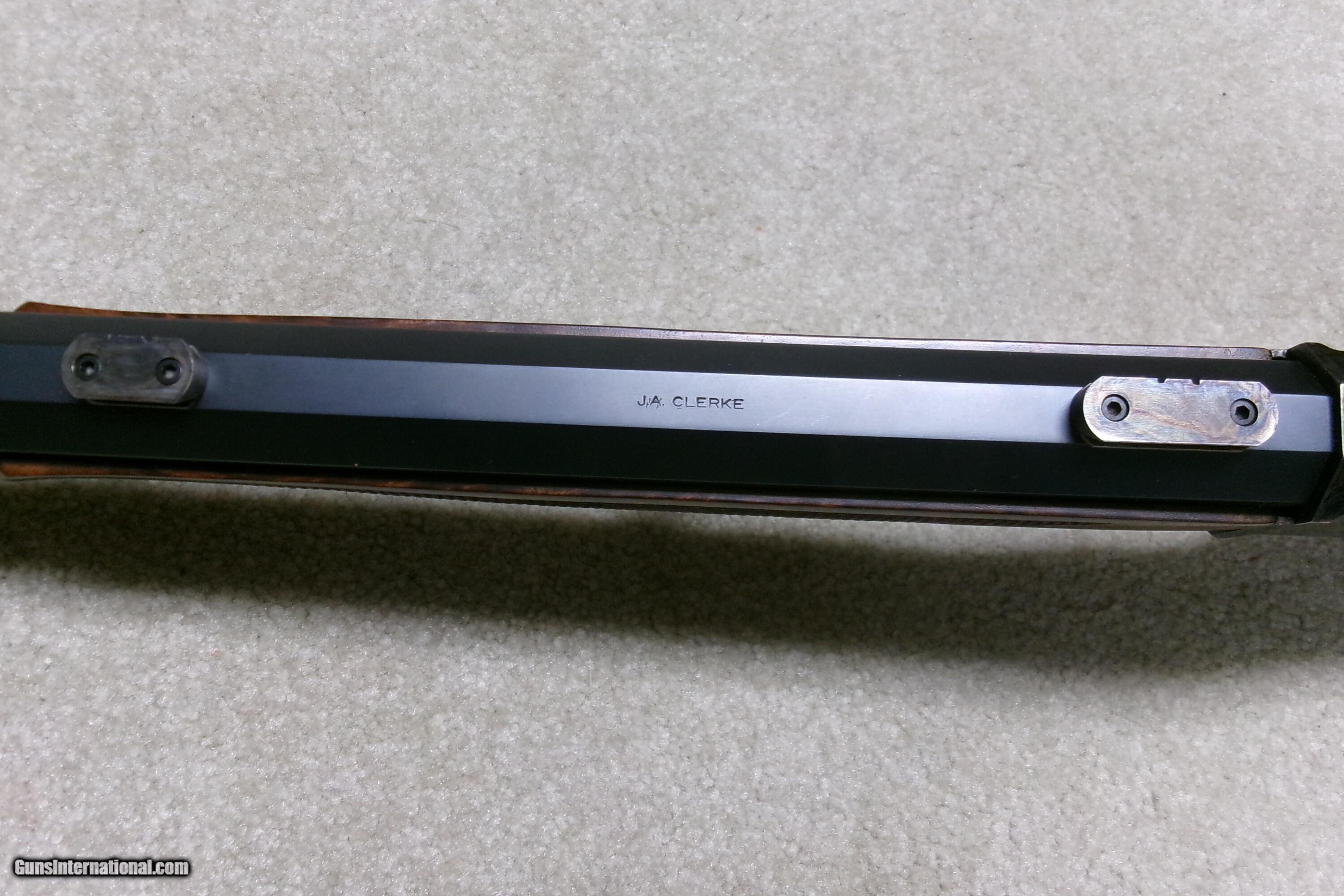 Description: BEAUTIFUL CUSTOM LEFT HAND SCHUETZEN .32-40 HIGH WALL BY J. A. “BO” CLERKE, SERIAL NIUMBER 1984-001. By the serial number I assume this was made in 1984. Presentation grade walnut in stock and forend with raised cheek piece and accent line. Full nickel plated Schuetzen butt plate, fancy unusual color case hardening on the Schuetzen style lever and receiver. Double set triggers with adjustment screws. Fitted for a palm rest (palm rest not included, but could probably be had from CPA rifles). Nicely checkered pistol grip with schnable bottom and matching checkering on the forend. No sight dovetails on the 30” octagon barrel, but fitted with case colored scope blocks. Weighs just under 12 lbs. Upper tang marked “Serrifile Inc., Lancaster, CA” and the barrel top is marked “J. A. Clerke.” Aside from the most minor of handling marks in the stock that you’d have to look carefully to find, this one appears about new inside and out. Manufacturer: J. A. Clerke Model: 1885 Serial Number: 1984-001 Barrel Length: 30" OCT. Condition: NEAR NEW Bore Condition: EXCELLENT Price: $3,850.00 Contact Seller |