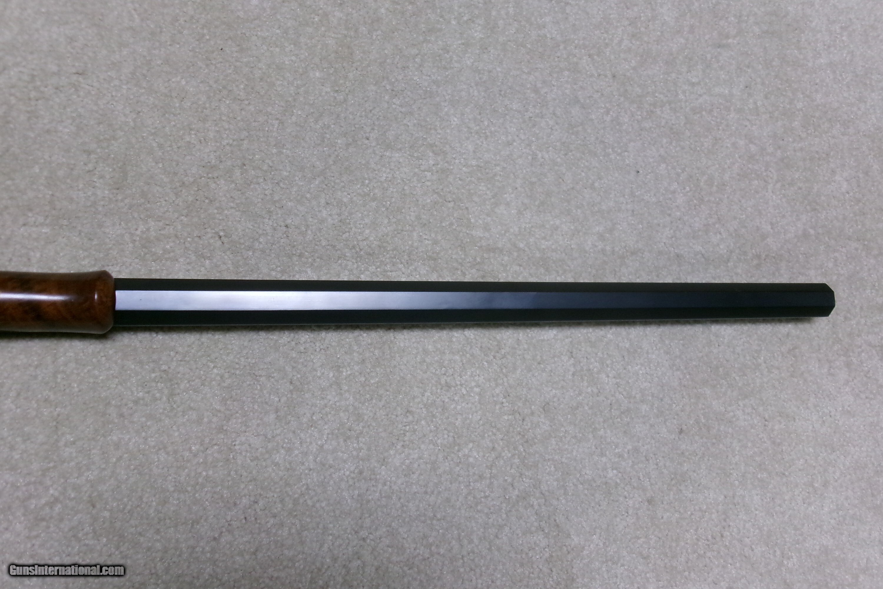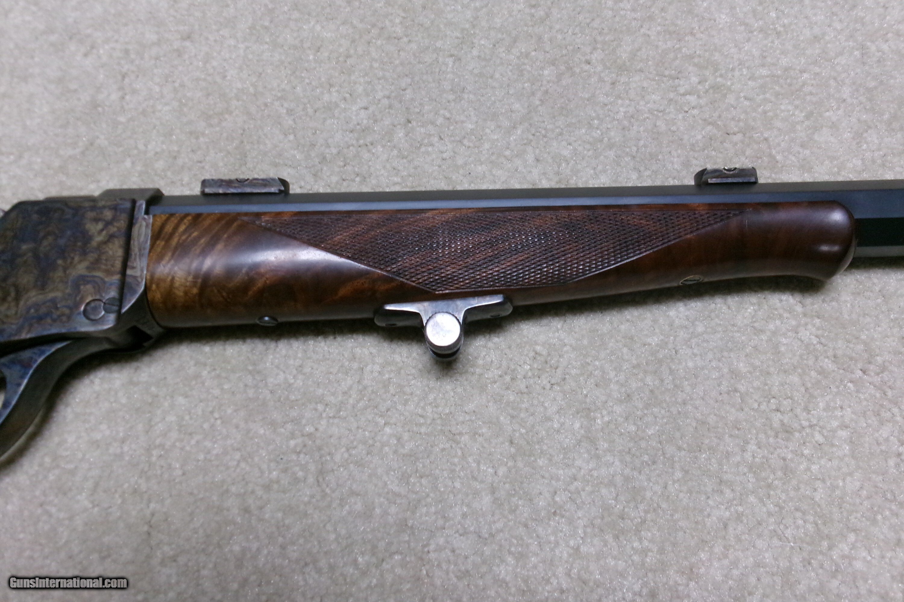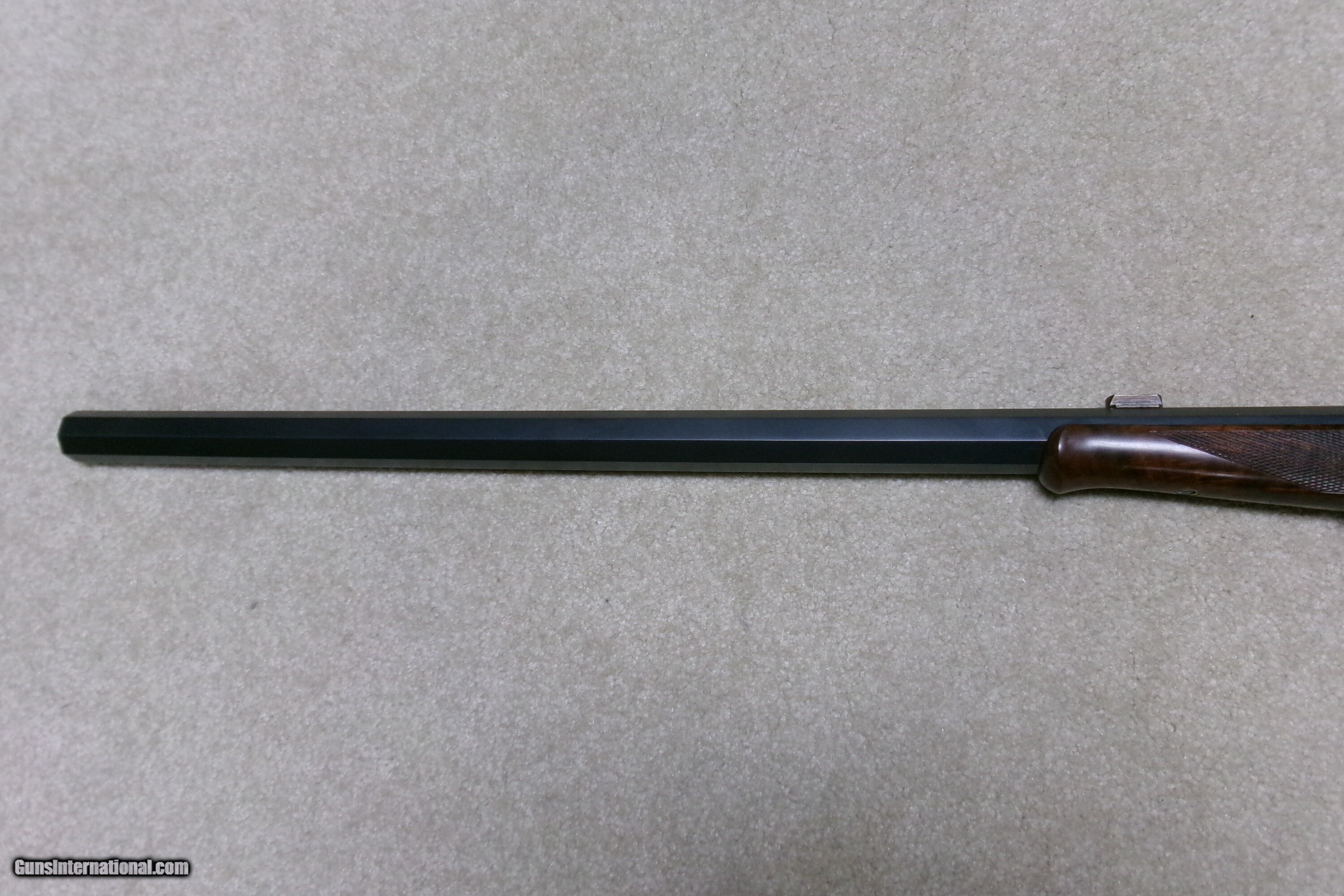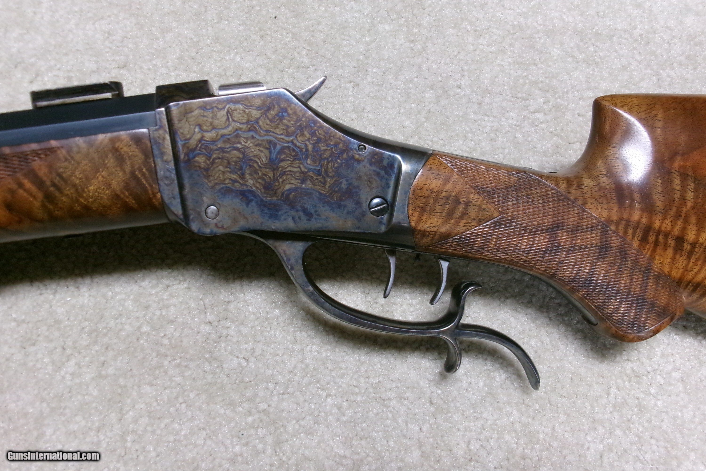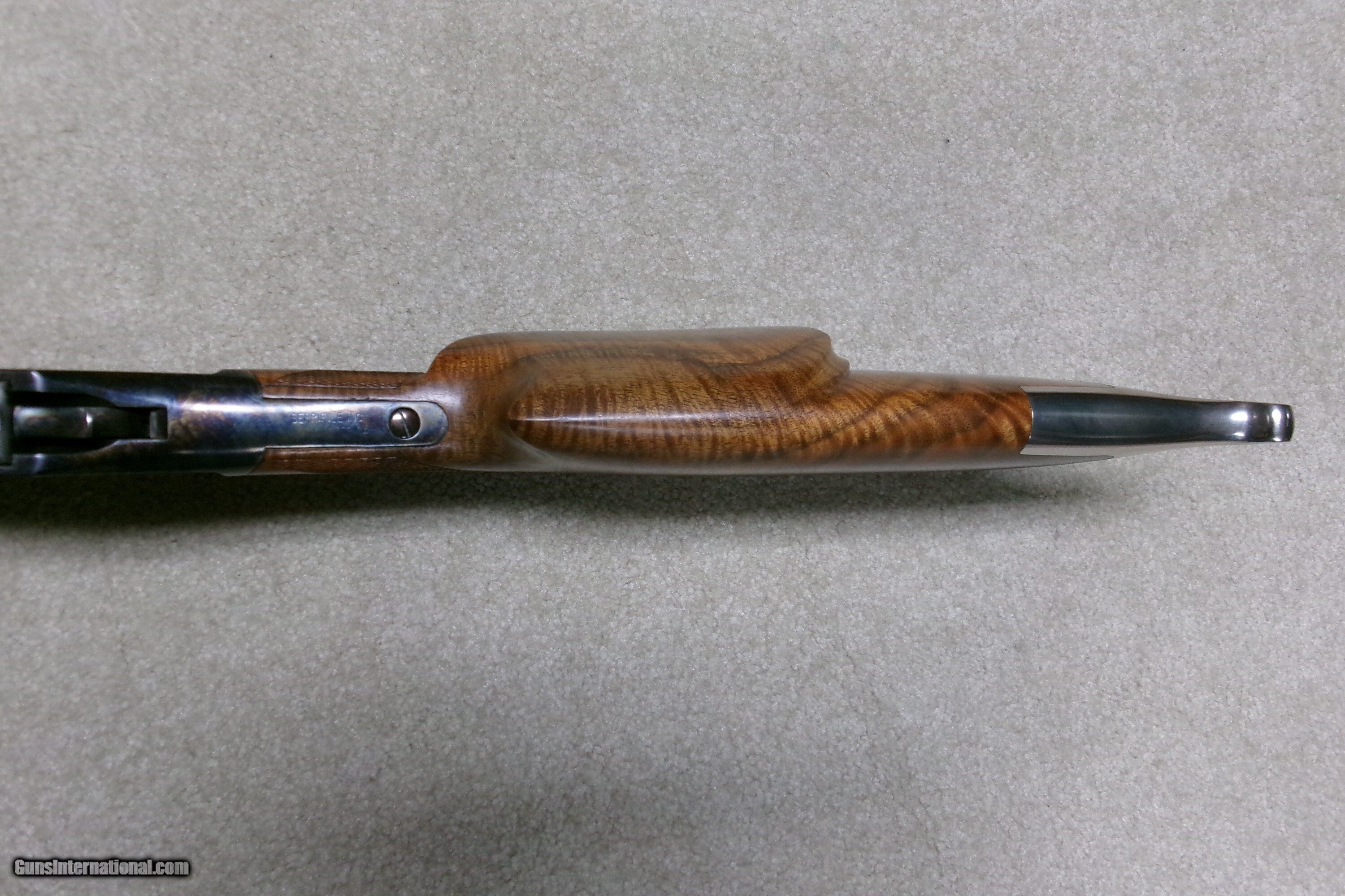 Description: BEAUTIFUL CUSTOM LEFT HAND SCHUETZEN .32-40 HIGH WALL BY J. A. “BO” CLERKE, SERIAL NIUMBER 1984-001. By the serial number I assume this was made in 1984. Presentation grade walnut in stock and forend with raised cheek piece and accent line. Full nickel plated Schuetzen butt plate, fancy unusual color case hardening on the Schuetzen style lever and receiver. Double set triggers with adjustment screws. Fitted for a palm rest (palm rest not included, but could probably be had from CPA rifles). Nicely checkered pistol grip with schnable bottom and matching checkering on the forend. No sight dovetails on the 30” octagon barrel, but fitted with case colored scope blocks. Weighs just under 12 lbs. Upper tang marked “Serrifile Inc., Lancaster, CA” and the barrel top is marked “J. A. Clerke.” Aside from the most minor of handling marks in the stock that you’d have to look carefully to find, this one appears about new inside and out. Manufacturer: J. A. Clerke Model: 1885 Serial Number: 1984-001 Barrel Length: 30" OCT. Condition: NEAR NEW Bore Condition: EXCELLENT Price: $3,850.00 Contact Seller |