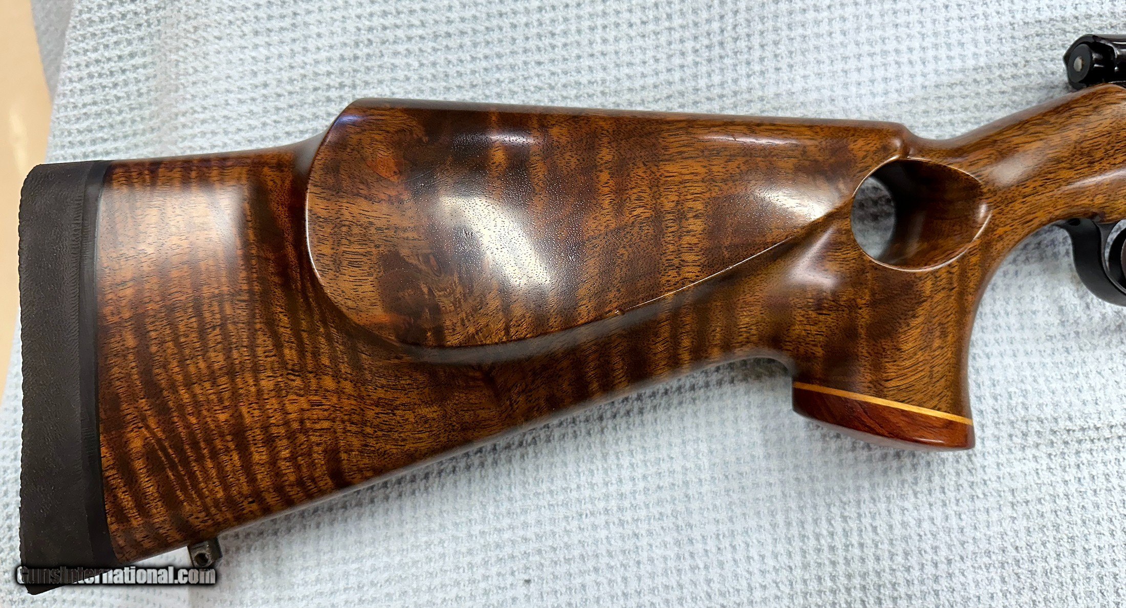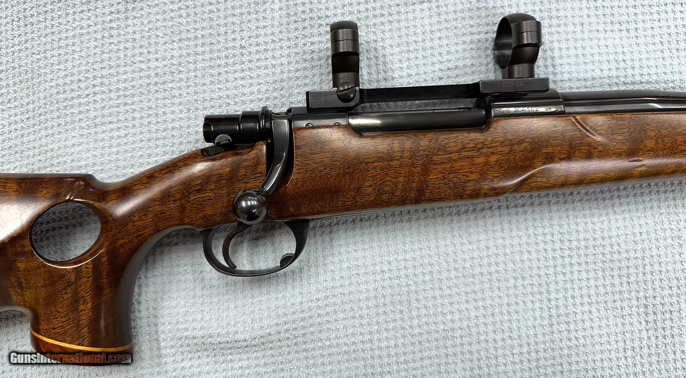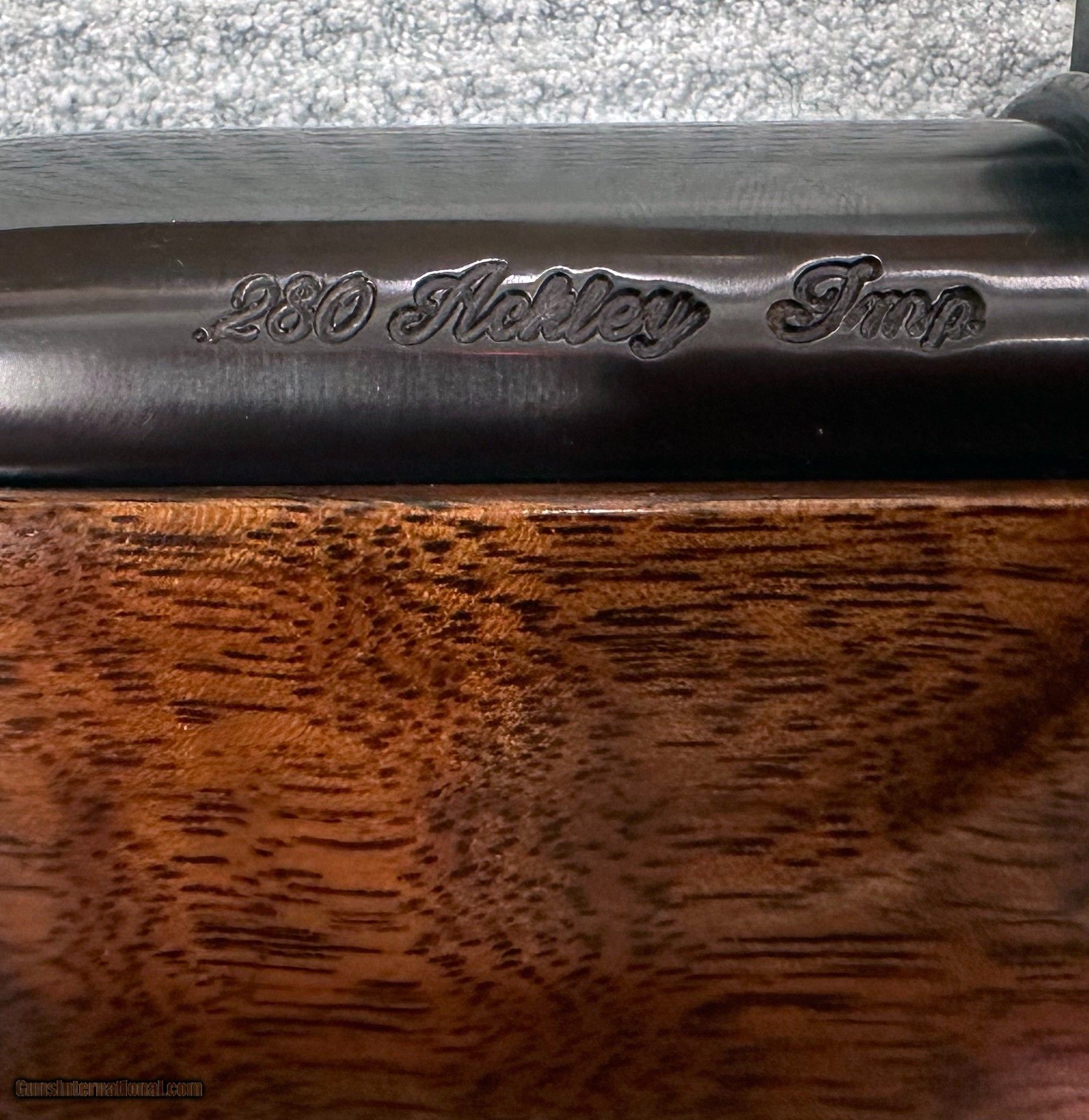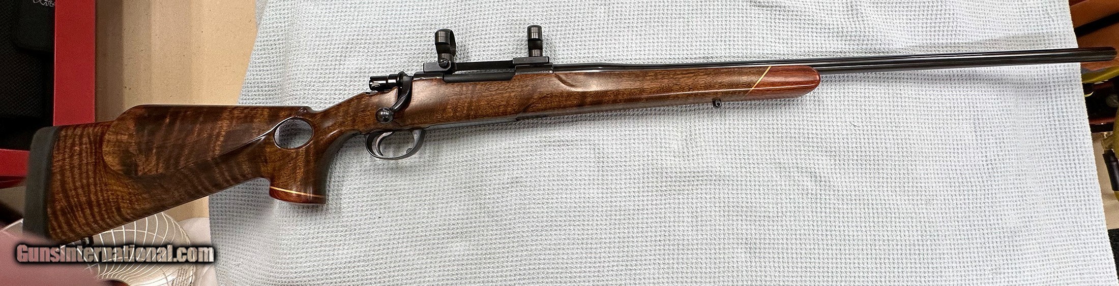 Description: This is for a custom made rifle in .280 Ackley Improved. 9X wood, thumbhole stock. Rosewood and maple trim. Built on an Interarms Mark X Action. Right hand action, left hand stock. Rings and mounts are Leupold 30mm. Barrel is 25". Unknown twist rate. A real nice example. Couple nicks in the lumber. Otherwise in very excellent condition. In my collection; never fired by me. Bought from a leftie collector known for years, now deceased. I have always been a fan of Ackley calibers. I am selling all my collection of many years due to age and ill health. See my feedback. Ask all questions now, no returns. Priced right. See my other leftie listings, all rare birds. Shipped USPS priority mail, due to new FedEx and UPS rules. Shipping costs have doubled since March. Buyer pays actual shipping cost. No credit cards, checks, money orders, cashiers checks only. DUE TO THE BROKEN NATURE OF FIRST CLASS MAIL, ALL PAYMENTS MUST BE SENT BY PRIORITY MAIL, EXPRESS MAIL, OR FED EX. NO EXCEPTIONS. Thank you for your interest. SOLD Rifle Caliber: .280 Ackley Improved |