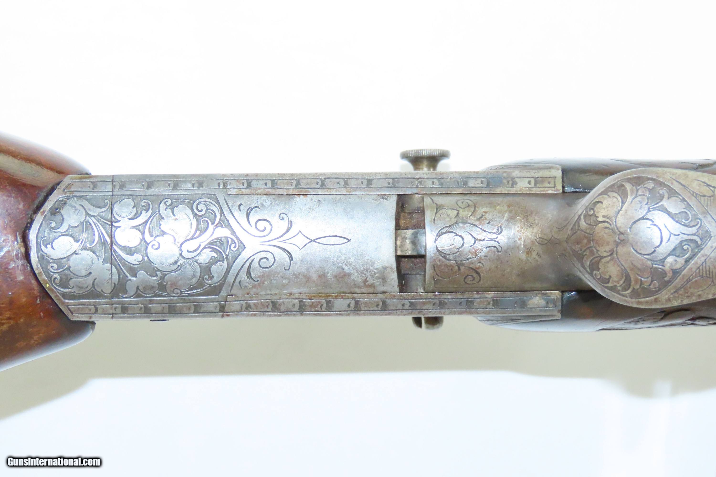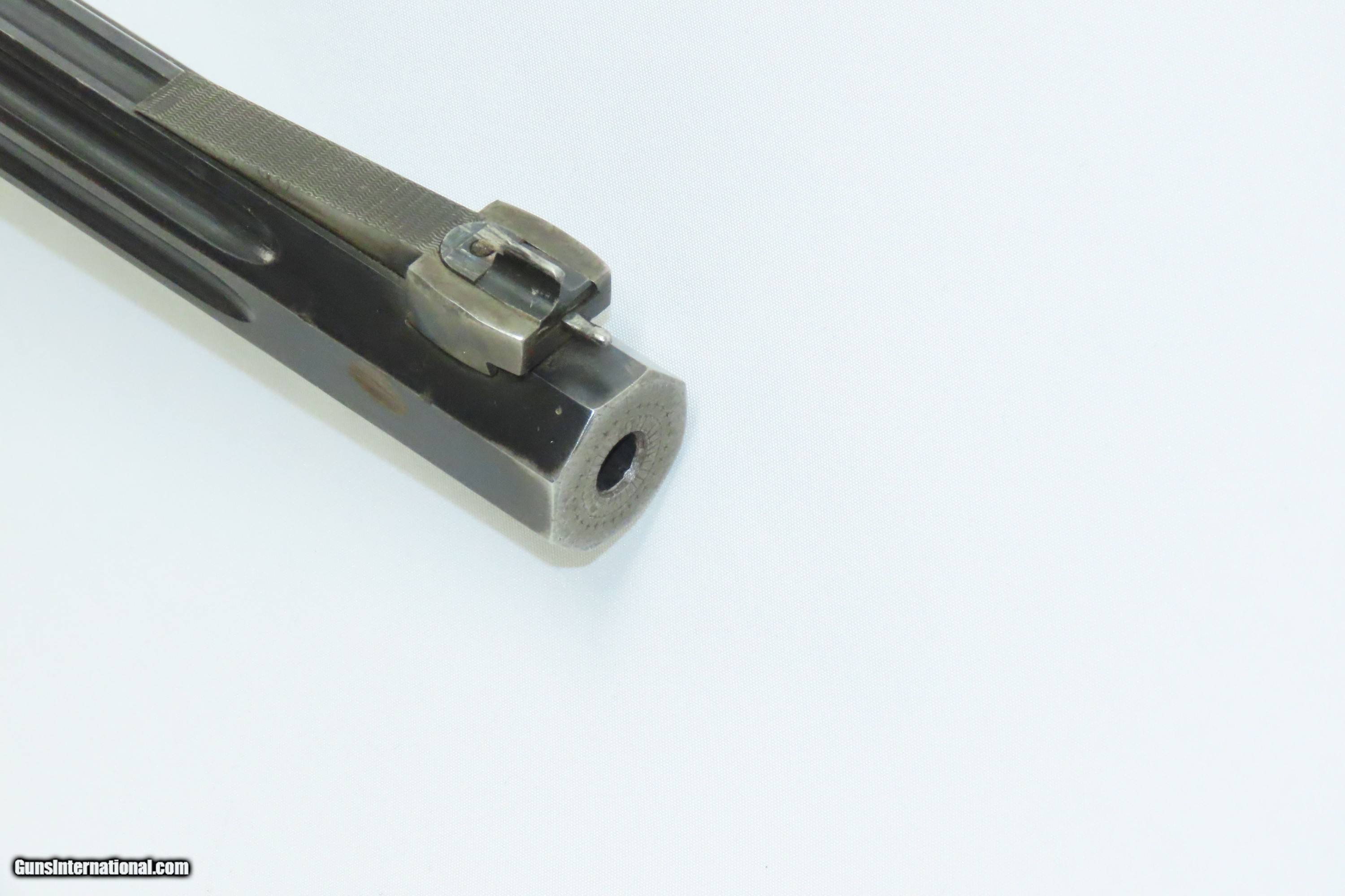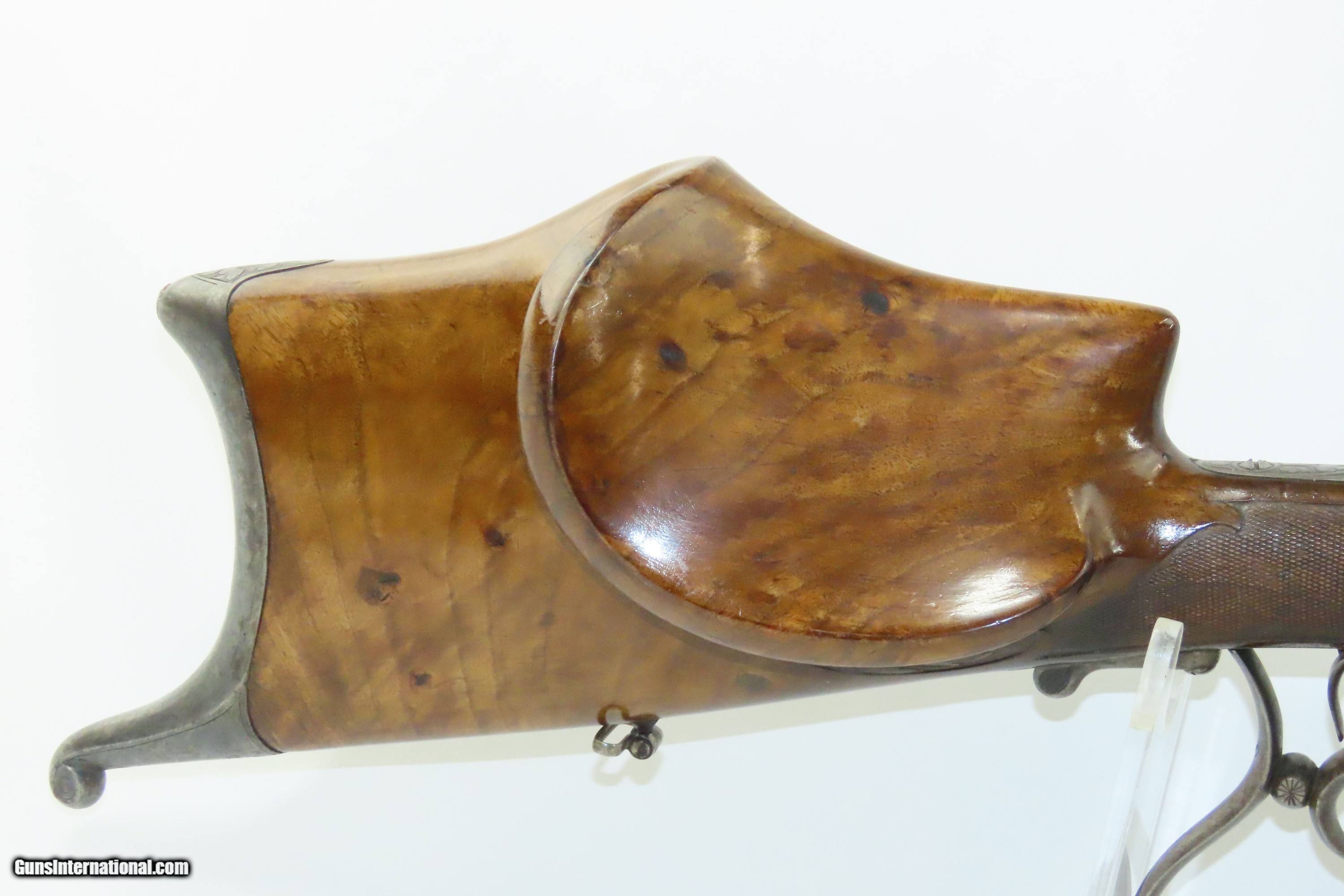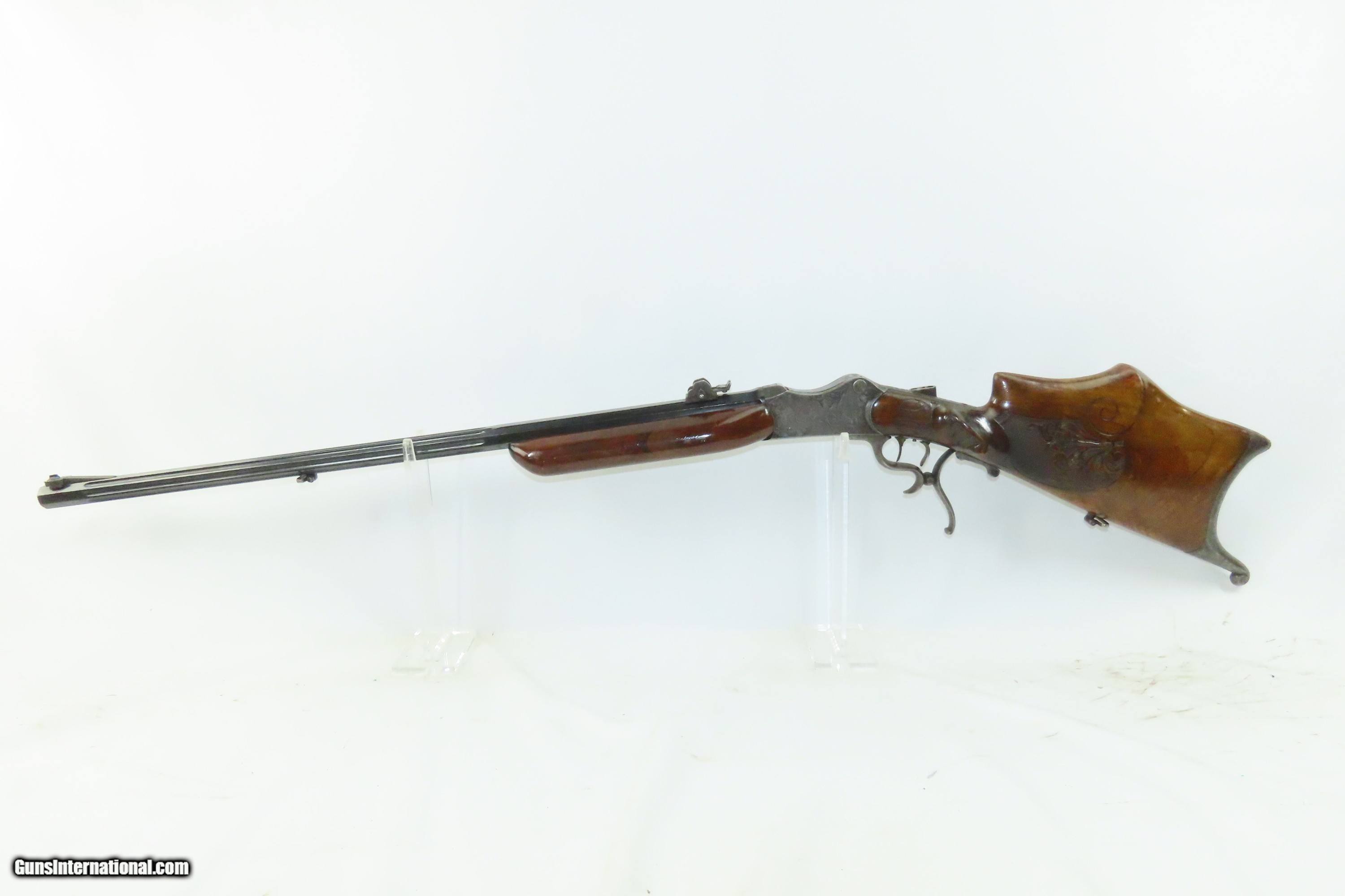 Description: GAME SCENE ENGRAVED Martini SCHUETZEN 8mm Single Shot LEFT HANDED Rifle C&R 20th Century Long Range Competition Style Rifle Here we present a C&R Game Scene Engraved Left Handed Martini Style Schuetzen Single Shot Target Rifle, made circa the turn of the century. This rifle features a distinctive butt stock with a generous cheek piece. The trigger guard is large and is designed to be used as a pistol grip. This rifle features double set triggers that provide an extremely light and crisp break. The fluted barrel is 30 inches long and octagonal with a rifled ~8mm bore (the former owner had it down as 8.15x46R). This is a fantastic set up for shooting long range and promises to be a lot of fun today. The overall condition is fine. Original finish, clear engraving. Excellent action. The bore is bright with sharp rifling. The carved stock is in fine condition. The barrel mounted sight is graduated and has markings at 175 and 300. It has a fluted barrel with a top rib that allows the rear sight to slide. Rear tang sight is absent. The stock is set up for a left handed shooter. BUG proofed on the bottom of the barrel. This gun has a beautiful game scene engraved on both sides of the receiver along with a nicely carved stock. This firearm is classified as a Curio & Relic. Barrel: 30 inches. Caliber: Most likely 8.15x46R Overall condition as seen in photos. Very Fast. Very Safe. FREE SHIPPING. Will need to be sent to your local FFL or C&R licensee. This firearm is classified as a Curio & Relic. Guaranteed AUTHENTIC & Includes CERTIFICATE OF AUTHENTICITY. ancestryguns $2200 #230393 SOLD Curio/Relic: Yes |