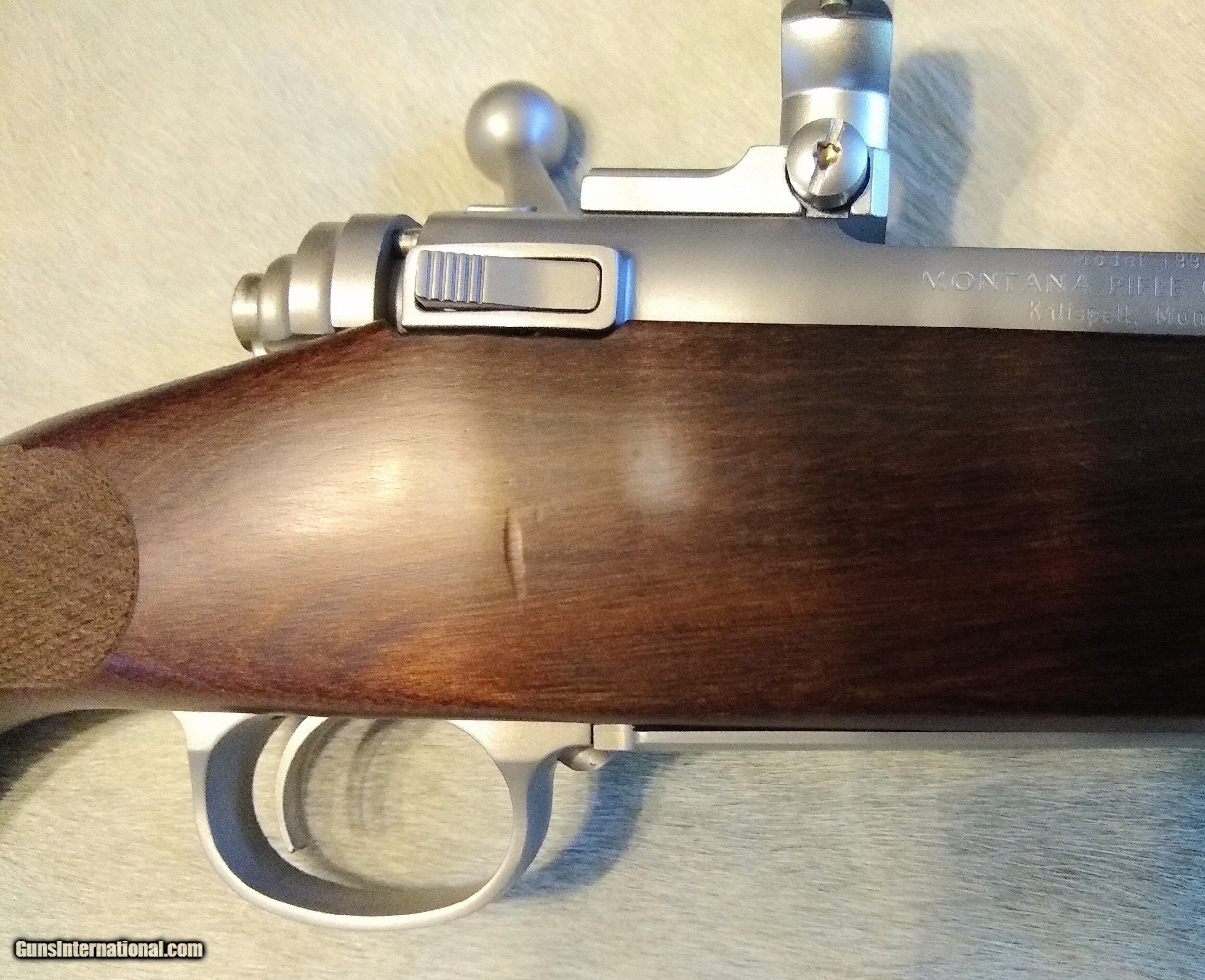 Description: Montana Rifle Company left-hand. This is a really nice custom left-hand gun. It has stainless steel short action and Lilja barrel, with a 25 inch barrel fluted and fitted to a Win. Featherweight Classic stock to keep the weight down at 7.3 lbs. w/o scope. The gun was barreled and fitted to the stock by Dennis Olson of Plains, MT who knows how to do it right. Barrel and receiver was bead blasted giving it a matte finish. He also did some tweaking of the follower so that it now feeds the last cartridge reliably, at least with any factory round I’ve fed it. I’ve shot some really nice groups with this rifle (pics/loads available). The barrel was properly broken in, and has a round count of <100. The factory trigger is fully adjustable. Comes with Leupold matte stainless bases/1 inch rings. The stock has one safe ding about the size of a rice grain, but has never been hunted. Very good shooter. SOLD Rifle Caliber: .308 Winchester Manufacturer: MRC Model: 1999 Barrel Length: 25 |