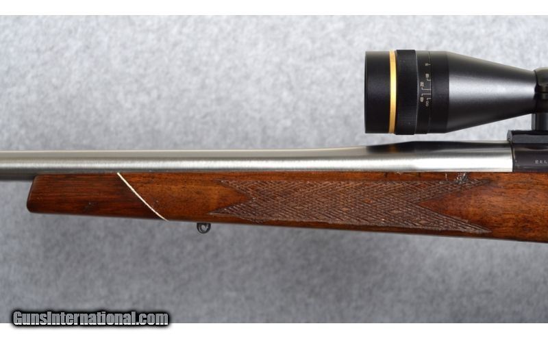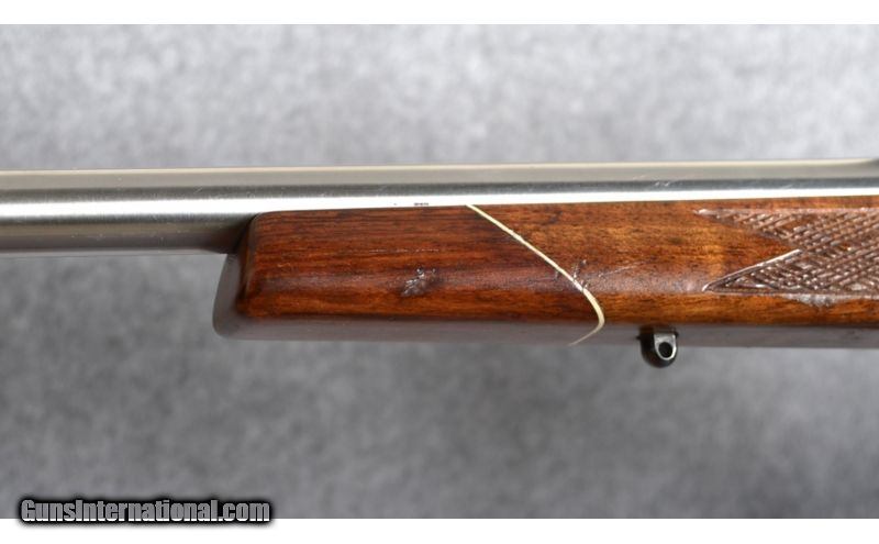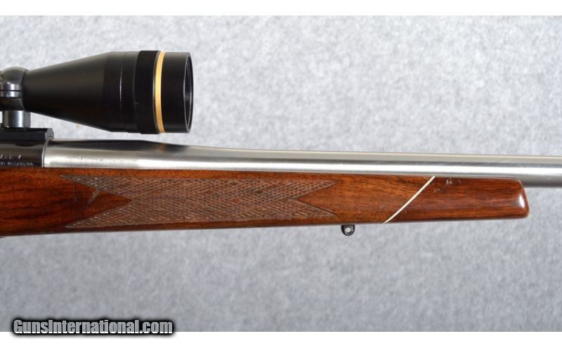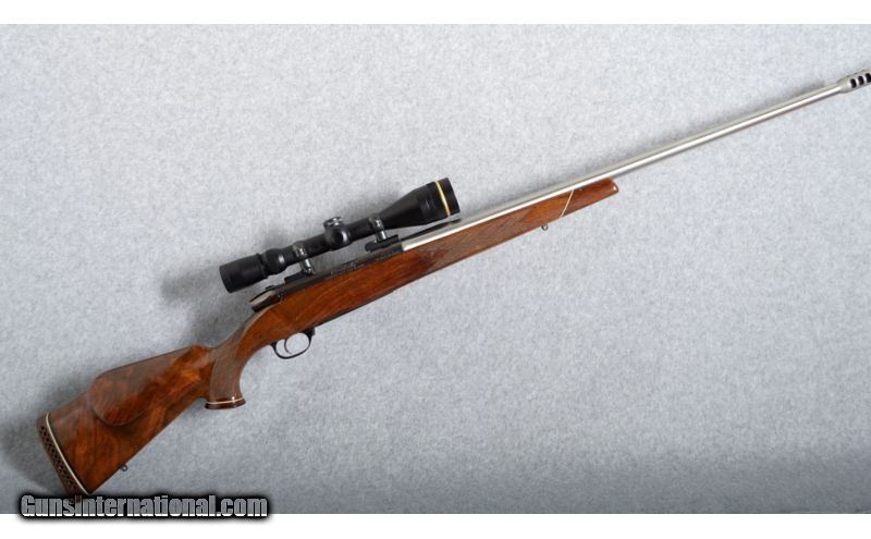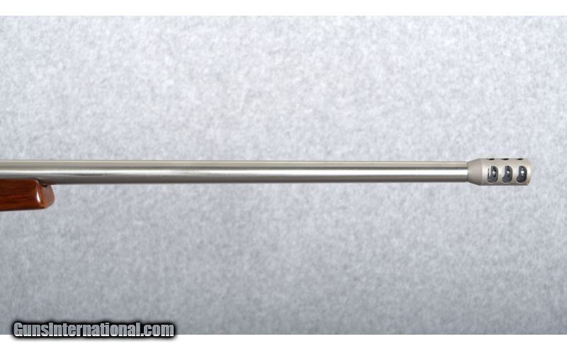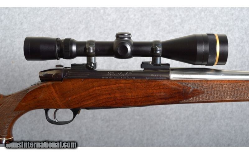 Description: SOLD Manufacturer: 1974 - 1981 - Made in Japan - Serial Number: H86843 Caliber Info: 7mm Wby. Mag. Metal Condition: Good reciever blue, but worn bolt knob and floorplate. Wood Condition: Numerous small scratches, a few dings and scrapes. The forend's barrel channel was opened up for the heavier contour of the custom barrel, making the sides of the forend thin, especially at the top. Bore Condition: Very good bore. Barrels: 26" Custom stainless barrel, 27 1/2" with brake. Unknown barrel and brake maker. Triggers: Single Stock: Weatherby Mark V Deluxe stock with Monte Carlo comb and cheekpiece for left hand shooter. Stock Dimensions: 13 1/2" Length of pull. Fore End: Rosewood forend cap. Butt Pad: Weatherby recoil pad. Weight: 10 1/2 Lbs. with scope. Sights: Leupold VX-3, 4.5-14x40mm with AO (adjustable objective) and varmint hunter reticle. Extras: Scope mounted in Leupold bases and rings, with front extended base and ring. Item Location: Boise, ID |