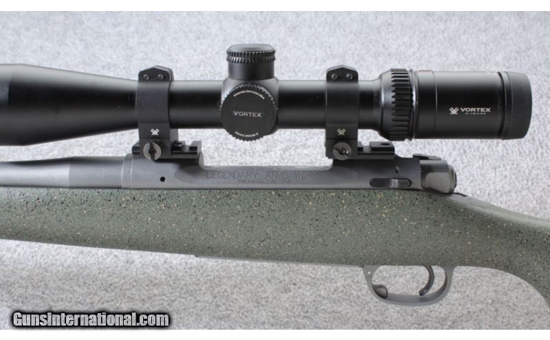 Description: The Legendary Arms Professional rifle features: their M704 control round feed action; a one piece CNC machined fluted bolt, a model 70 style 3 position safety; a triple lapped, Match-Grade, stainless steel, fluted, threaded barrel from Wilson Arms with removable muzzle brake; a custom tuned Timney trigger and a Hand-Laid fiberglass pistol grip stock all to provide durability and accuracy. This rifle is setup and ready to go with a Vortex Viper 4-16x44 scope. SOLD Caliber Info: .257 Wby. Mag. Metal Condition: Excellent Bore Condition: Excellent Barrels: 26 inch fluted stainless Wilson barrel with 1:10 inch twist and muzzle brake Triggers: Custom tuned Timney trigger Stock: Hand-Laid fiberglass pistol grip stock Stock Dimensions: 13 5/8 inch LOP Butt Pad: Decelerator pad Weight: 8 lbs. 14 oz. with scope Sights: Vortex Viper 4-16x44 scope with Dead Hold BDC reticle Item Location: Lehi, UT |