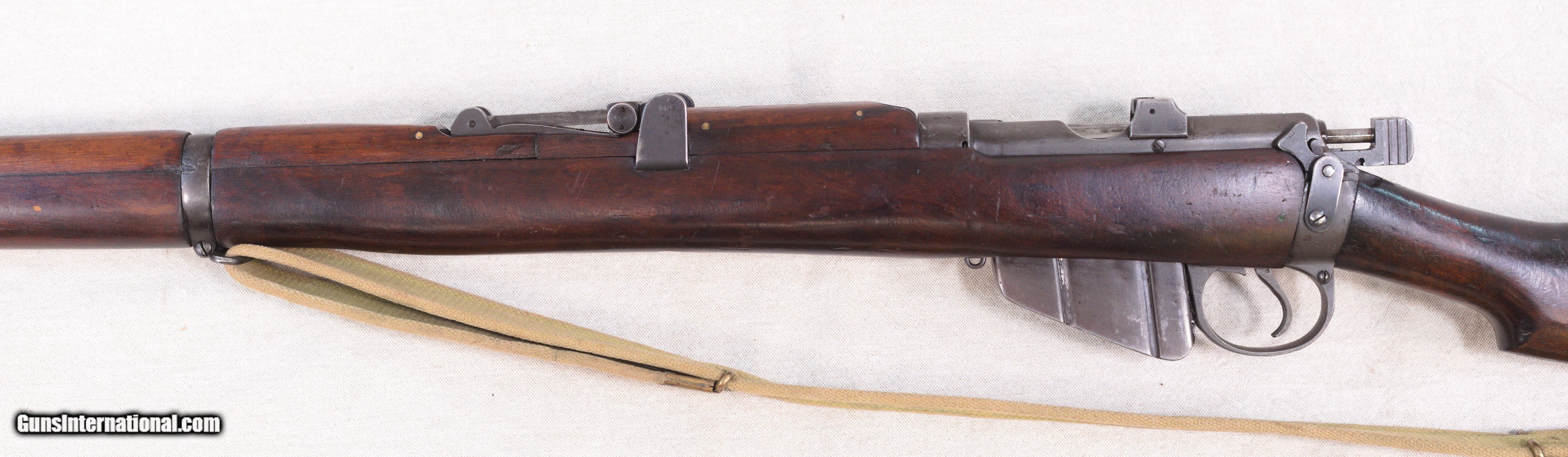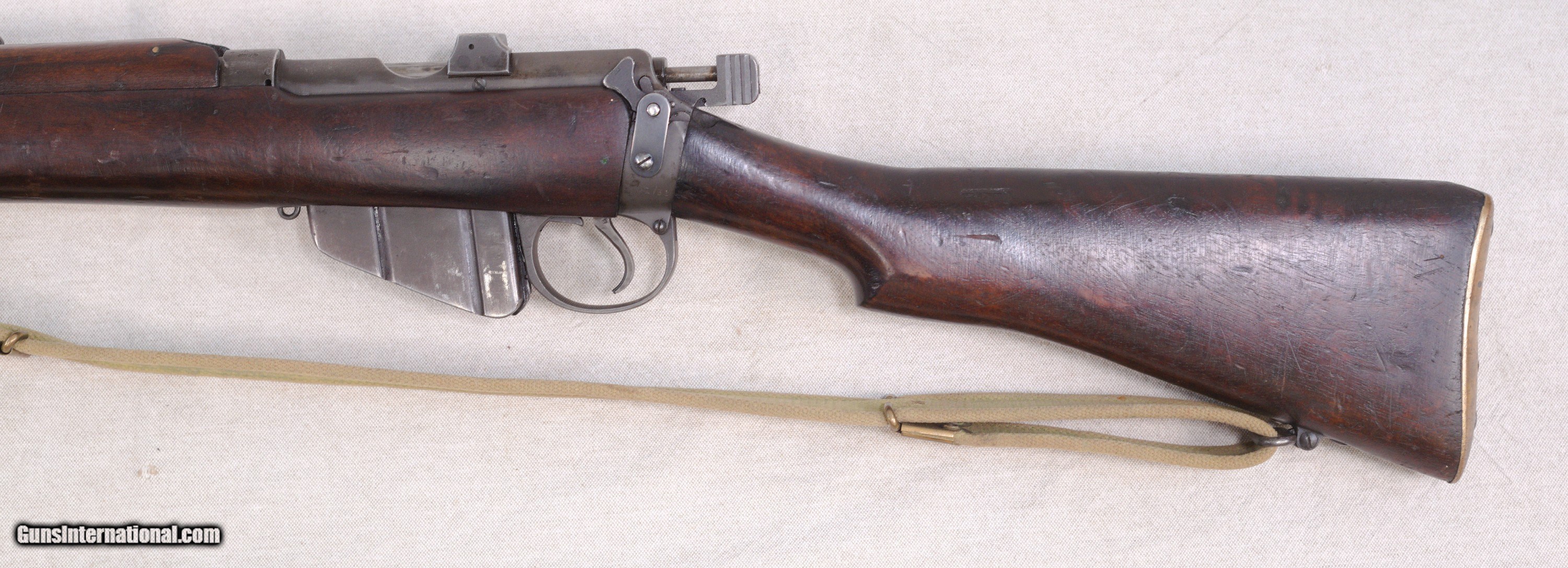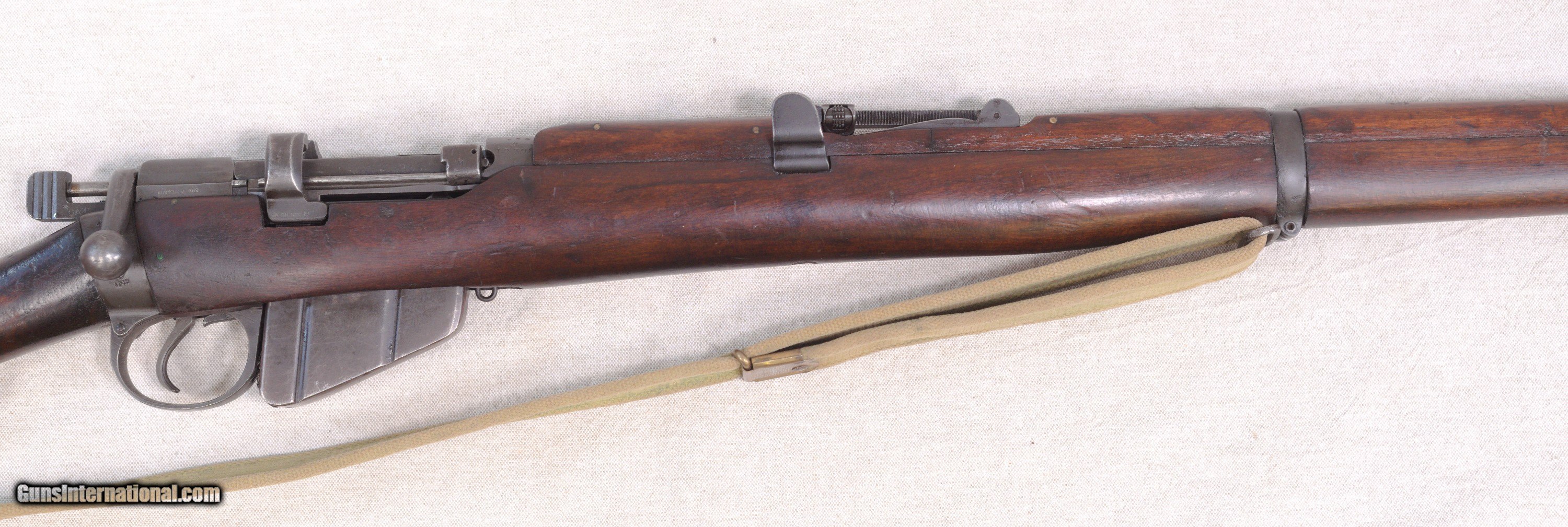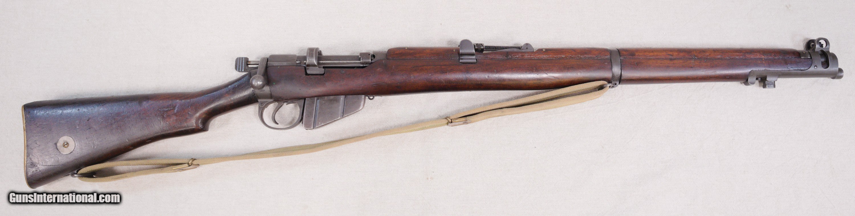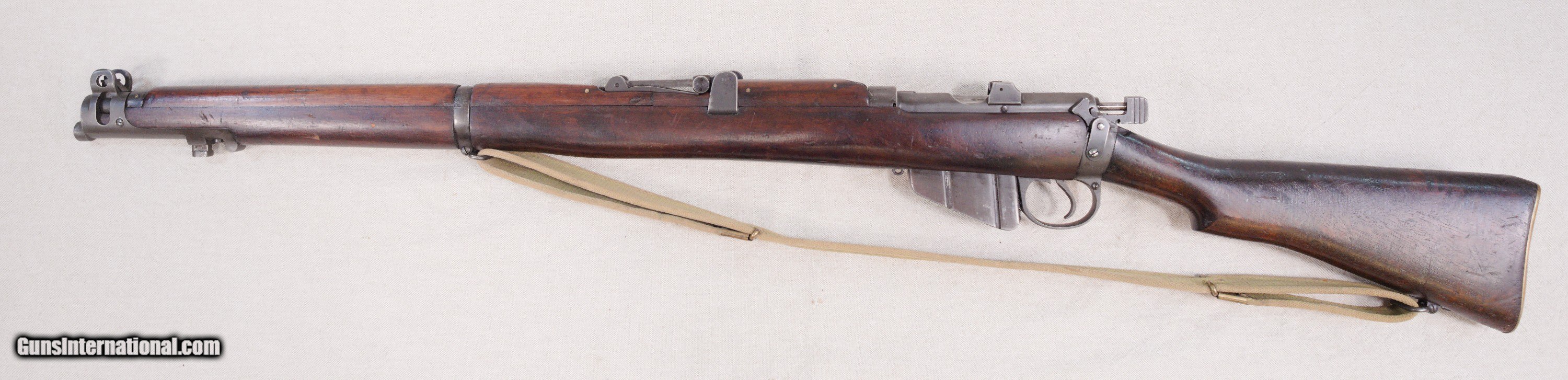 Description: Presented is an Australian made Lithgow SMLE/SHT LE bolt action rifle chambered in .303 British caliber. The Lee–Enfield or Enfield is a bolt-action, magazine-fed repeating rifle that served as the main firearm of the military forces of the British Empire and Commonwealth during the first half of the 20th century, and was the British Army's standard rifle from its official adoption in 1895 until 1957. The WWI versions are often referred to as the "SMLE", which is short for the common "Short, Magazine, Lee–Enfield" variant. A shorter and lighter version of the original MLE—the Rifle, Short, Magazine, Lee–Enfield or SMLE (sometimes spoken as "Smelly," rather than "S-M-L-E")—was introduced on 1 January 1904. The barrel was now halfway in length between the original long rifle and the carbine, at 25.2 inches (640 mm). The SMLE's visual trademark was its blunt nose, with only the bayonet boss protruding a small fraction of an inch beyond the nosecap, being modelled on the Swedish Model 1894 cavalry carbine. This particular example is in very good servicable condition with wear that would be sexpected for a service rifle made in 1918....towards the end of WW1. There are some dinks in the wood and some high edge and muzzle wear but nothing serious. Protected front sight and adjustable rear. The barrel has a good bore and strong rifling. This fine Aussie rifle would make a great addition to a collection of militaria. PRICE: $695.00 We are Antique & Modern Firearms in Lexington, KY, a dealer of fine firearms since 1974. To Inquire please call 859-276-1419 We Buy, Sell and Trade Firearms & Knives. Do you have a Individual Firearm, Firearms Collection, or Firearms Estate to sell? Give us a call or send an email, and we can talk about buying the item(s) outright, or selling them on consignment for you. NOTE: No additional fee for a Credit Card payment SOLD Rifle Caliber: .303 British Manufacturer: Lithgow Model: SMLE SHL TE/No.1 Mk3 Serial Number: A12398 Barrel Length: 25.2 Condition: Good Metal Condition: Good Wood Condition: Good Bore Condition: Good with good rifling Action: Bolt Action Manufacture Date: 1918 |