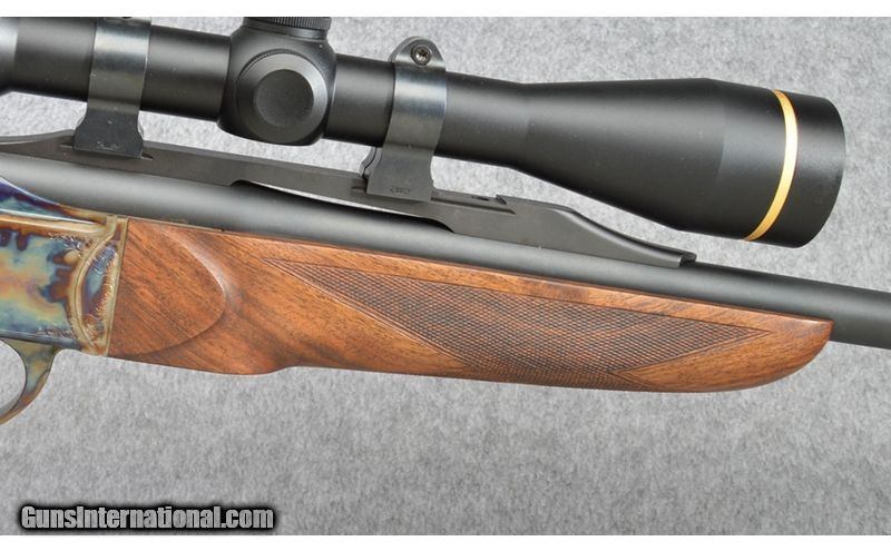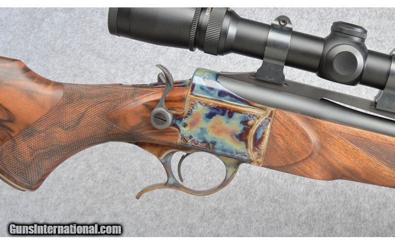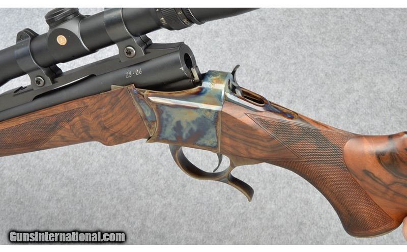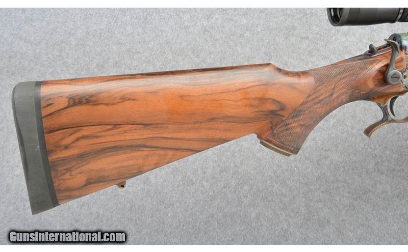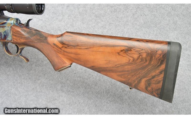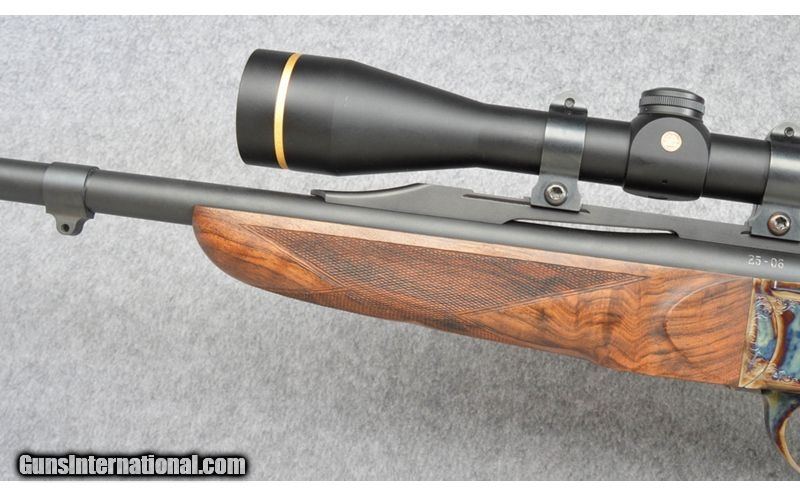 Description: Luxus Arms Model 11 chambered in 25-06 Remington. Single shot sporting rifle features a trigger guard activated break action design with side-mounted hammer cocking lever. Case-hardened receiver and furniture with leaf and vine border engraving, 26 Inch tapered barrel in satin blue finish. Finely checkered capped pistol grip stock of high grade walnut. .25-06 Remington SOLD Metal Condition: Excellent Wood Condition: Excellent Bore Condition: Bright Sharp Barrels: 26 " Tapered Fore End: Checkered Walnut Butt Pad: Pachmayr Weight: 8 lb. 1 oz. Sights: Leupold VX-III 4.5-14x40mm Item Location: Buda, TX |