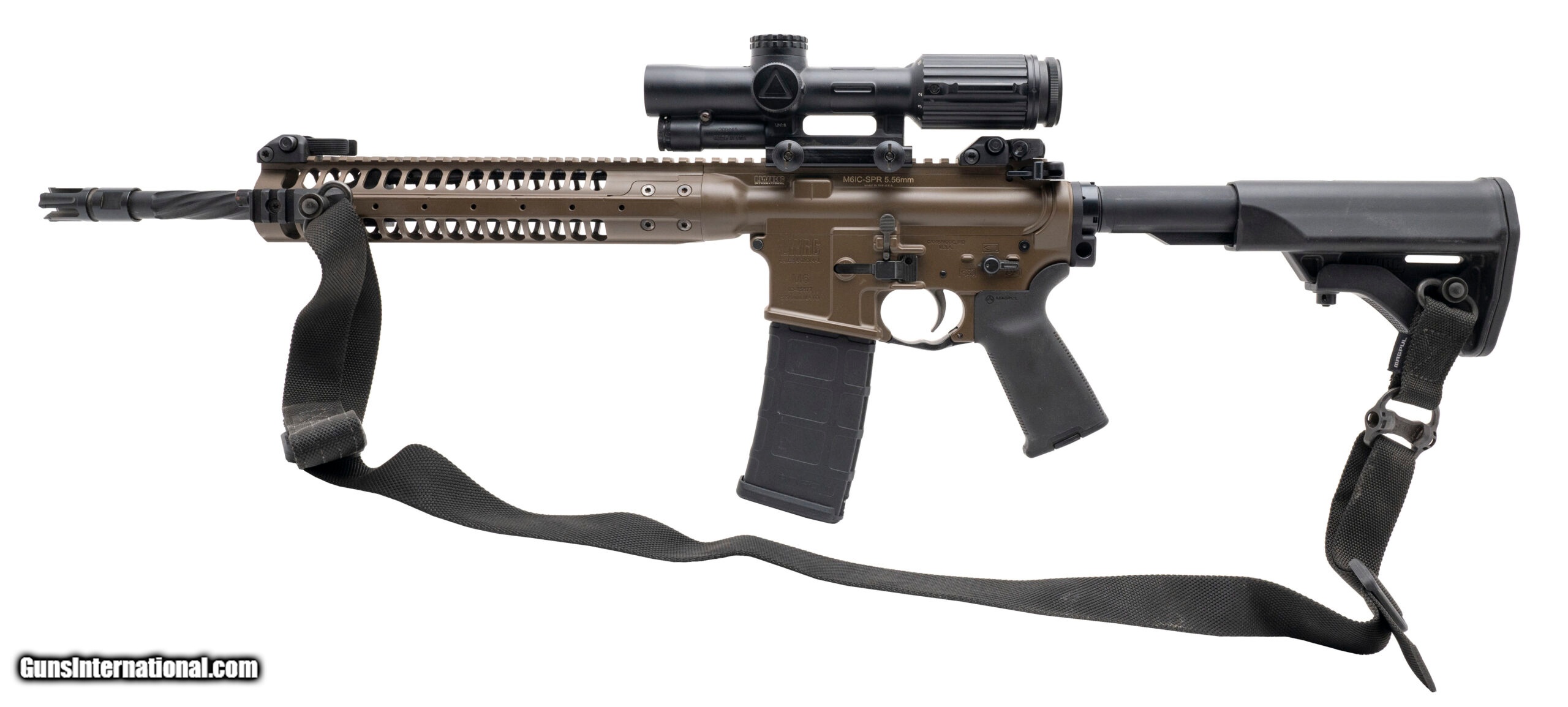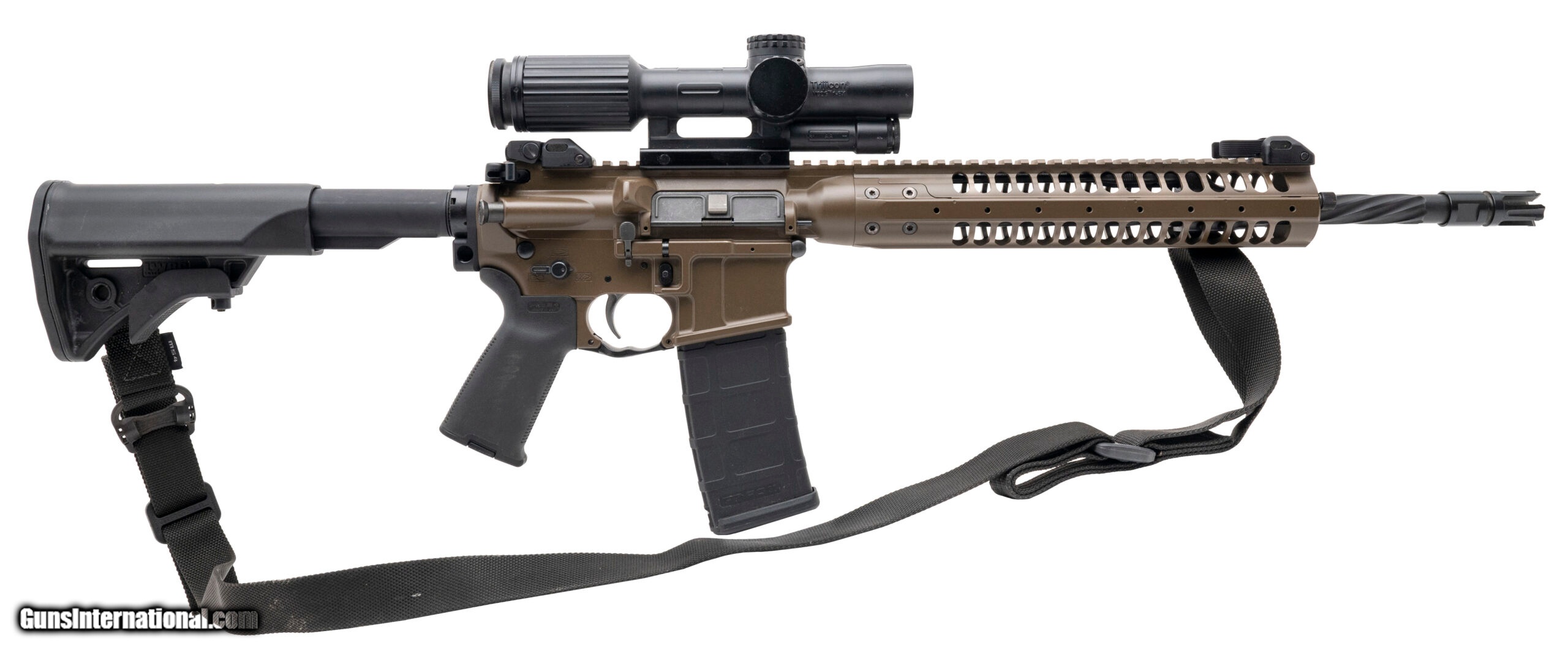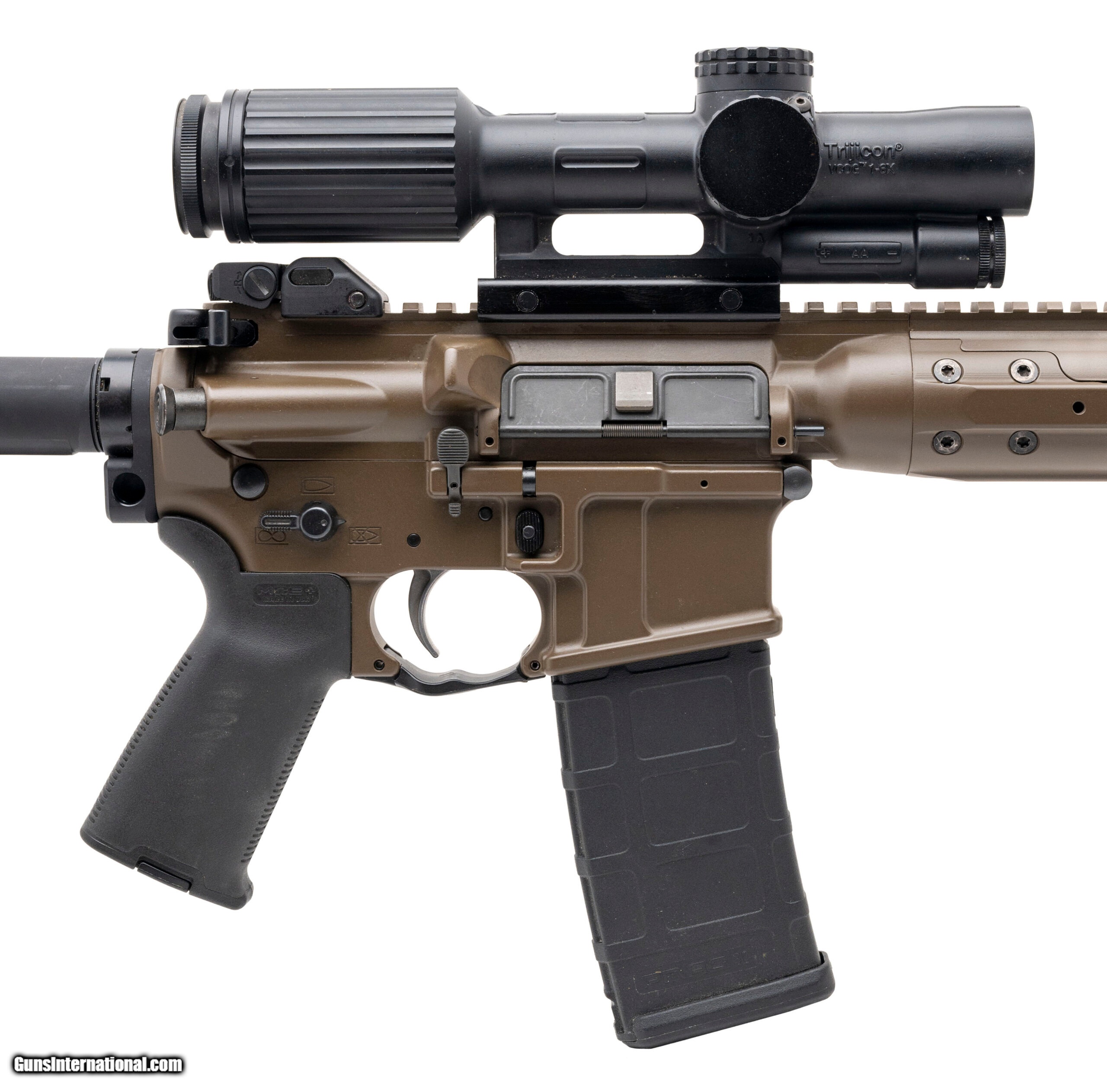 Description: "SN: 03-75877. Modern production, 5.56 NATO. 16.1"" Fluted Barrel with Flash Hider. Bore is in excellent condition. Semi-auto piston driven tactical rifle with full ambidextrous action and Trijicon VCOG optic. Patriot Brown cerakote finish and 4 Position Stock are in very good condition. Overall condition is very good. Comes equipped with sling. SOLD |