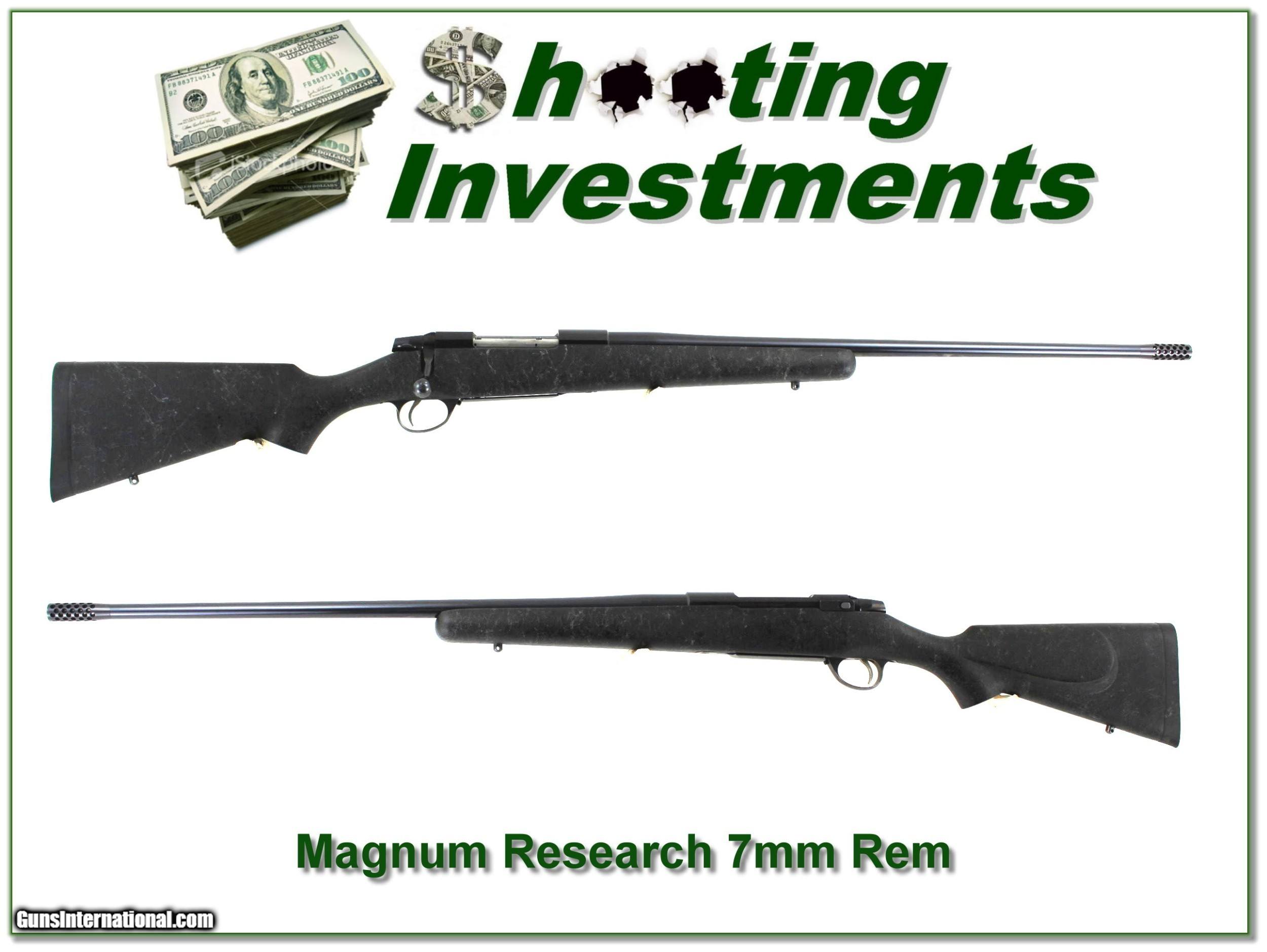 Description: This is a high-end rifle made by Magnum Research. It is a 7mm Remington Magnum Mountain Eagle. It was made on a Sako AV action and has a high-end HS Precision stock. The barrel is 26in including the muzzle break. It is in excellent condition and will make a very nice hunting gun! I am selling this one on consignment and as such lay-a-way can’t be used. It does of course have the standard 3-day inspection. Shipping and insurance is $49. Please email me with any questions or larger pictures. (Consign your quality firearms with Shooting Investments for only 12%! Let me know if you have any you would like to sell!) 22-0963 Payment: Payment is by Money Order, Cashiers Check or Personal Check. I can now also accept Credit Cards (MasterCard, Visa, Discover & American Express) with a 3% convenience fee. Shipping: The shipping charge will be listed in each description. It is $49 for most long guns. Some heavy guns, over 48in boxes or those insured for over $2000 will be higher. Shipments to Alaska and Hawaii are higher because air shipment is required. Most firearms are shipped on Tuesday and Thursday and usually in 5 days of receipt of payment. We package all shipments carefully and insure them. Optics are shipped Priority Mail and most other non-firearm shipments are shipped First Class. Returns: Our return policy is simple. If for any reason you are not pleased with your purchase, you may return your item for a full refund of purchase price. Ammunition cannot be returned. It is important to us that you are happy. Guns cannot be fired or dissembled before returning them and they must be returned in the same condition as received. Notification of a return must occur with-in 3 days of receipt at your dealer. Shipping, convenience and dealer fees are not refundable and are the responsibility of the buyer. Lay-a-way: If needed, we offer a 60 day lay-a-way option on most firearms. It is 1/3 now, 1/3 in 30 days and 1/3 in 60 days. Lay-a-way firearm sales are final and if not completed the first payment cannot be returned. Consigning your firearms with Shooting Investments: We will help you get top dollar for your firearms. While most local guns shops charge 20% or more, our fee is only 12% with a minimum of $75. At your local gun shop it might take months to sell. Selling on-line provides instant access to thousands of interested buyers. You won’t find any other on-line dealer willing to sell your firearms for only 12% or listing every gun on 3 separate s. Selling through an House typically costs the seller 15% and the buyer an addition 15% (so 30%) and you have to wait several months to sell and longer to receive funds. If properly priced, we will sell your firearms in a few weeks. Send us an email or give us a call and we’ll explain how easy it is for you to get top dollar. Trading: Trading for use is really just buying your gun to re-sell. If you have a gun you want to trade, please email a picture and we will let you know what we can give or it. You will always get more if we sell it for you on consignment. Help for California Buyers: We are happy to ship to California. It is the buyer’s responsibility to make sure any item you buy is legal in your state. We are also happy to help with your purchase of a firearm from someone other than us. If you see a gun you would like to buy but the seller can’t or won’t ship to California they can ship to use and we’ll then ship it to your California dealer. The cost for this service is only $30 + shipping. Let us know if we can help! SOLD |