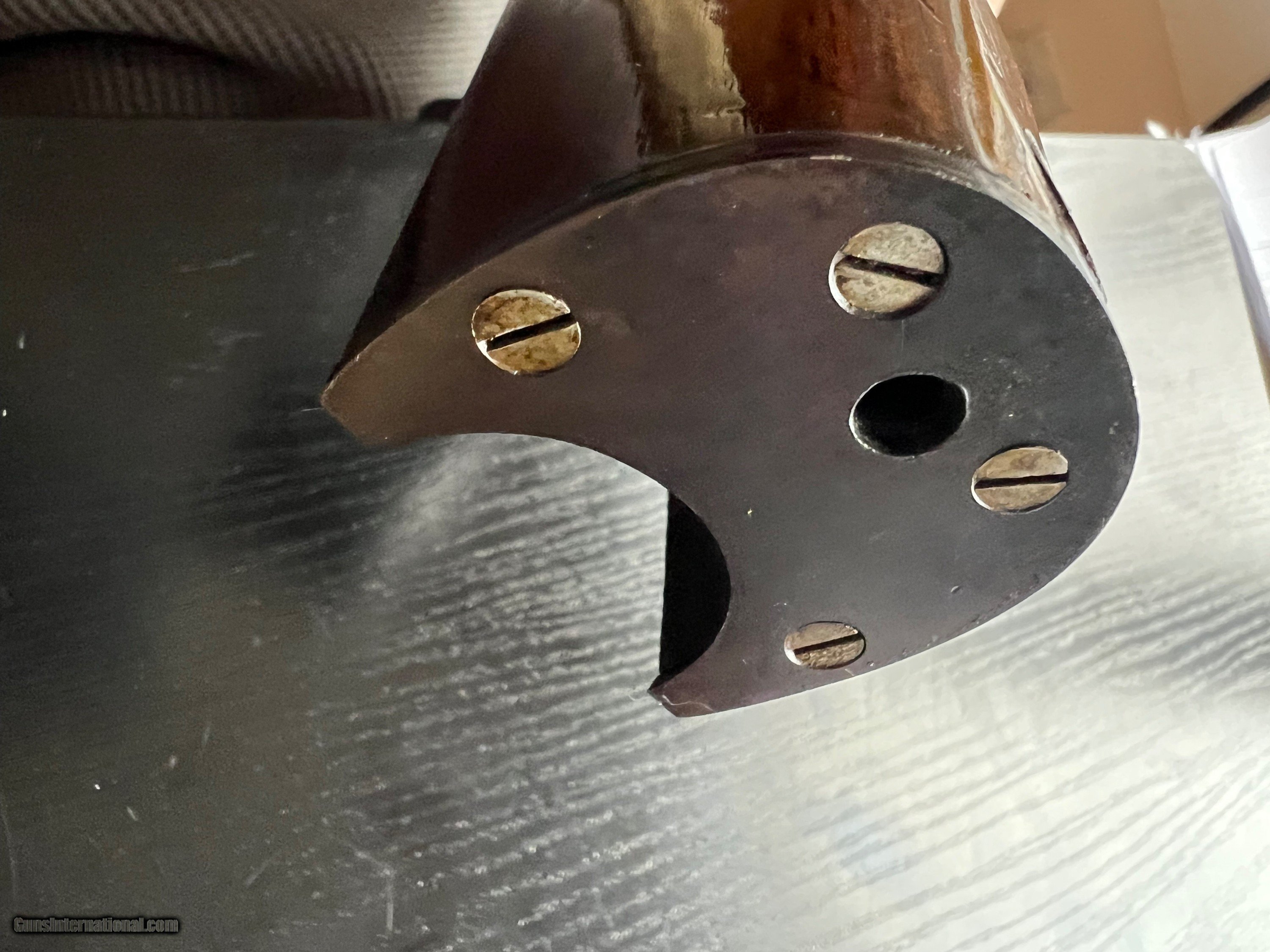 Description: Reduced: $4750 This is a superb Mannlicher M1905 in 9x56 caliber as converted to a takedown configuration by Daniel Fraser of Edinboro Scotland in 1910-1912 timeframe. Fraser was known for its high quality conversions and this is the only known example of a Stutzen 20 inch barrel rifle takedown conversion. It is highly unusual to find a Stutzen takedown as the rifle is already short with a 20 inch barrel in its original configuration. The conversion was accomplished by adding threads to the barrel and the receiver and having the front part of the stock held by a cross pin and removable once the cross pin is drifted out. The gun has spectacular high quality figured wood and beautiful rust blue with practically no wear. It had been scoped at one time as evidenced by 4 tapped holes on the left receiver wall that are currently filled with appropriate size screws. A side mount scope mount can be added to the rifle if desired. Bore is in excellent shape as well. This is a one of a kind takedown example from a renowned Scottish gunmaker. 3-day inspection. FFL or C&R(where legal) $75 insured shipping in CONUS Layaway available SOLD Curio/Relic: Yes |