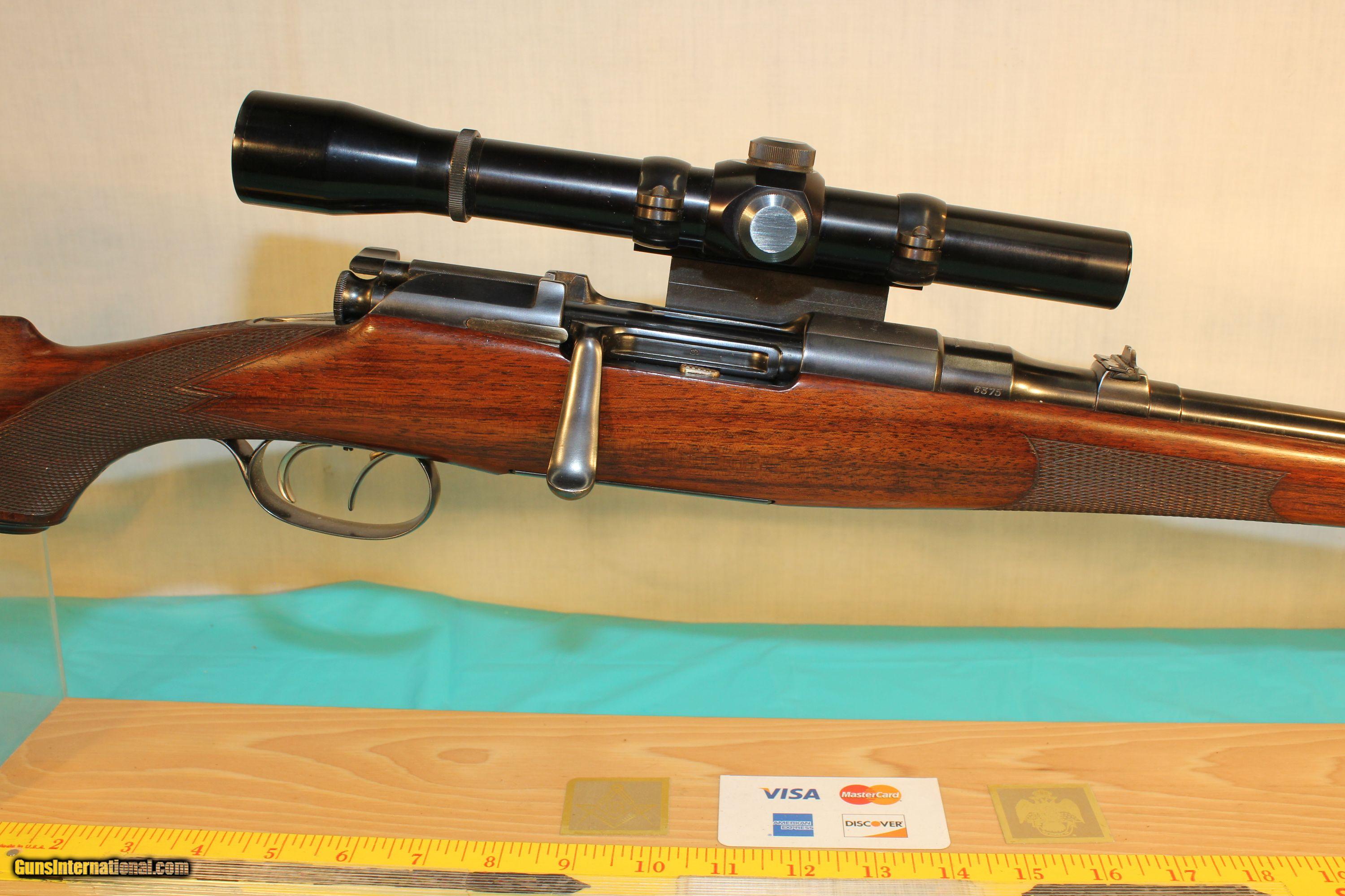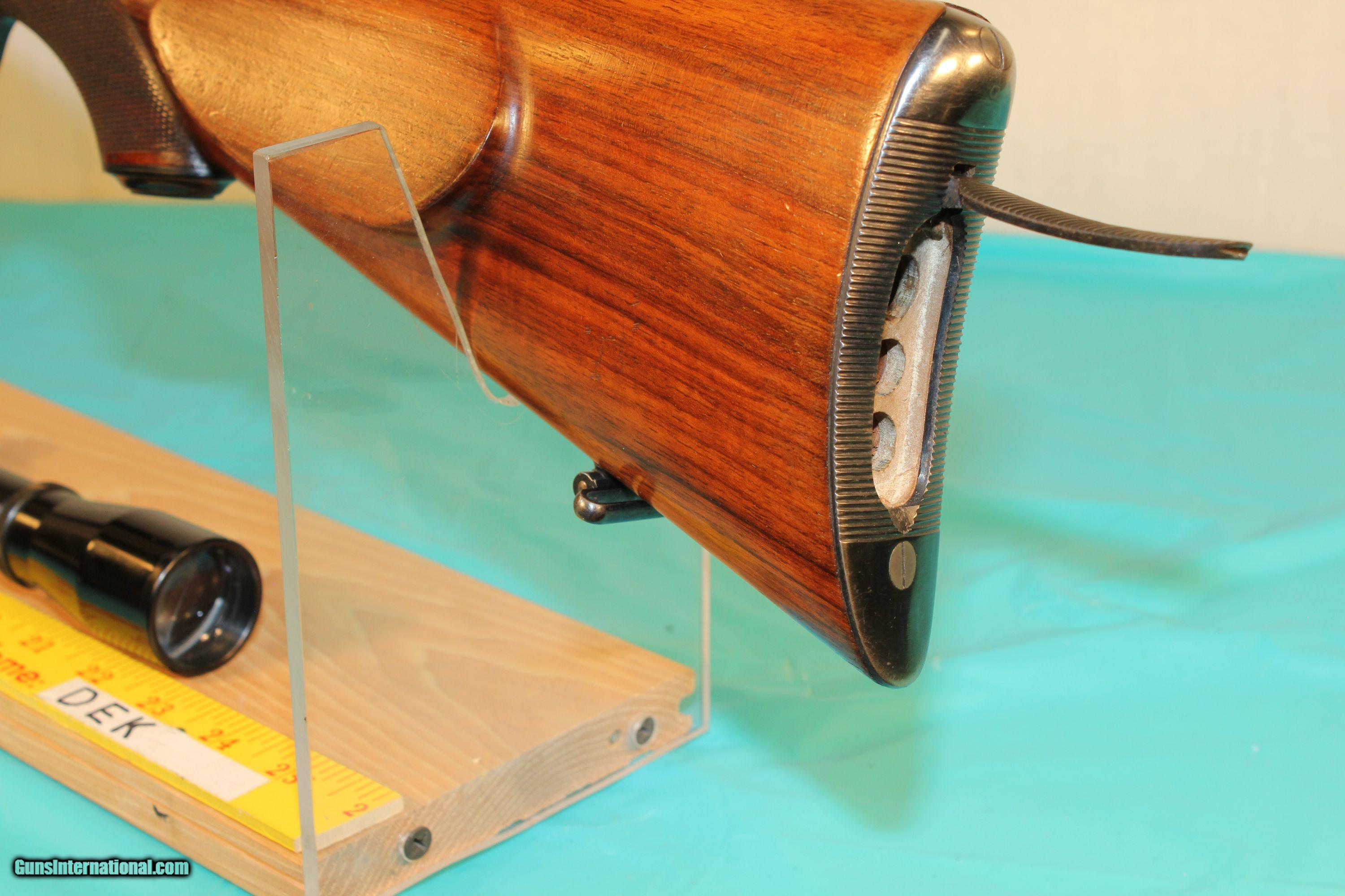 Description: Mannlicher-Schoanauer full stock 1903 Carbine in 6.5 x 54 MS caliber. The barrel is 18 inches and the bore is as new, The rifle weighs seven pounds and 10 ounces with the scope mounted. The scope is a Lyman All American 3x with post and cross hair reticle and is mounted by a Griffin & Howe detachable side mount. It is mounted high enough so the iron sights can be used when the scope is in place. The scope is released by two leavers and will return to zero when replaced. The fixed open sights are 100 meters and a folding leaf for 200 meters. Overall condition is about 95%. Double set triggers with shotgun trigger guard. The trigger plate has all of the case colors. Trap in butt plate. You will look a long time to find another M-S in this condition. FFL required. Shipping and insurance is $40.00 C&R Accepted SOLD Curio/Relic: Yes |
