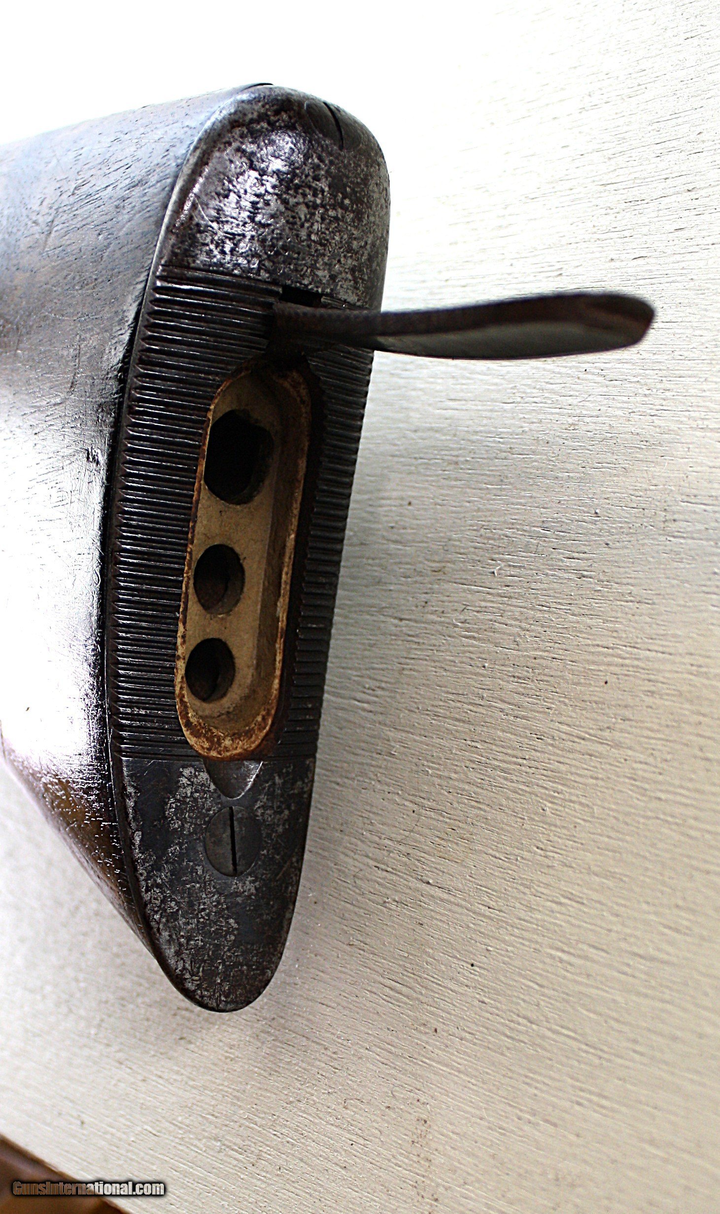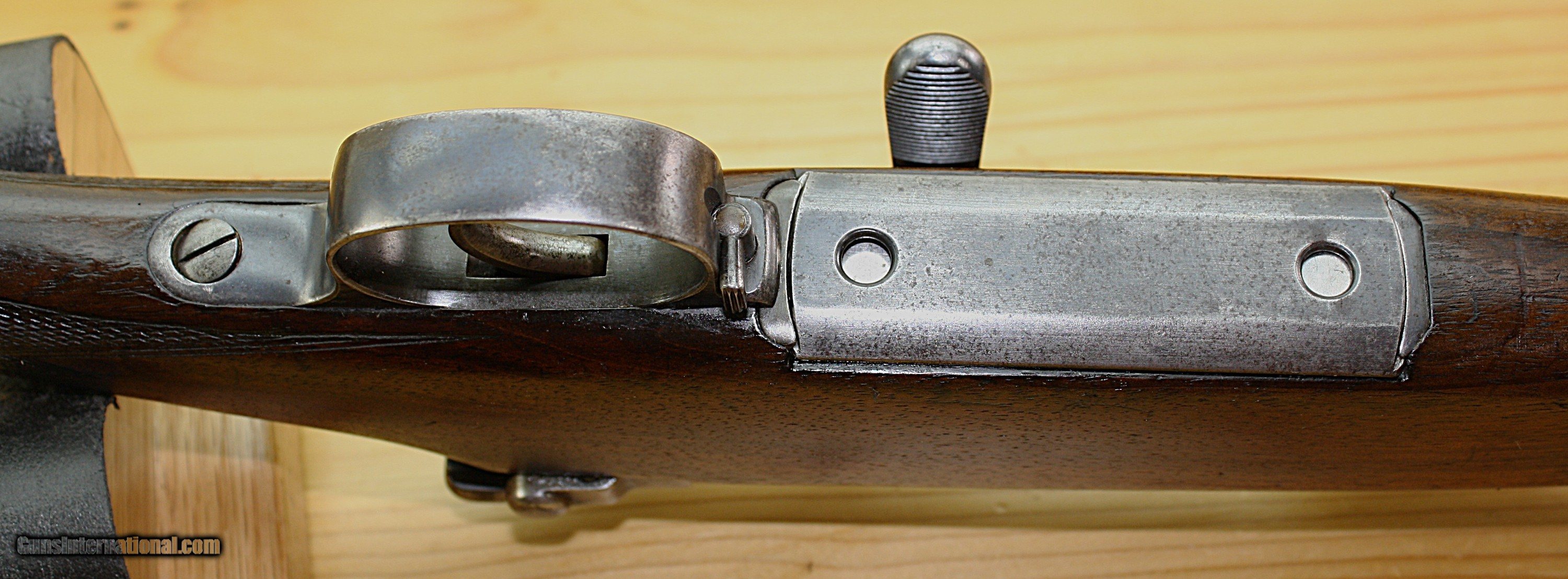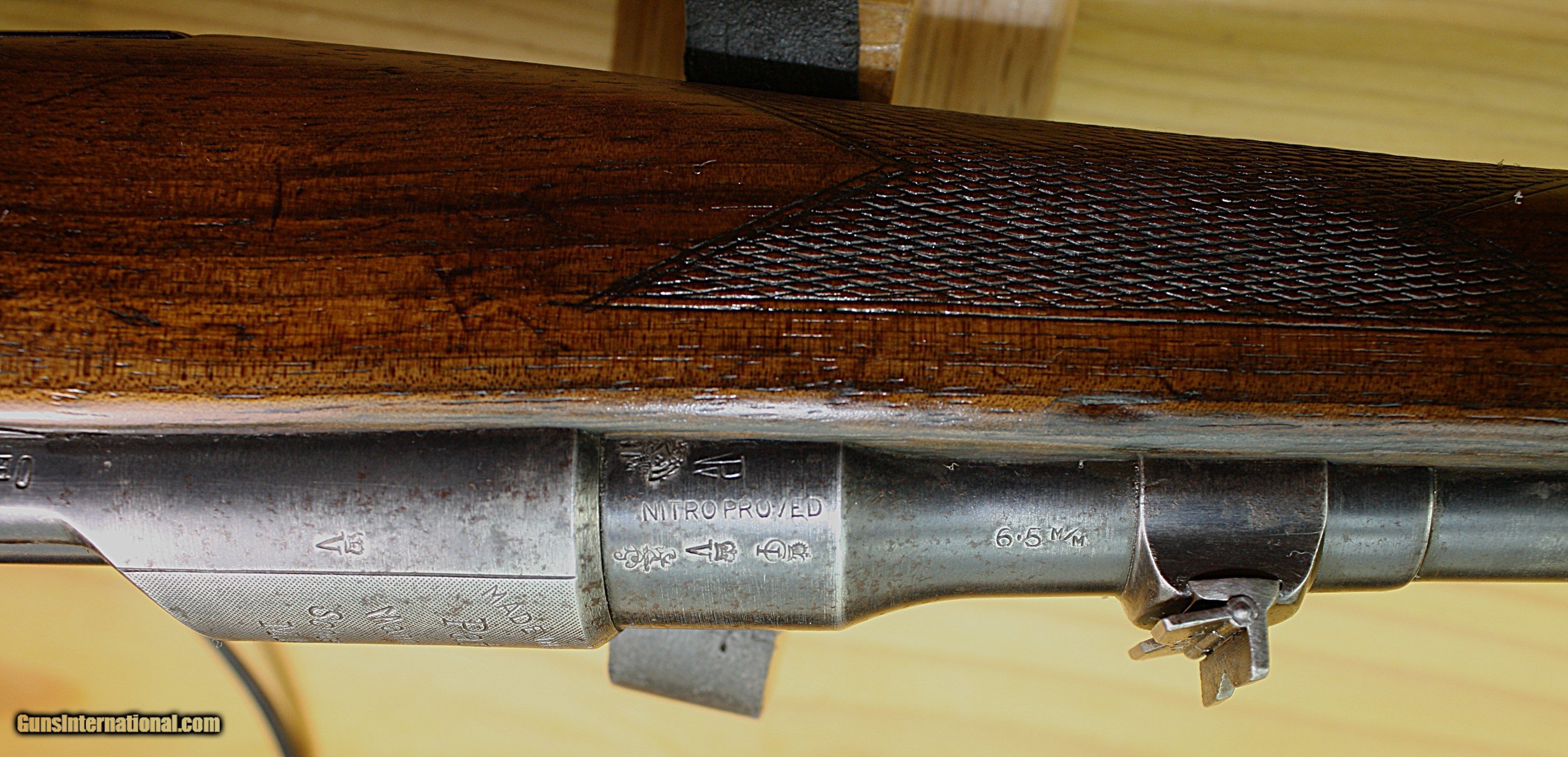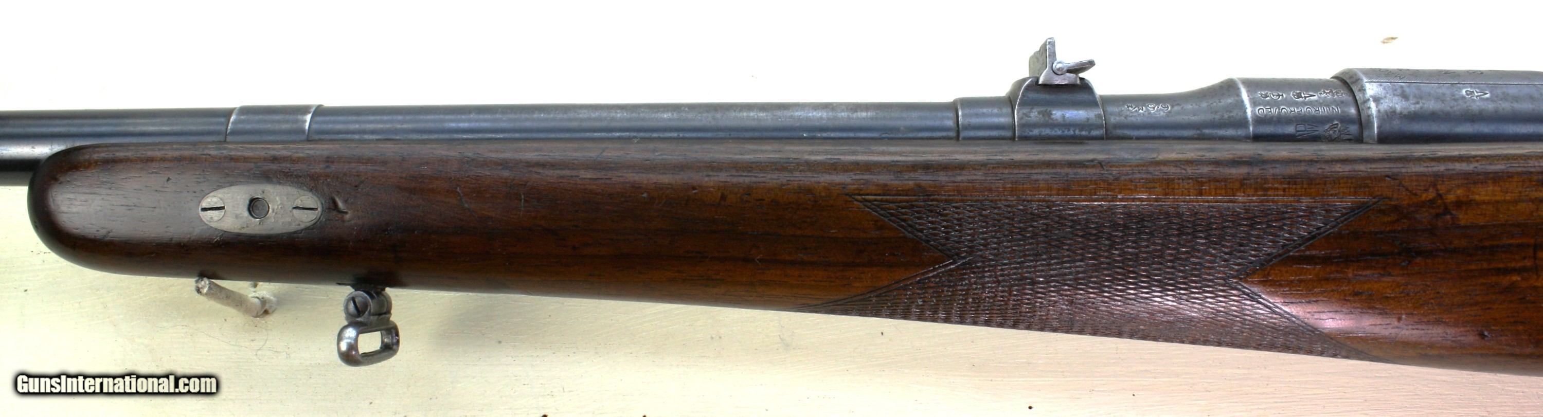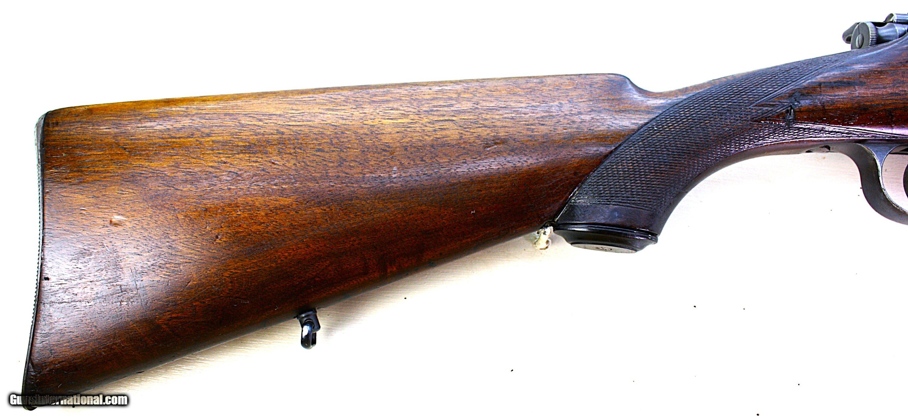 Description: This is a Mannlicher-Schoenauer model 1903 bolt action rifle in caliber 6.5x54 Mauser. It is the takedown model. The screw in the forearm to take the rifle down is not original. It has been replaced with a hex head screw using the original threads. The rifle comes with an allen wrench to remove the screw. There are two other screws shown in a picture which can be used in place of the hex head screw if you choose. The rifle has a cheekpiece and a trapdoor in the butt. The grip cap can also be removed to carry an extra front sight. The front and rear sights are original. The rear has one standing leaf and one folding marked 300. The pistol grip and checkered wood is good and the floor plate a gray patina. All the other screws are in excellent condition. There is some blueing wear at the muzzle. The action is smooth and the trigger is crisp. The rifle has cling swivels. The bore is fair with high lands and the grooves are darker. The bluing overall is about 80-85%. Packing, insurance and shipping is $50. Curio/Relic: Yes Rifle Caliber: 6.5x54mm Mannlicher-Schoenauer Manufacturer: Mannlicher Schoenauer Model: 1903 Barrel Length: 22 Condition: VG Metal Condition: VG Wood Condition: good Bore Condition: Fair Triggers: single LOP: 14.5 Weight: 7 lbs. Sights: open Price: $1,600.00 Shipping: $50.00 Buy Now Contact Seller |