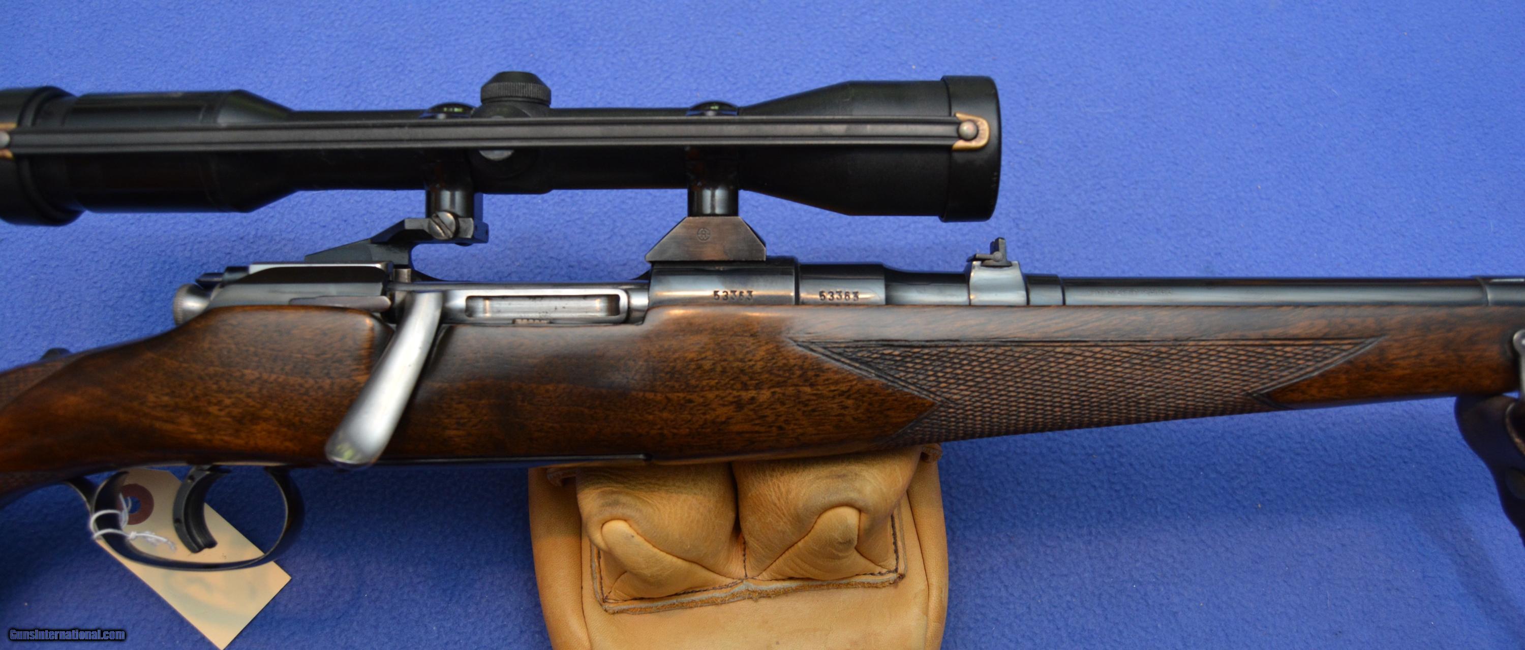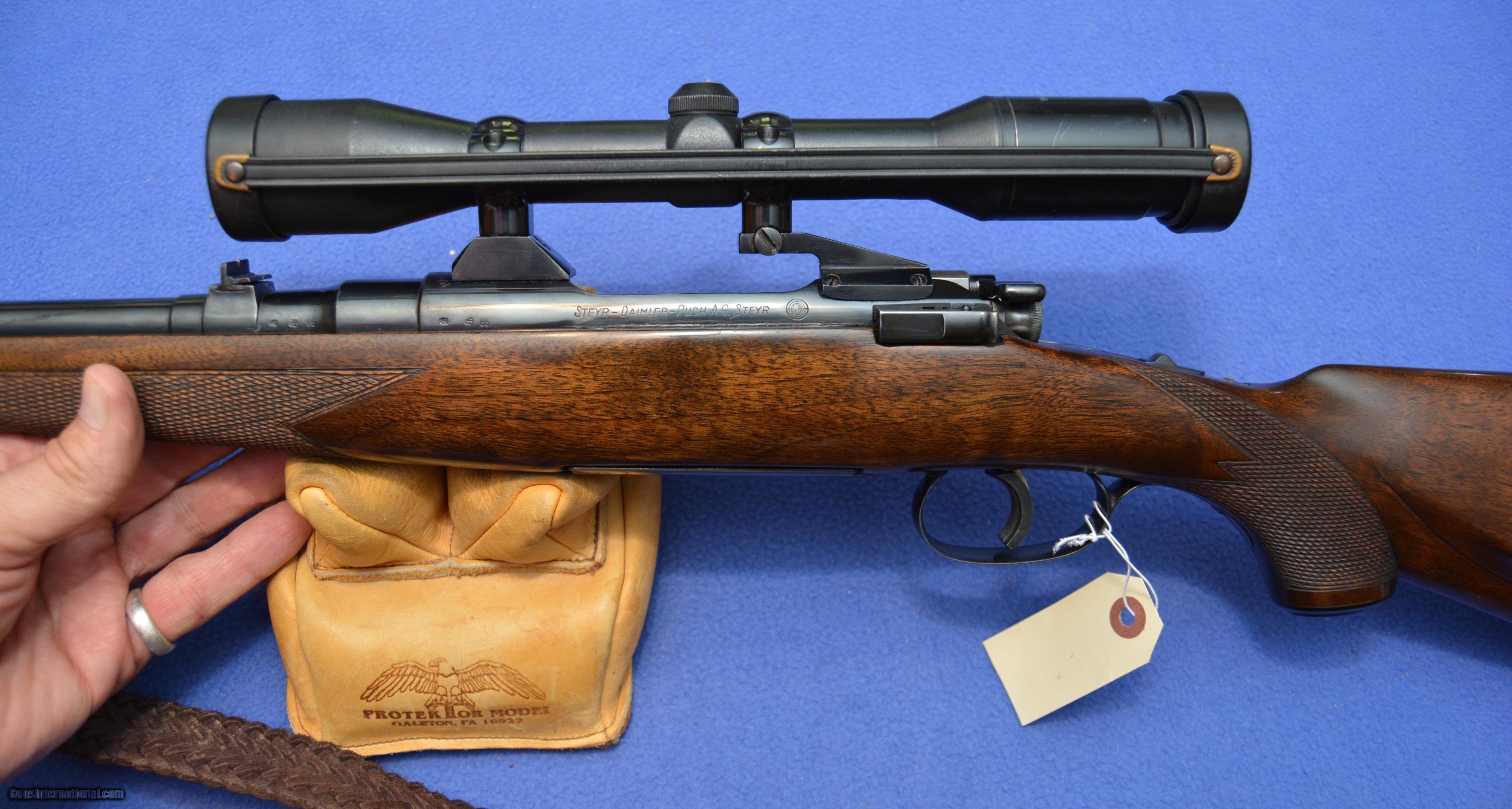 Description: MANNLICHER SCHOENAUER 1961MCA CARBINE 270 WINCHESTER Consigned to Treys Clays Inc is this wonderful Mannlicher Schoenauer Model 1961 MCA in .270 Winchester. The rifle bears serial # 53363. This rifle was purchased for the present owner as a gift in 1967 by his father in law while assigned to duties in Austria. It has no importer marks and the receiver has not had any additional holes drilled for scope mounting. The barrel is 19-inches if measured from the face of the receiver or 21-inches depending upon how you measure. The barrel retains the original factory express Single trigger is crisp and the bolt operation, like all the rifles of this era is butter silk smooth. The removable rotary magazine is obviously the work of the highest qualified machinist and is machined specific for each caliber. The rifle is fitted with a Swarovski Optic 6x36 Nova scope in Redfield base. Bore is perfect and rifle is a consistent sub inch to 1-inch grouping rifle. Sling is included and the recoil pad is a Pachmayer Old English style. The full length stock has a length of pull of 13 ½ to 13 3/5 inches. The wood is near flawless. Shipping will be $26.00 USPS Priority Mail if east of the Mississippi River, West will be $32.00, West Coast states $42.00. Alaska and Hawaii will need a quote. If illegal to own in your area don’t bid. Payment with US Funds from US Banks ONLY!!! We accept Cash, Checks, Money Order and US Postal Money Orders. We also accept Visa, MasterCard and Discover at 2.8% service fee. All items ship when payment clears, no exceptions. We do not accept PayPal or American Express. We also have a lay away plan. Call 865-805-1187 for details or questions. Out of state buyers no sales tax yet. Local buyers must pay TN sales tax and $10.00 TBI state back ground check fee. Please encourage your congressman and senator to vote against an internet sales tax and instead encourage local shops to hire persons to post on the web. I’ve done both! SOLD Manufacturer: Steyr Model: 1961 MCA Serial Number: 53363 Caliber Info: 270 Winchester Condition: 98% Plus Metal Condition: 98% Wood Condition: 98% Bore Condition: Excellent plus Barrels: 20-inch Action: Bolt Triggers: Single LOP: 13 1/2 Manufacture Date: 1961 |