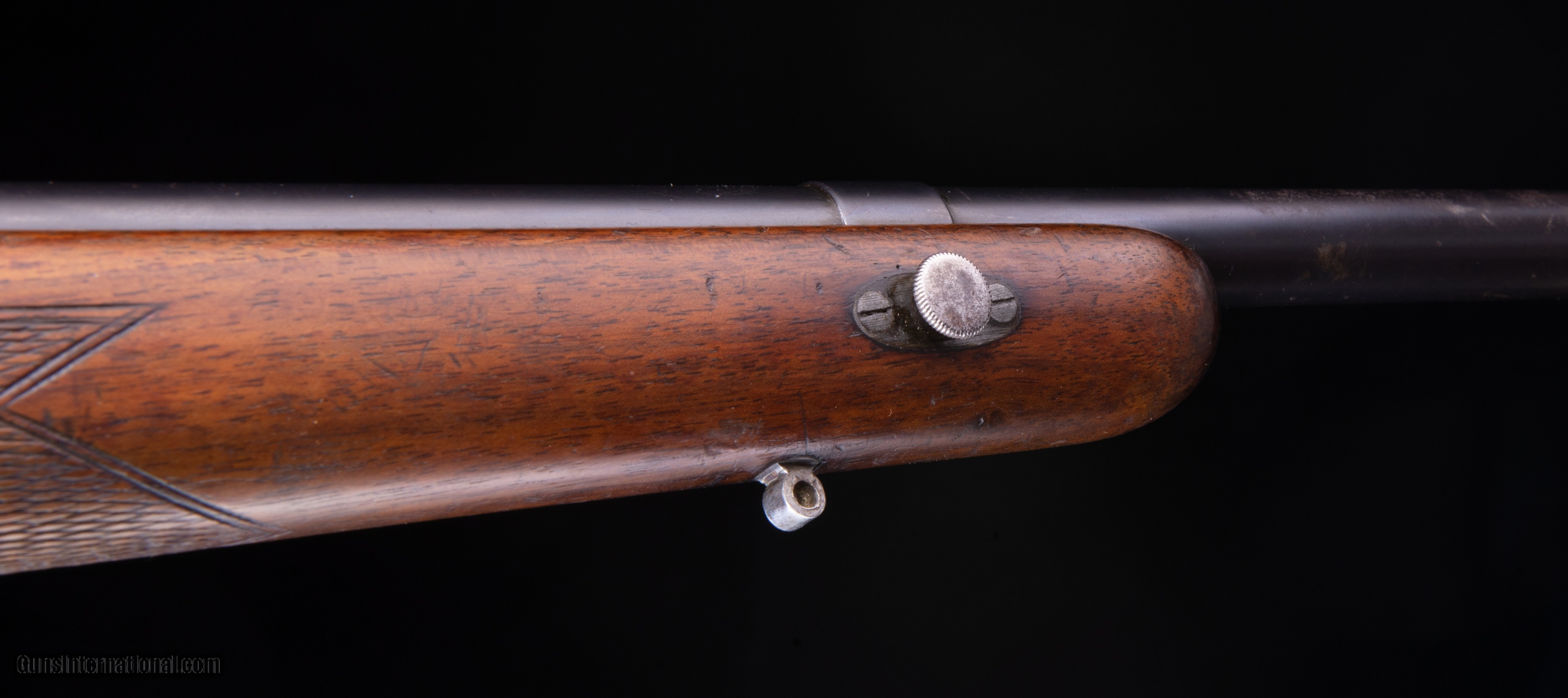 Description: Drillings, Double Rifles, and Rifles - A very nice little rifle with an excellent bore *** Note: To see this gun with high resolution photos and a zoom-in feature, go to the vintagedoubles main site and search for the gun ID: 4620 or browse the main site to see our full gun collection. SOLD Manufacturer: Mannlicher-Schoenauer by Steyr ~ Model 1910 with a very nice bore and recessed peep site ~ Also a quick take apart! Model: Model 1910 Serial Number: 7827 Caliber Info: 6.5x54MS Ejectors: Yes Barrels: 22 Barrel Type: Steel Action: Bolt Action Gauge Info: Caliber Stock Comb: NA Stock Heel: NA Stock Cast: NA LOP: 13 5/8" to meta Weight: 7 lbs. 1 oz. Choke Left: NA Choke Right: NA Proof:Nitro: 6.5x54MS Minimum Wall Thickness Left: NA Minimum Wall Thickness Right: NA |