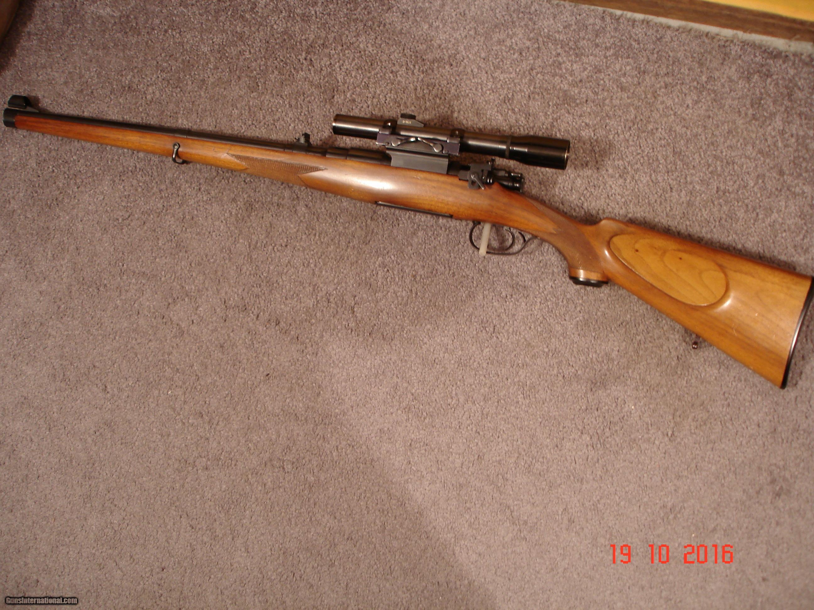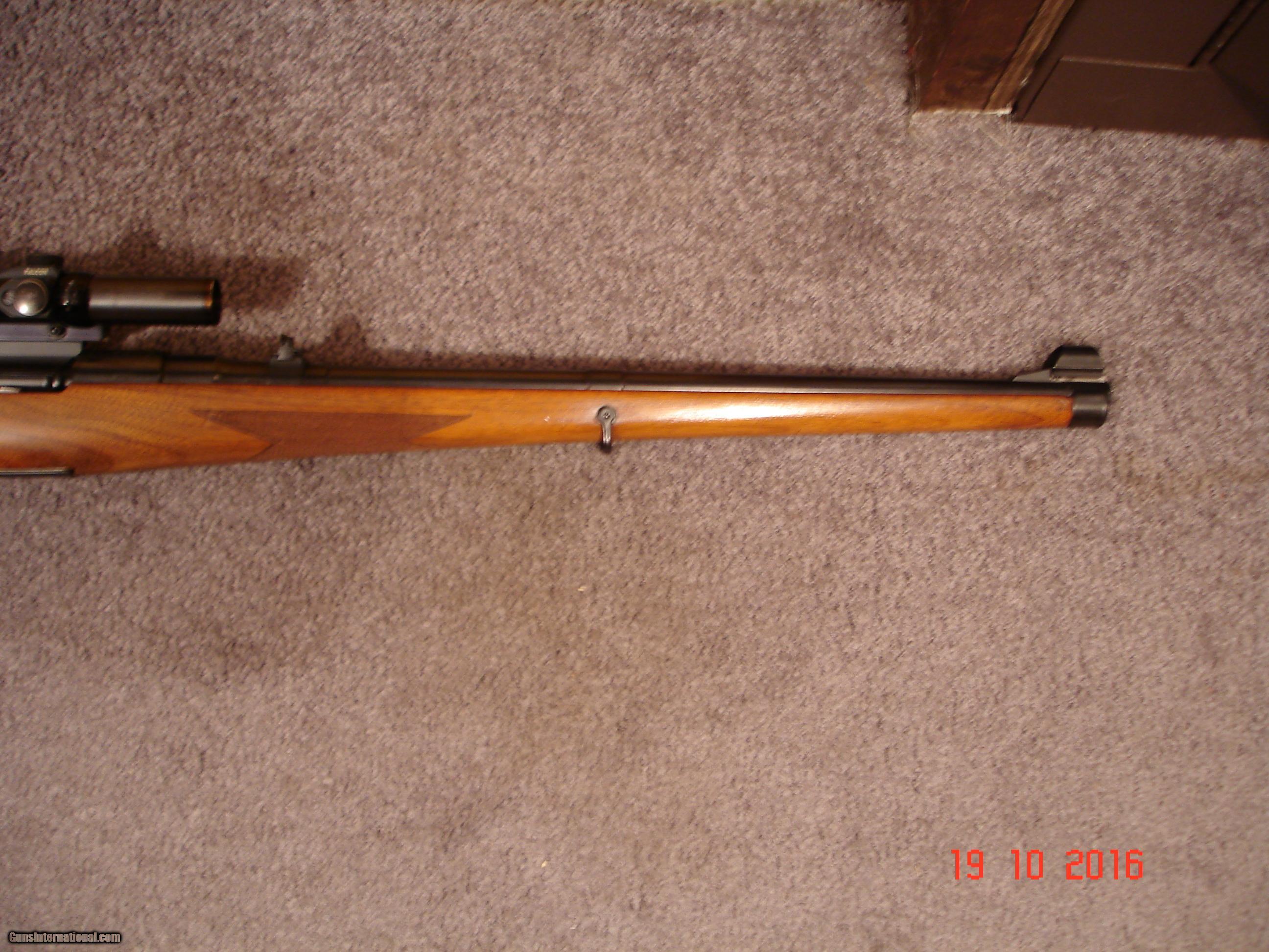 Description: Out of my long time collecting I have for sale a wonderful Model 1950 Mannlicher Scoenauer Carbine in the seldom seen .257Roberts Caliber. MFG in 1951 and Special Orderd from Stoger Arms. 20" BBl. with a mirror bore. With a very Rare, Lyman #36 Swinging Peep sight fitted to the bolt release. Griffin & Howe Detachable Mounts & Rings with a Vintage Unertl Falcon 2 3/4X Scope Which is clear and in Excellent Condition. Hooded front sight 3 Leaf folding sight. Single adjustable trigger LOP is 13" to Original black Butt plate. O/A Length 40 1/2" Weight is 8Lbs.2.5oz. What a Beautiful Rifle made back when Quality and Craftsmanship was the order of the day. I really hate to let this one go. SER#.3784 MFG by Steyr. Excellent All original Condition. Shipping & Insurance in a Hard Case is $45.00 to your FFL. Ask about our Free Layaway's! SOLD Curio/Relic: Yes |