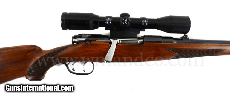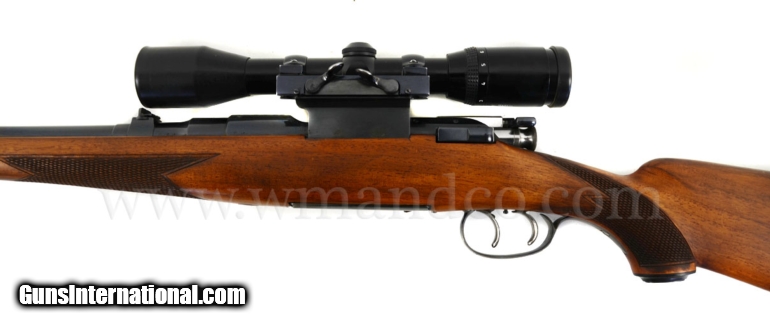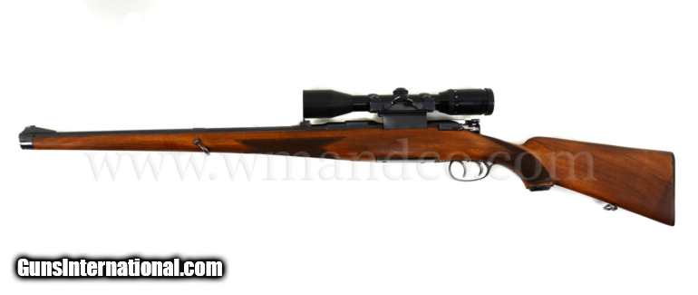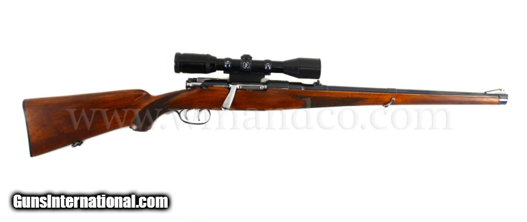Description: Mannlicher Schoenauer MC Carbine 30-06 Griffin Side Mount, Zeiss Diavari 3-9 The action is clean, good blue throughout, ultra smooth with double set trigger that functions well, the barrel is 20" with a near perfect bore, one standing one folded rear, ramp front. The stock is in good shape with strong chequering and finish, light handling marks, 14" LOP. The scope is a Zeiss Diavari C 3-9 X 36, that is clear, Griffin & Howe mount done at Griffin. 8lbs 7oz 0352361 $1350.00 SOLD |