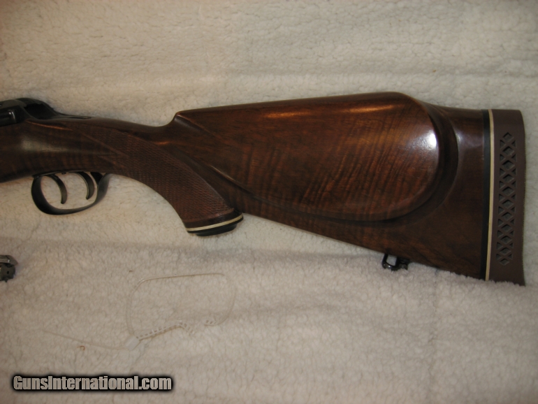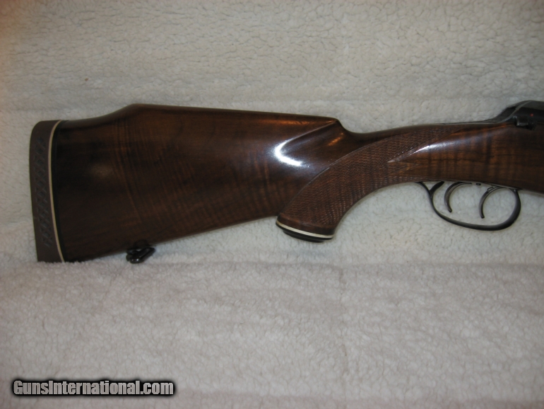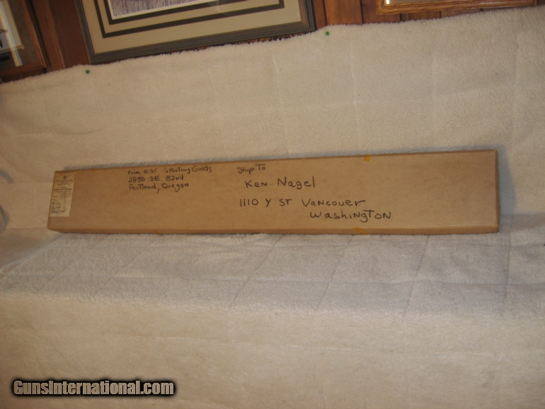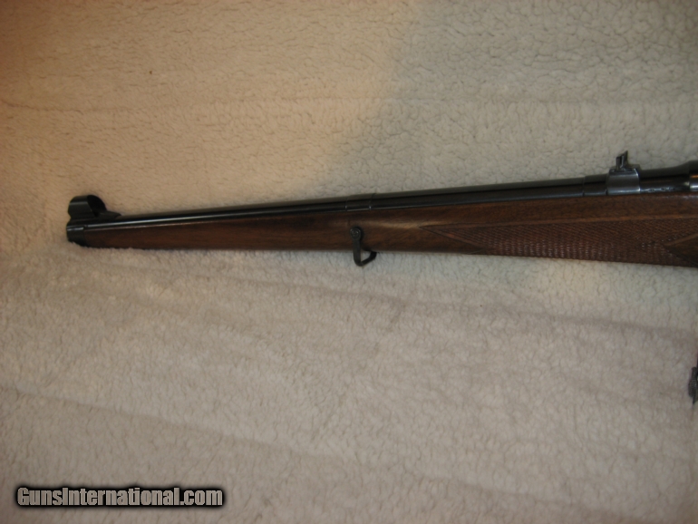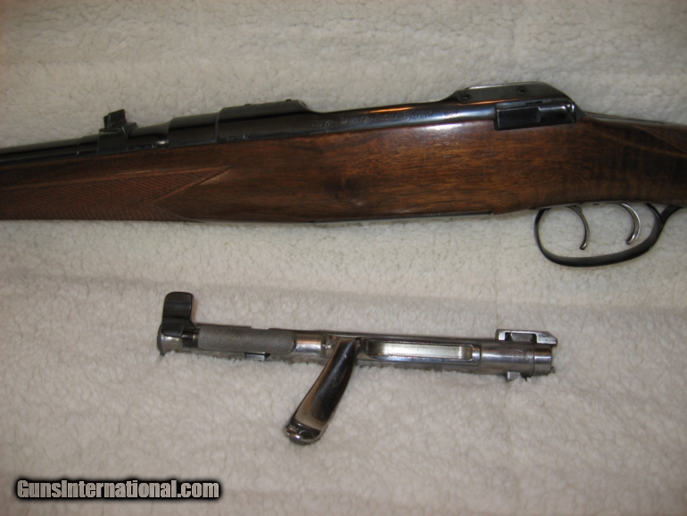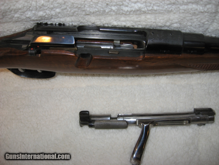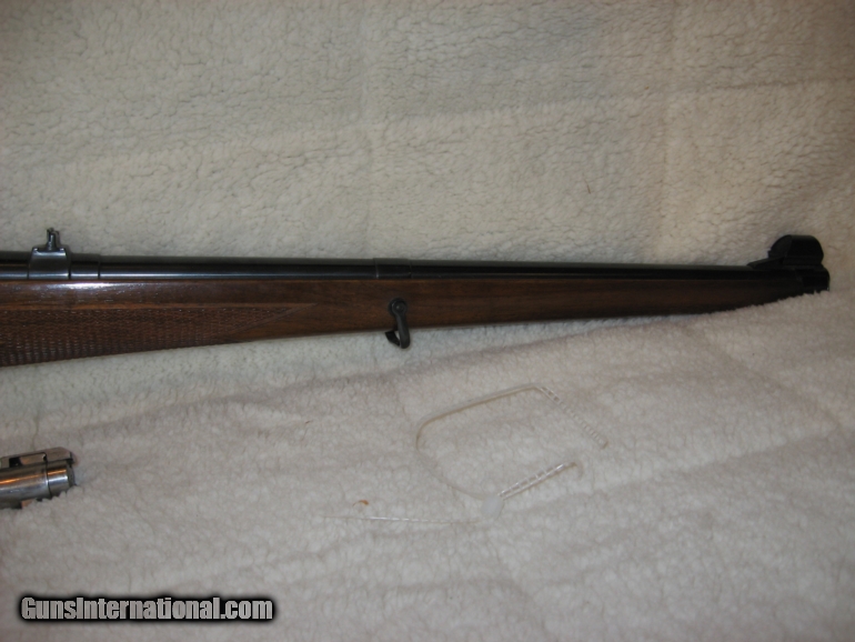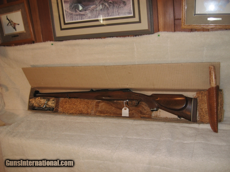 Description: Mannlicher Schoenauer Model MCA. 30-06 Carbine. Double set triggers, 20 inch barrel. Proof marked 1962. Checkered Walnut stock with capped pistol grip. Drilled and tapped for Redfield Jr. Bases. Adjustable Folding leaf rear sight with hooded front blade. It has been fired but very little. Original owner. SOLD |