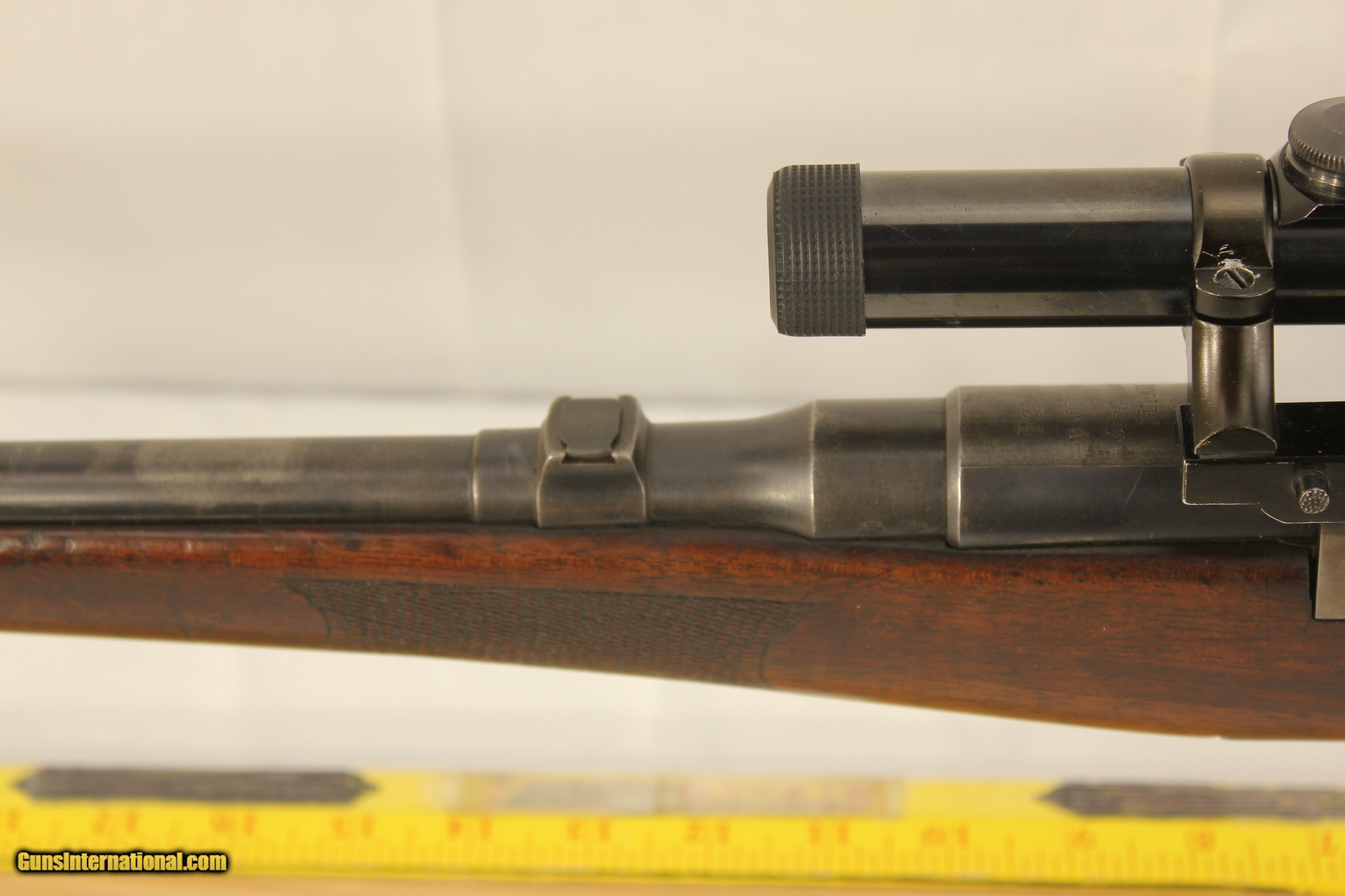 Description: This is not a safe queen carbine, but a gun that is ready to hunt. This is the same caliber that W. D. M. Bell took several hundred elephant with in the early 1900's. if you can shoot like Bell this gun will kill anything that walks. It is the carbine model with an 18 inch barrel, double set triggers, trap door steel butt plate and is fitted with a Paul Jeager, quick detachable scope mount. It comes with a vinage Weaver 2.5X scope with a post reticle. It also has a Lyman peep sight that pivots to pass the bolt when it is operated. These guns sold for over $200.00 when a Winchester Model 70 was bringing $65.00. It has a rotary 5 round magazine. These are among the smoothest operating bolt action rifles you will ever handle. Please use the ZOOM feature to make your evaluation of this classic piece. C&R OK $50.00 shipping via Priority Mail. SOLD Curio/Relic: Yes |