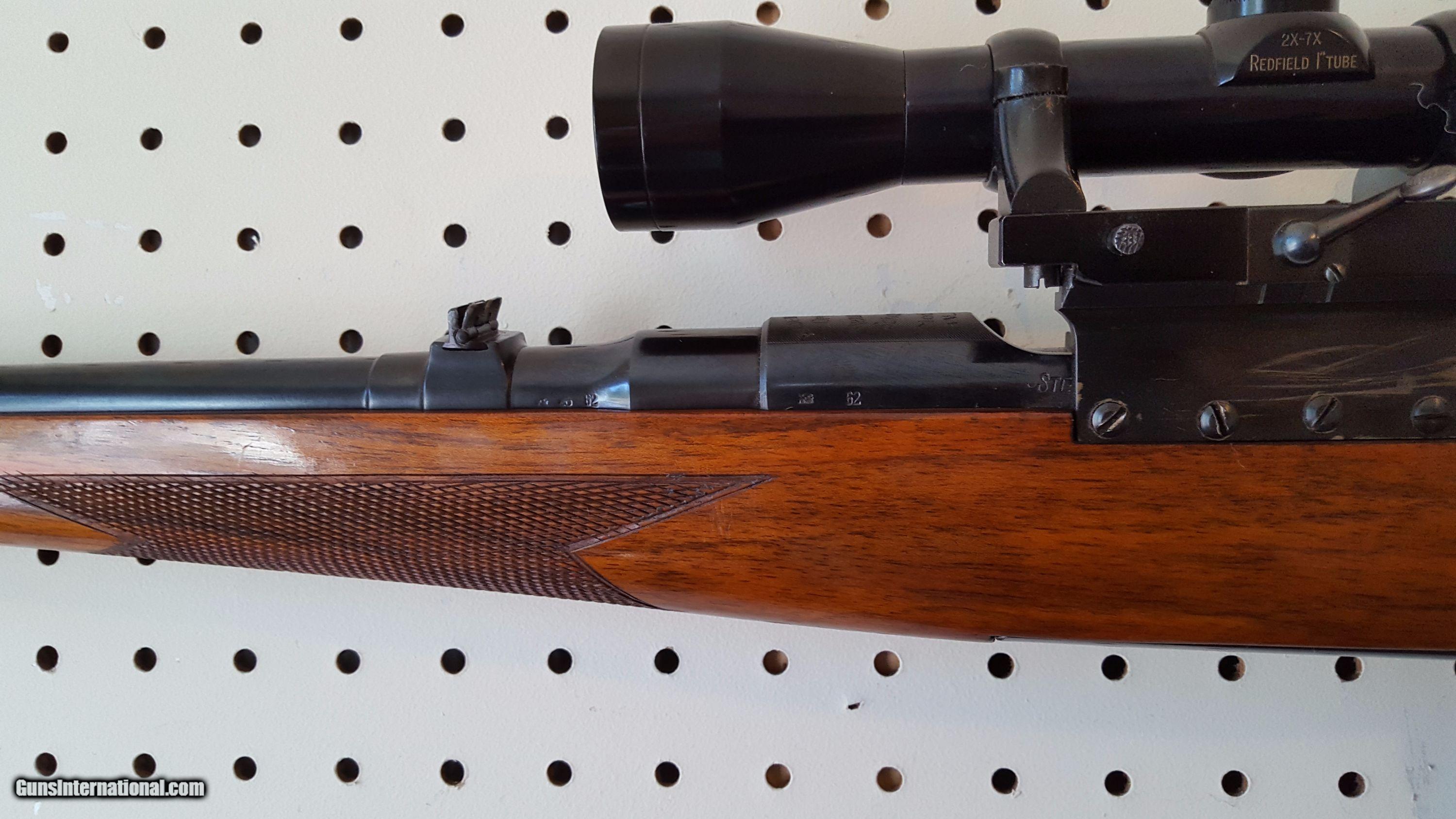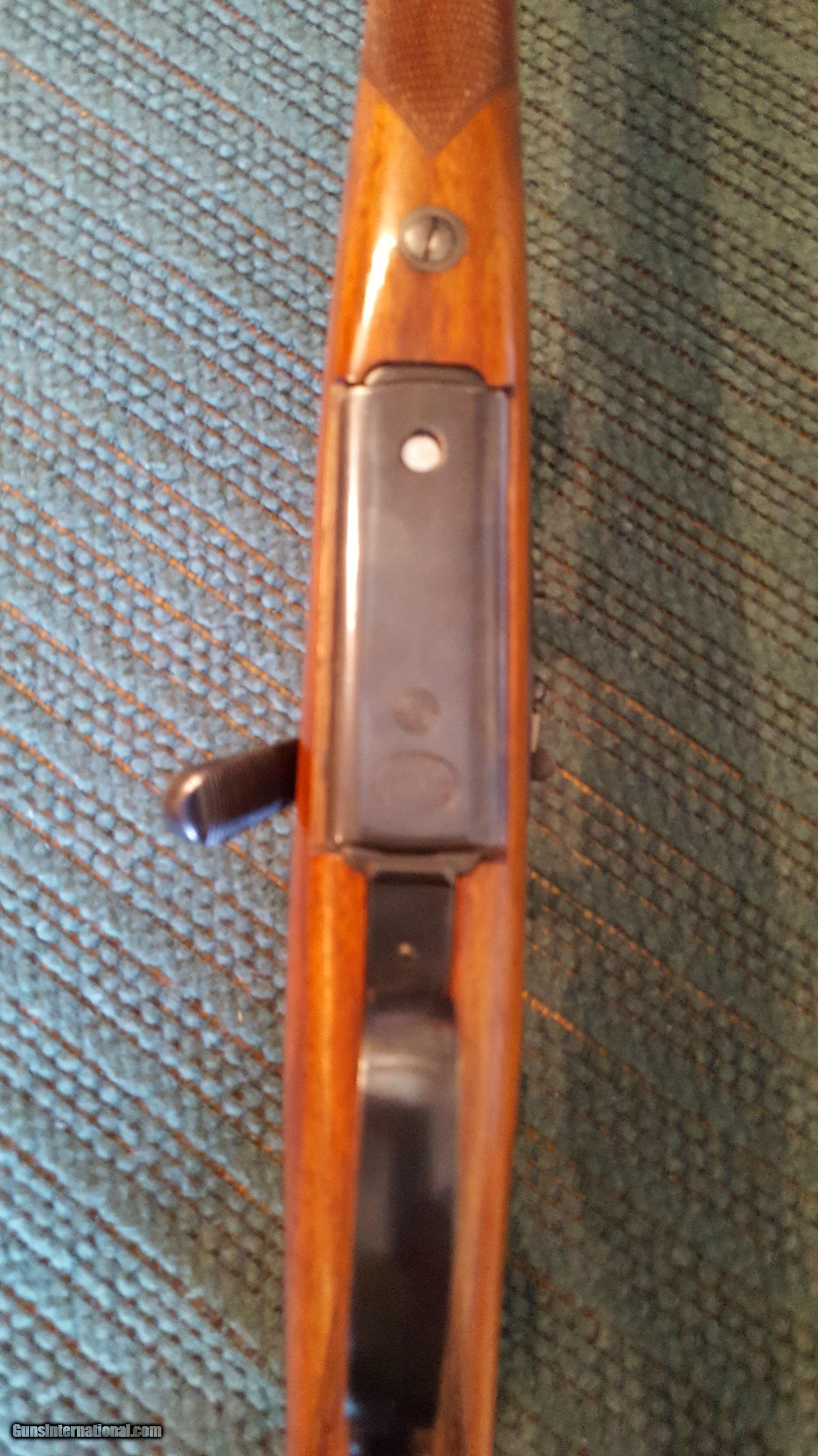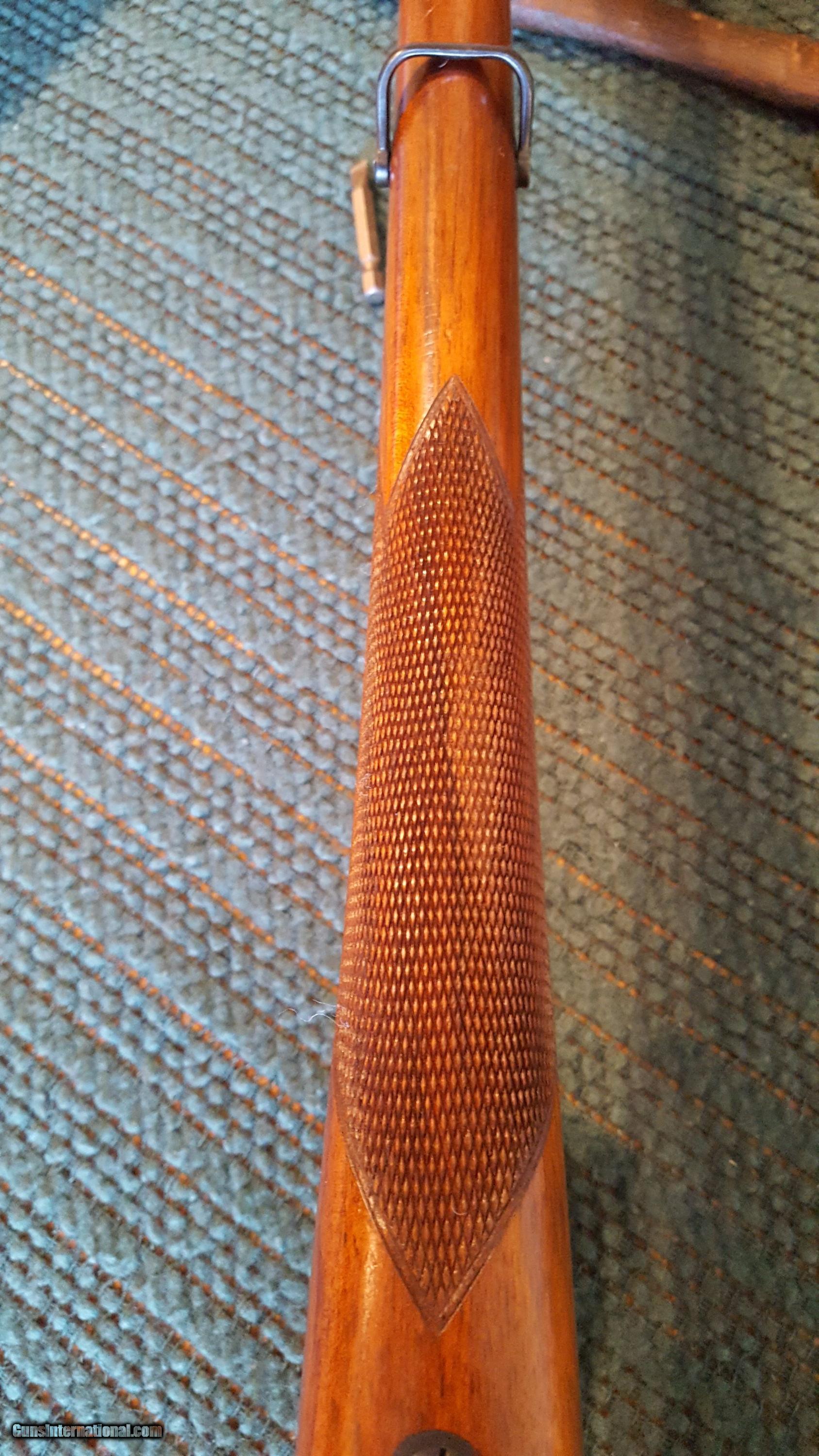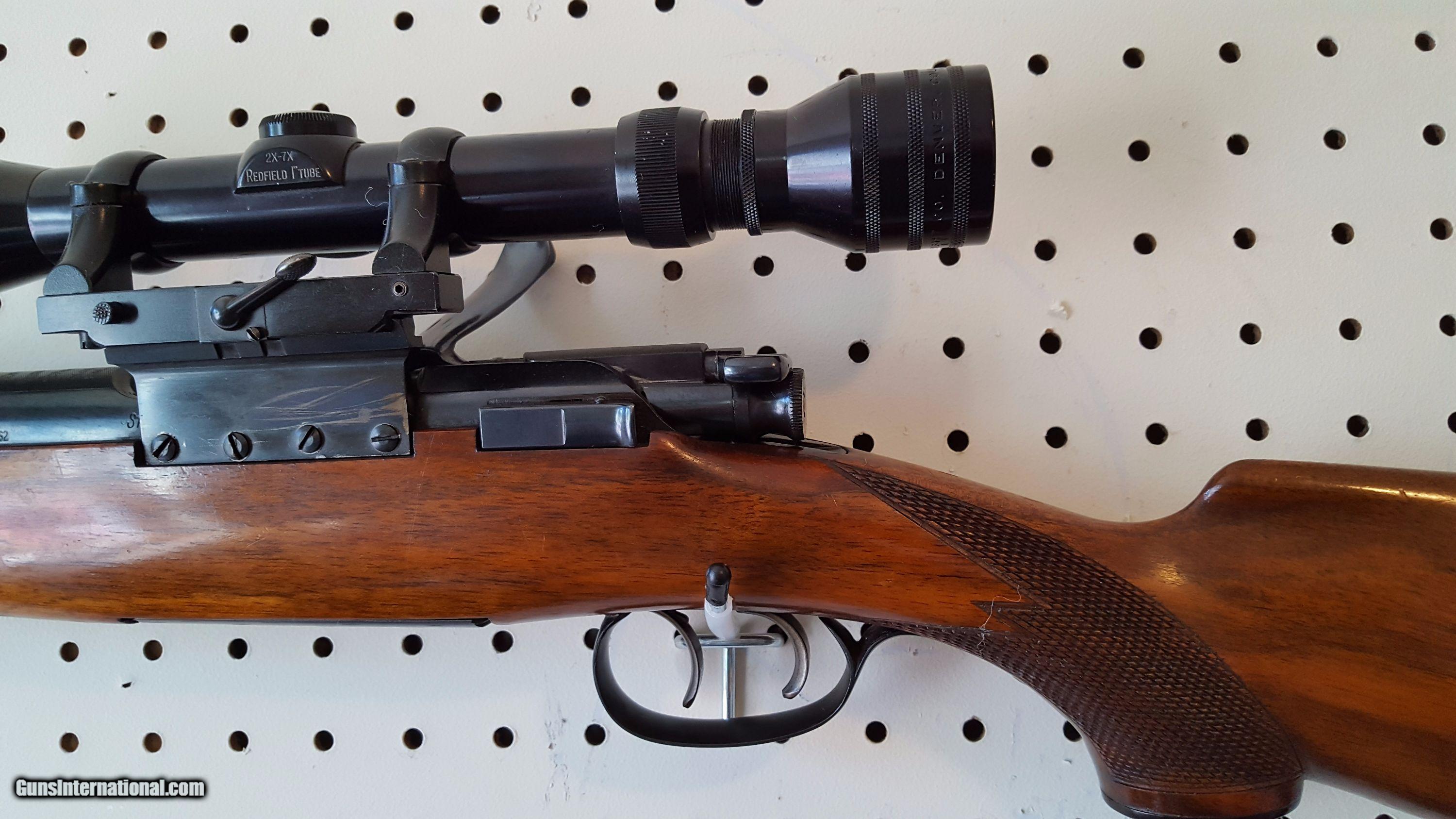 Description: Mannlicher Schoenauer. Model GK. Cal. .308 win. 21" barrel. The GK model was part of the 1950-1952 models. The special GK stock design was available as a special order variant during the post war production run. Features ramped front sight, two leaf folding rear sight, blued finish, butter knife bolt handle, double set triggers, quick detachable Paul Jaeger side mount with a Redfield 2X7 scope. Full length checkered walnut stock is in excellent condition with a straight comb, pistol grip cap and Pachmayr pad. All metal retains 98% blue finish. Fine bore and action. A scarce .308 carbine made in Austria the 1950s. Serial # 38321. SOLD Curio/Relic: Yes |