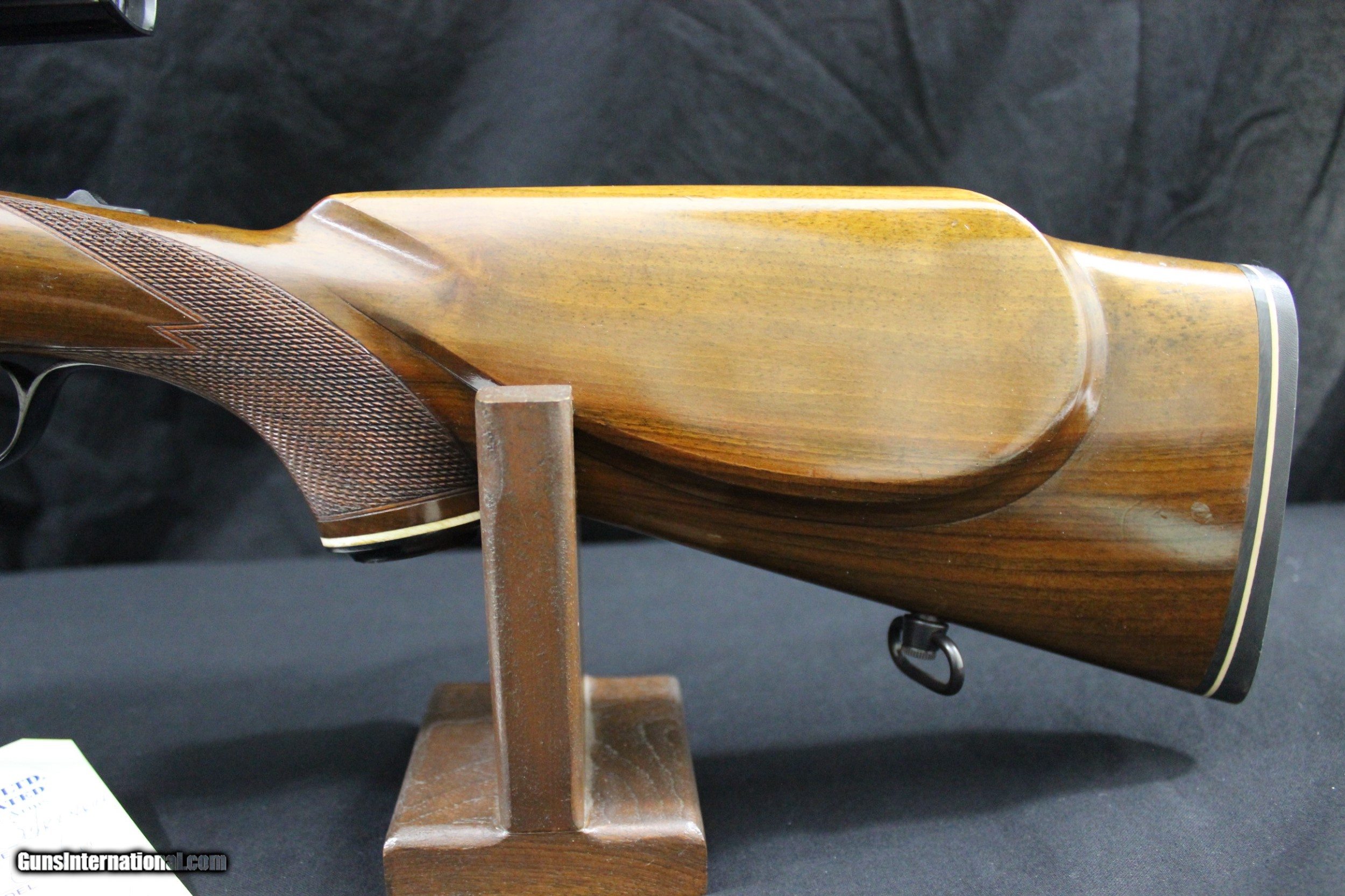Description: 243 caliber, 21" barrel. Blued finish, checkered Mannlicher-style stock with raised cheek rest. Two-leaf rear sight, ramped blade front sight. Mounted with a Weaver K4 scope and sling swivels. Chambering and caliber should be confirmed by a chamber casting prior to shooting. Condition: Very good as refinished. Retains most of the applied blue with some light wear. Markings remain clear. Mechanically functional, fine bore, clear optics. Stock with minimal bumps and dings. SOLD |
