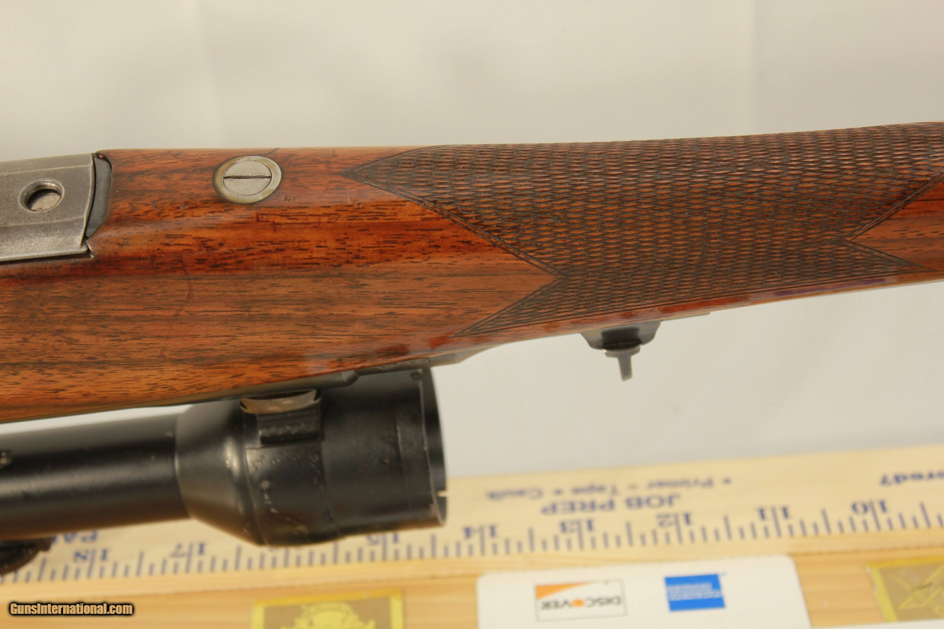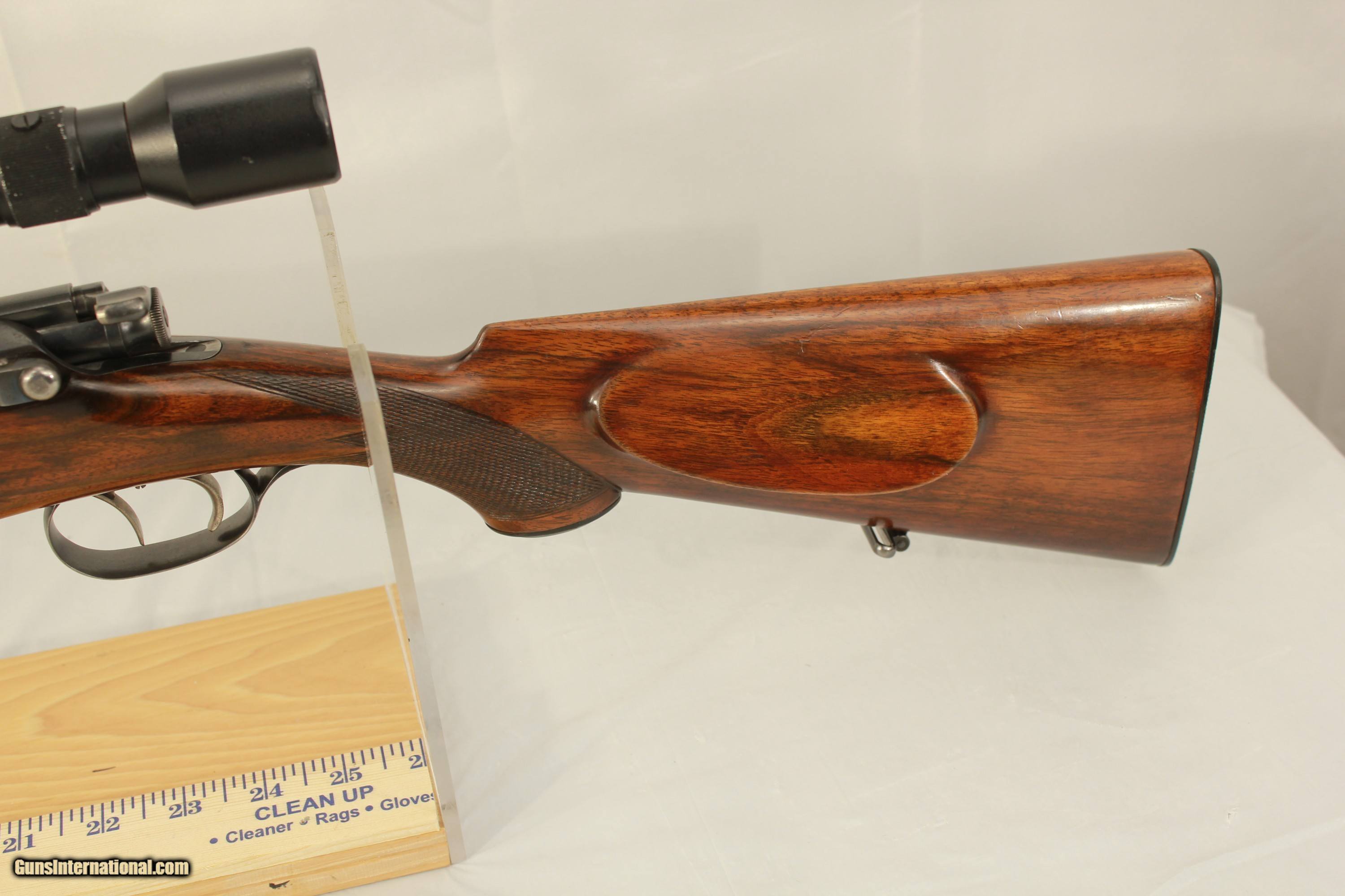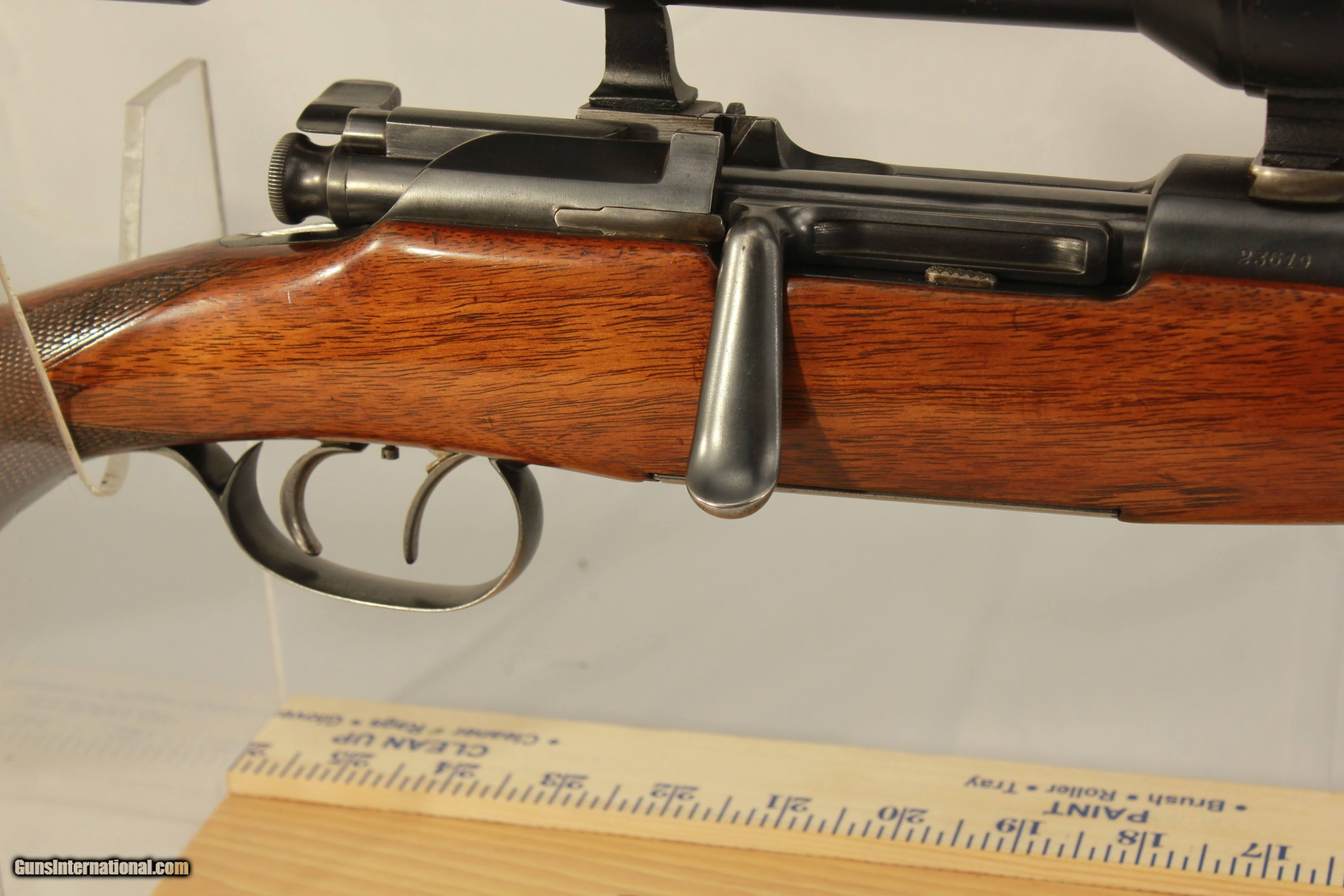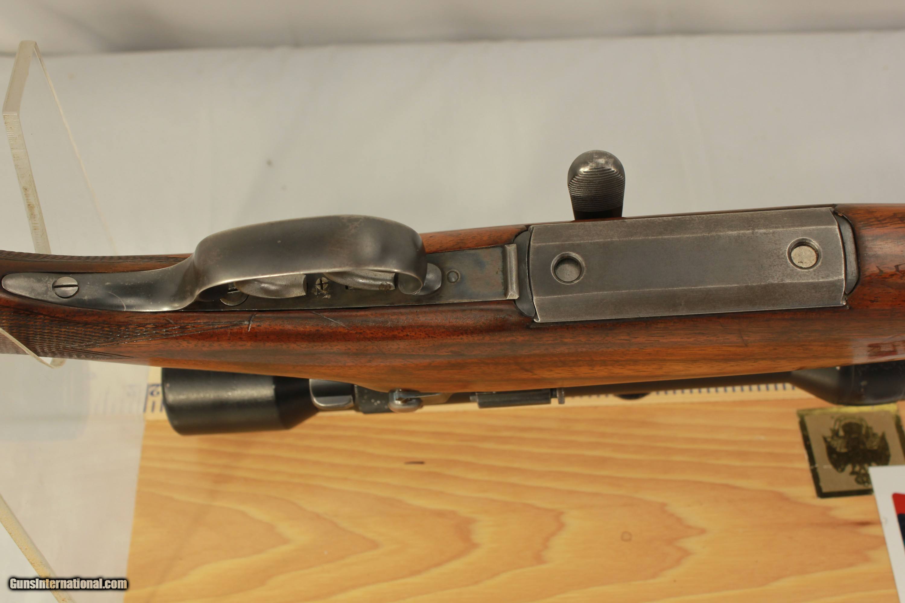 Description: This nice M-S Carbine has been profectionally refinished and is in very good condition. The 18 inch barrel is very good with some darkening and strong rifling. The butt plate a wrist cape are horn. It has wrap around checkering on the forearm. A very nice rifle in a very effective caliber. It has a Noris 4x87 scope with clear optics and the German reticle on a quick detachable mount. It has double set triggers. C&R OK $75.00 shipping via Priority Mail SOLD Curio/Relic: Yes |