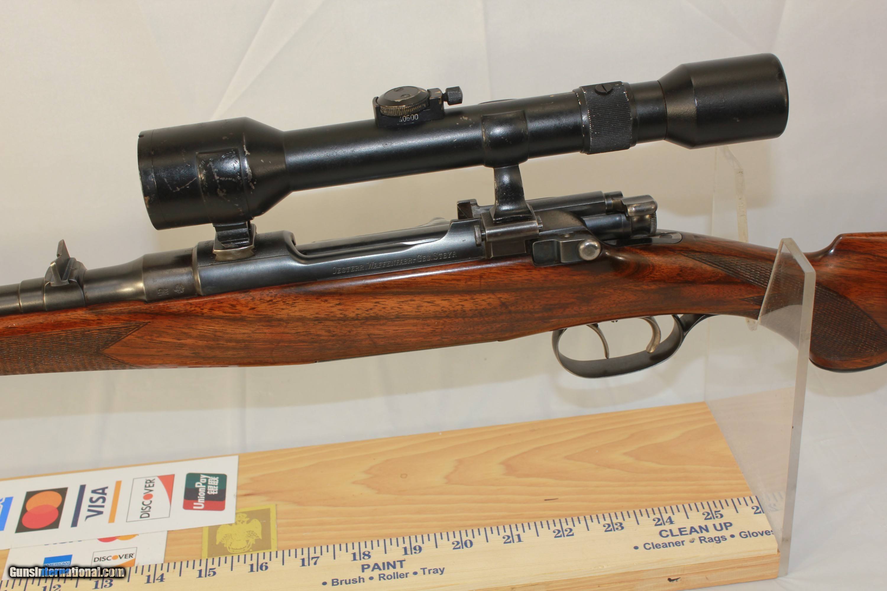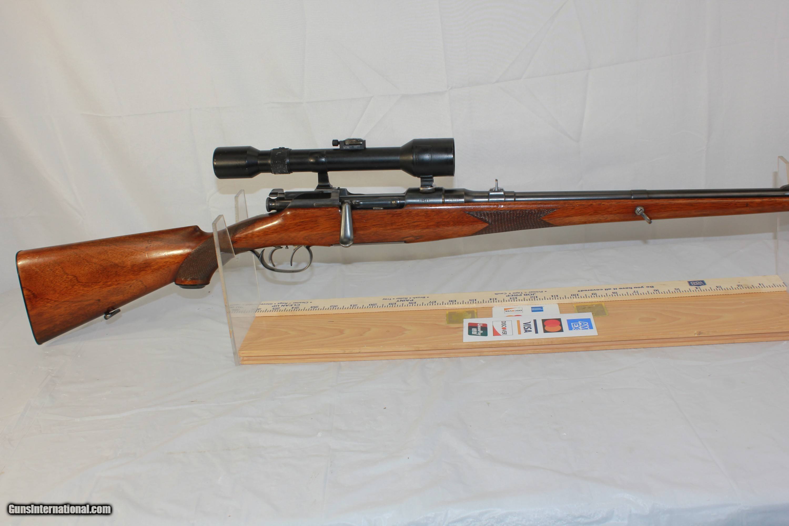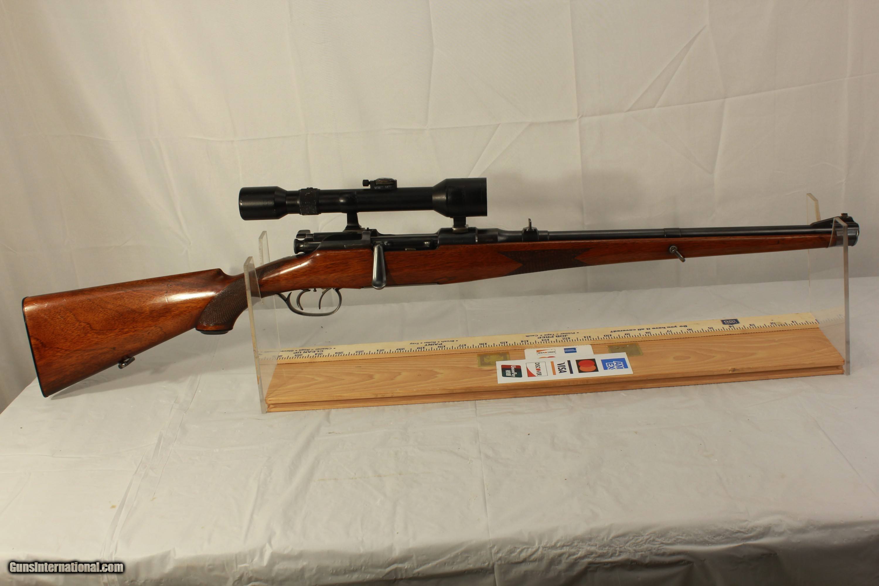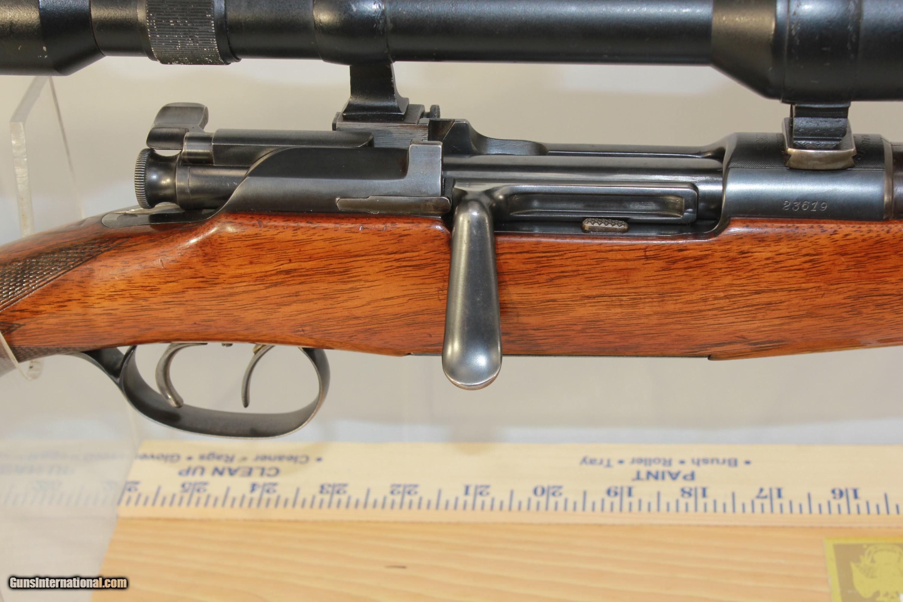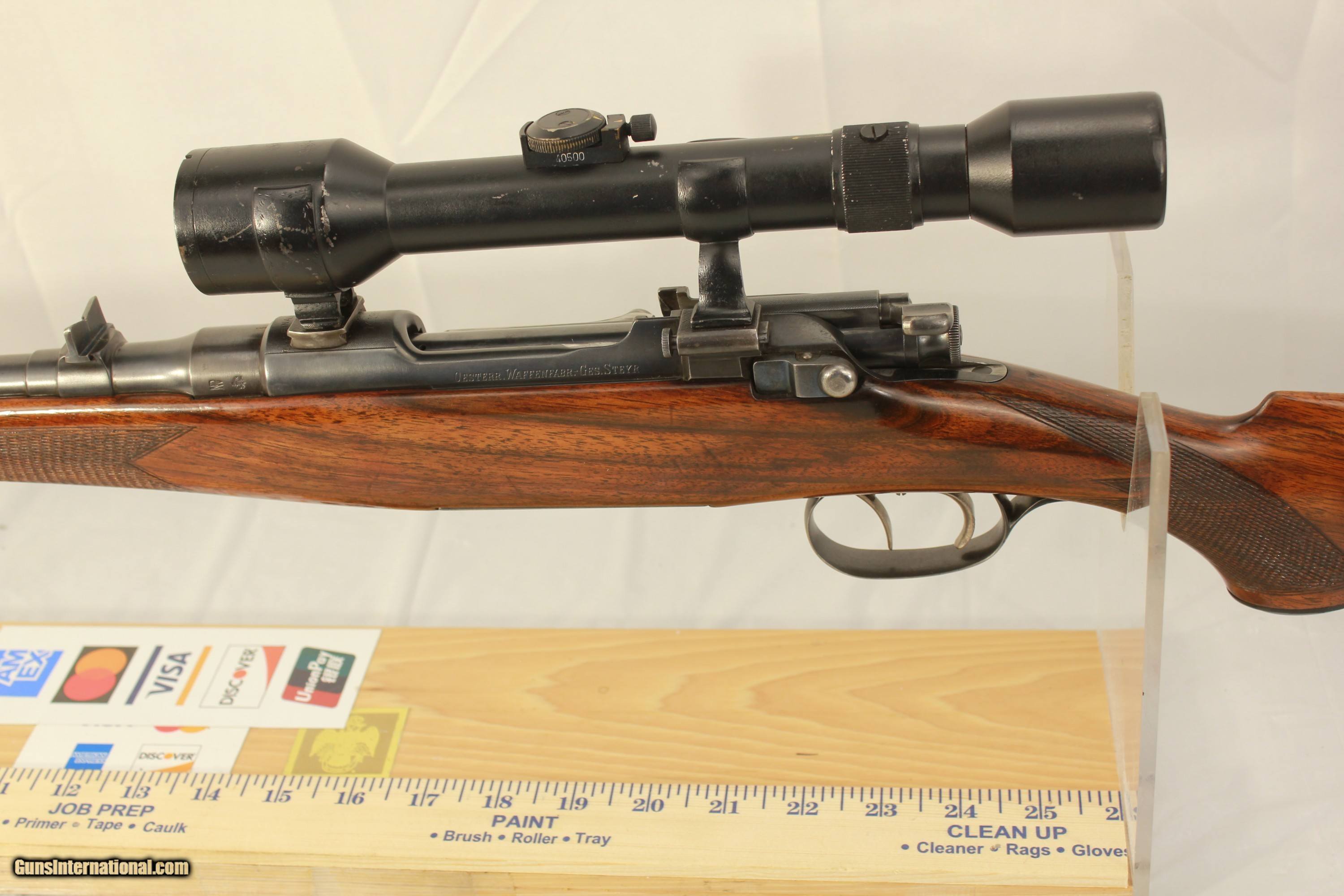 Description: This nice M-S Carbine has been profectionally refinished and is in very good condition. The 18 inch barrel is very good with some darkening and strong rifling. The butt plate a wrist cape are horn. It has wrap around checkering on the forearm. A very nice rifle in a very effective caliber. It has a Noris 4x87 scope with clear optics and the German reticle on a quick detachable mount. It has double set triggers. C&R OK $75.00 shipping via Priority Mail SOLD Curio/Relic: Yes |