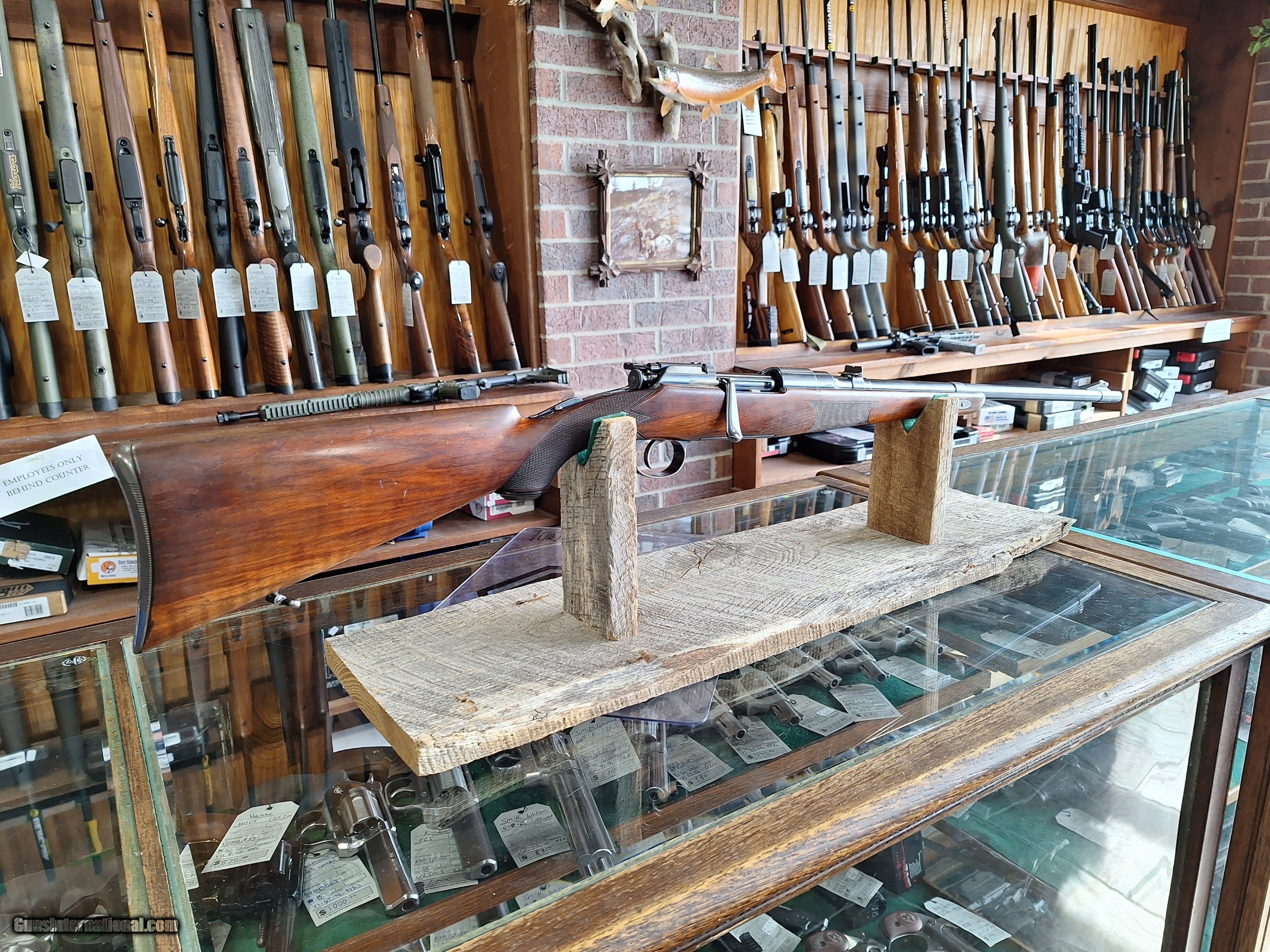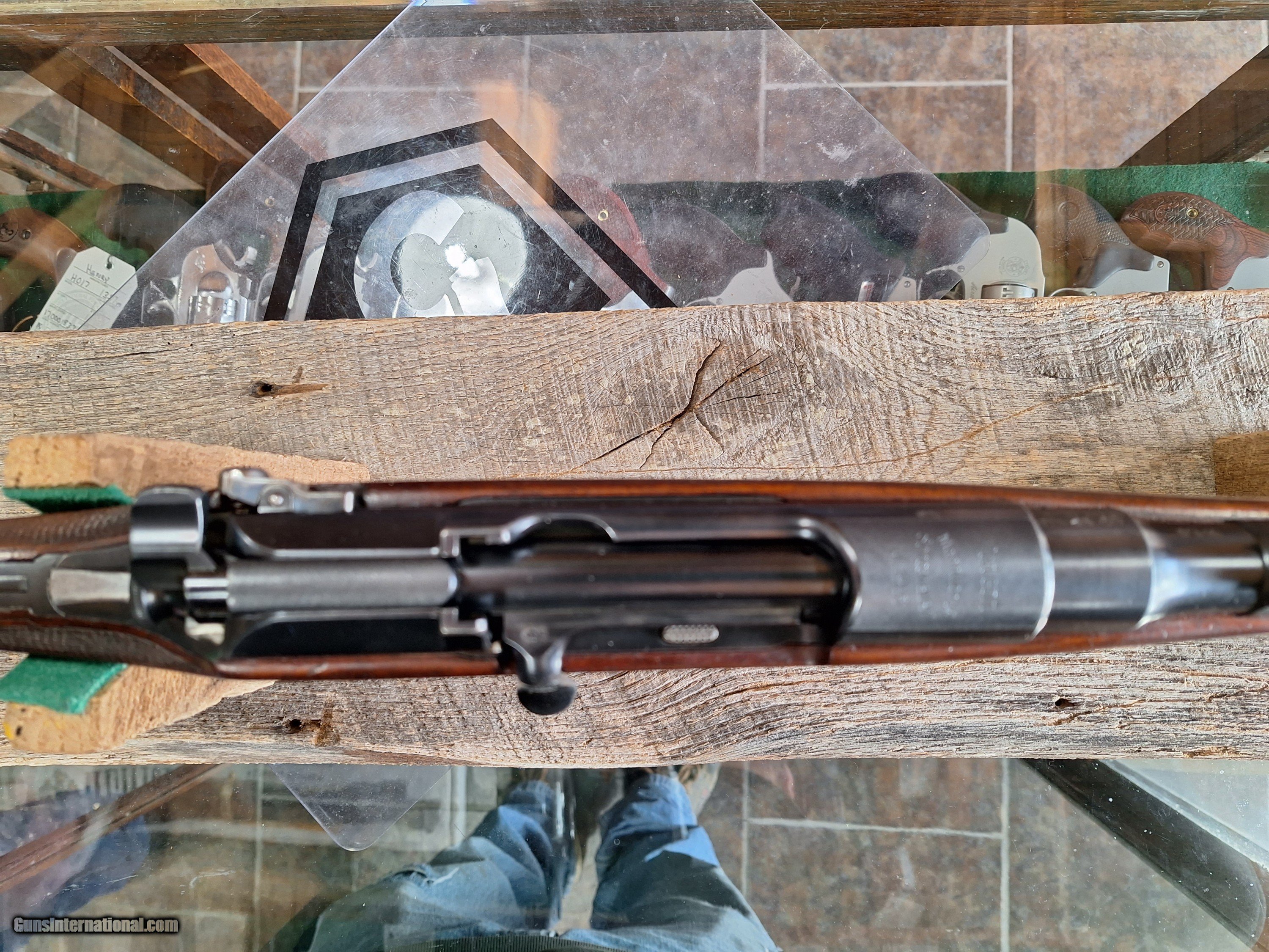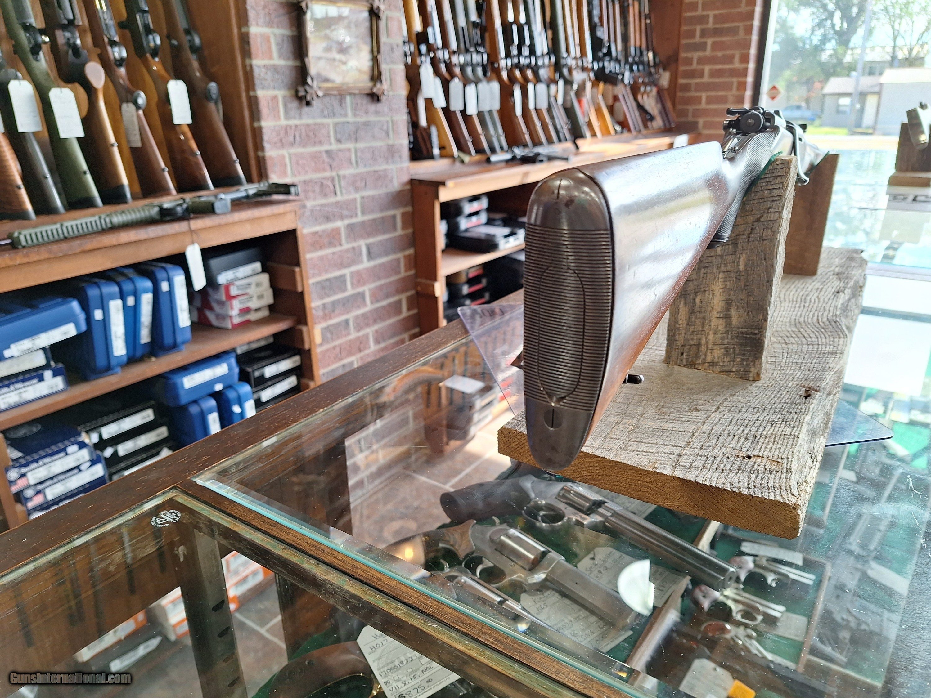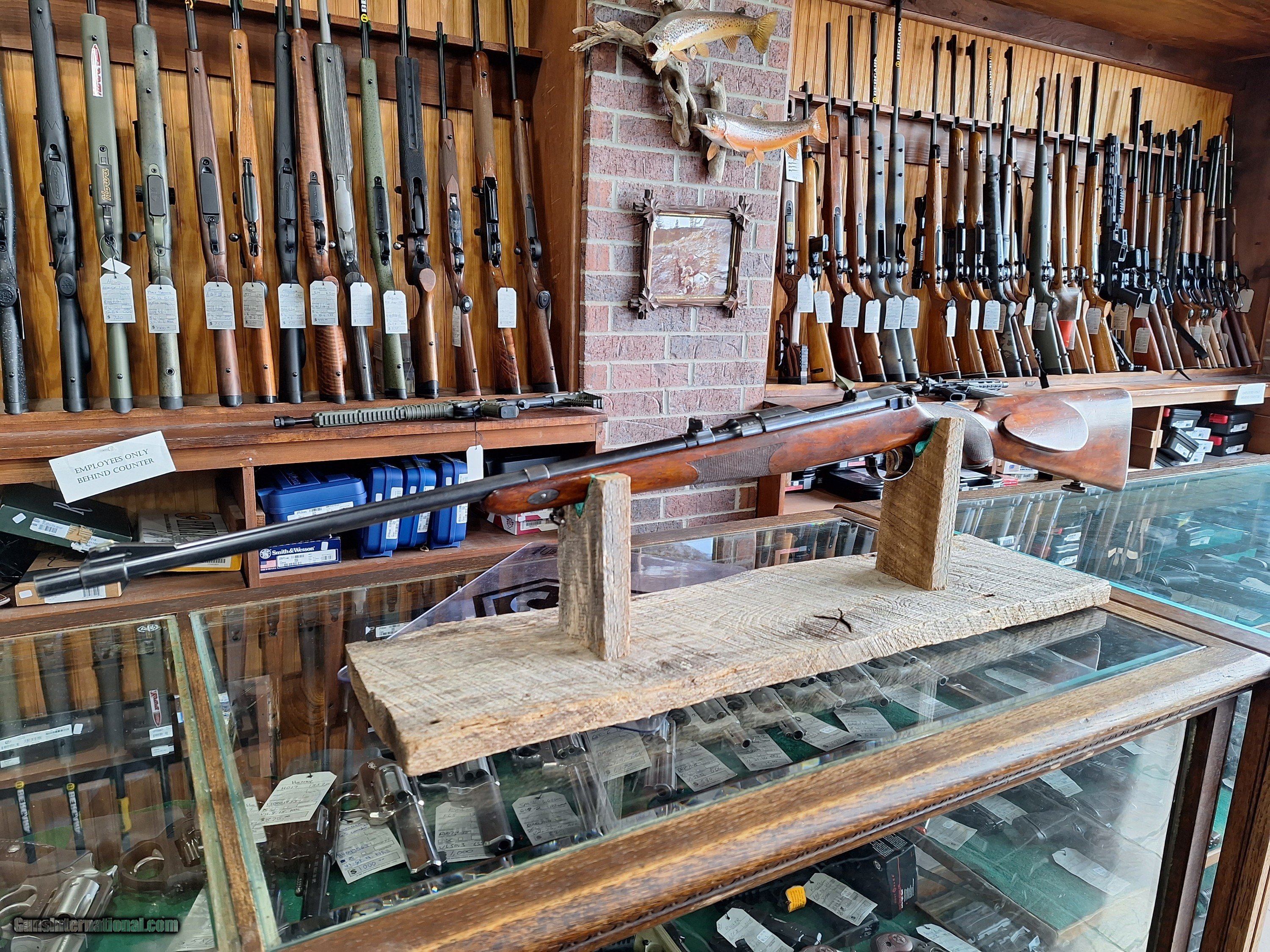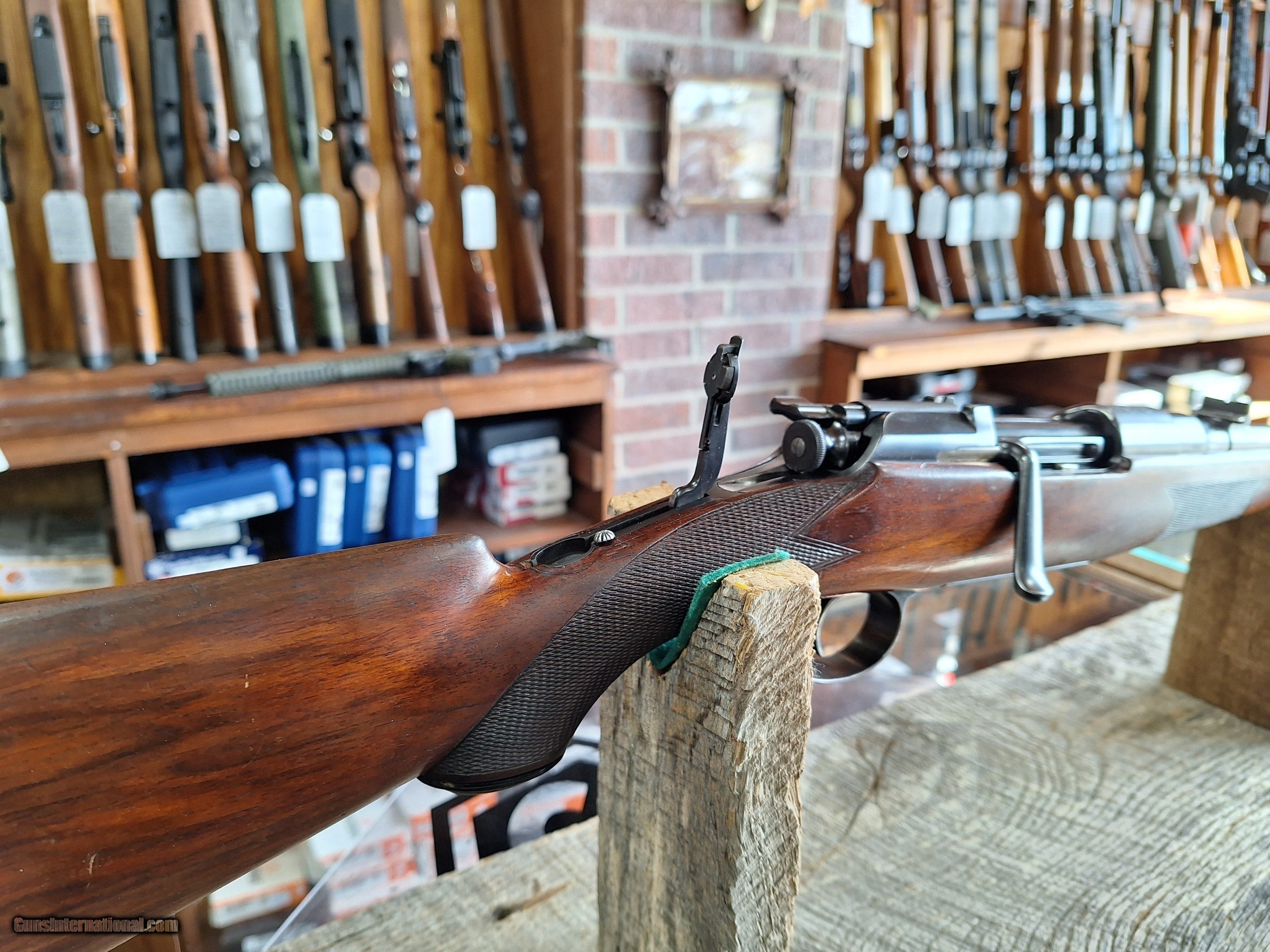Description: Mannlicher Schonauer 1903 6.5x54 Serial number 4407. No steyr proof marks. Rifle was sent to England un proofed to be finnished there. 22 inch barrel, two leaf express sight for 100 and 300 yard plus pop up tang sight. Front sight is typical english style set back for muzzle farther than those made at steyr. Trap under pistol grip cap space for an extra front sight. Take down style stock. Blue is very good except mid way down barrle where it appears to been carried while over ones sholder while being used in Africa or Scotland. Bore is near perfect whith stock showing normal carful use. Will come with load data resulting in .75 inch groups at 100 yd. Please call with any questions. SOLD Manufacturer: Mannlicher Model: 1903 Serial Number: 4407 Barrel Length: 22 Condition: very good |