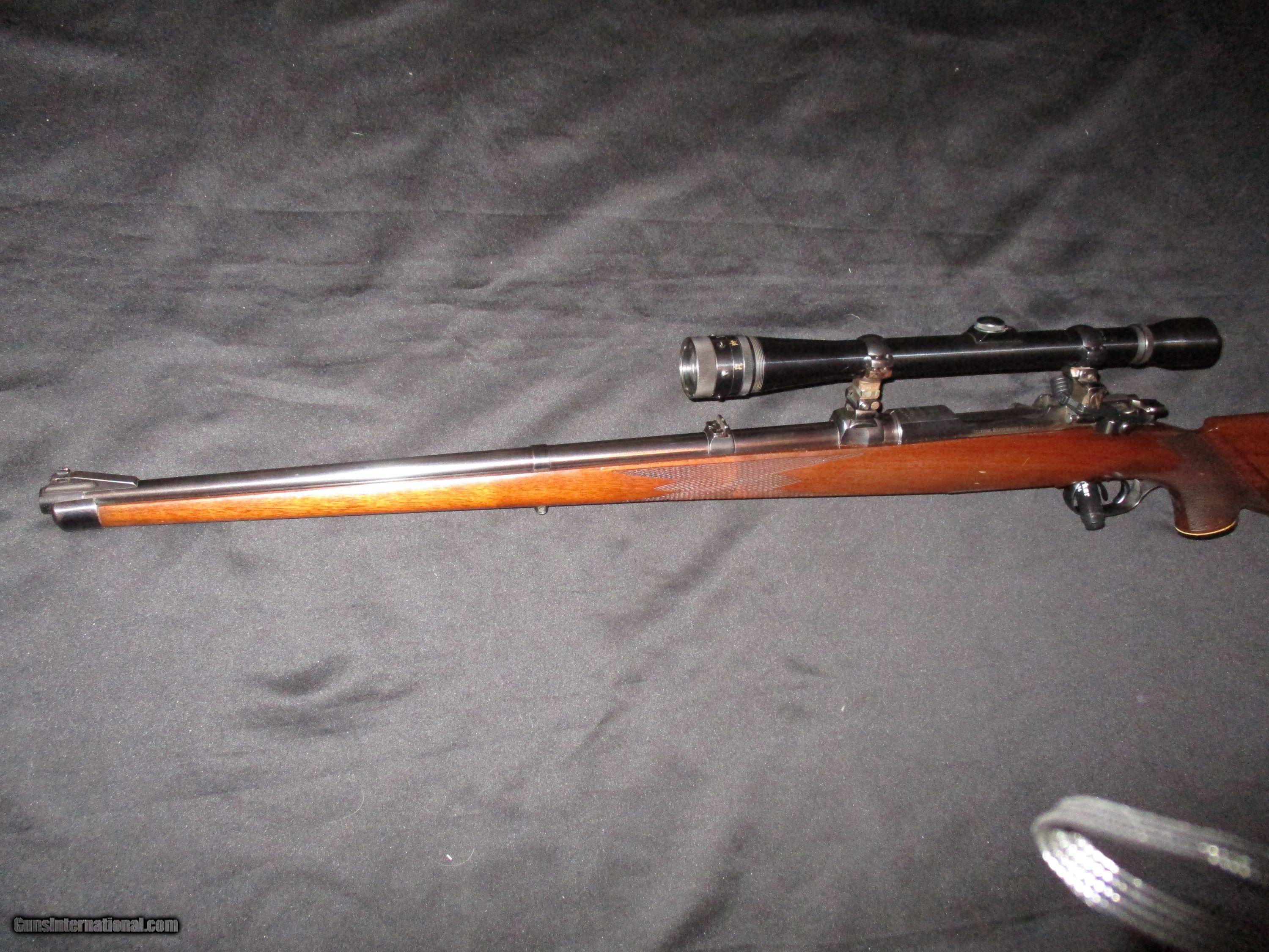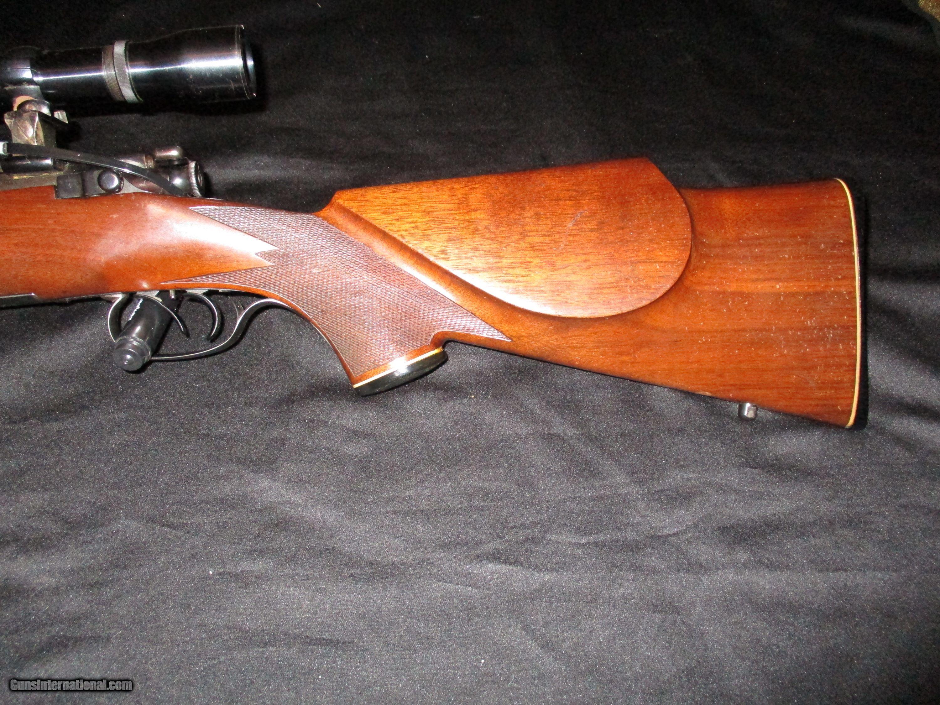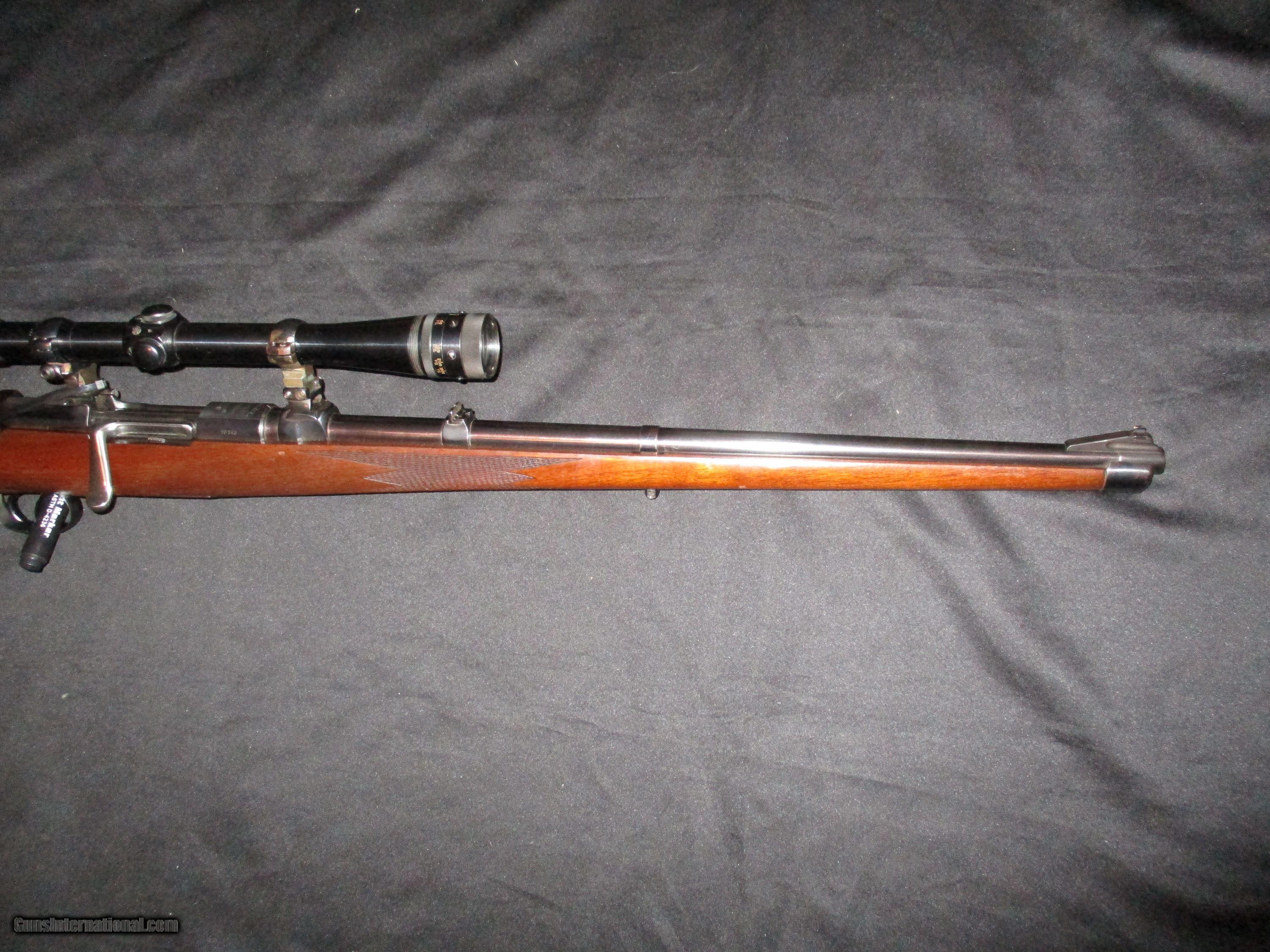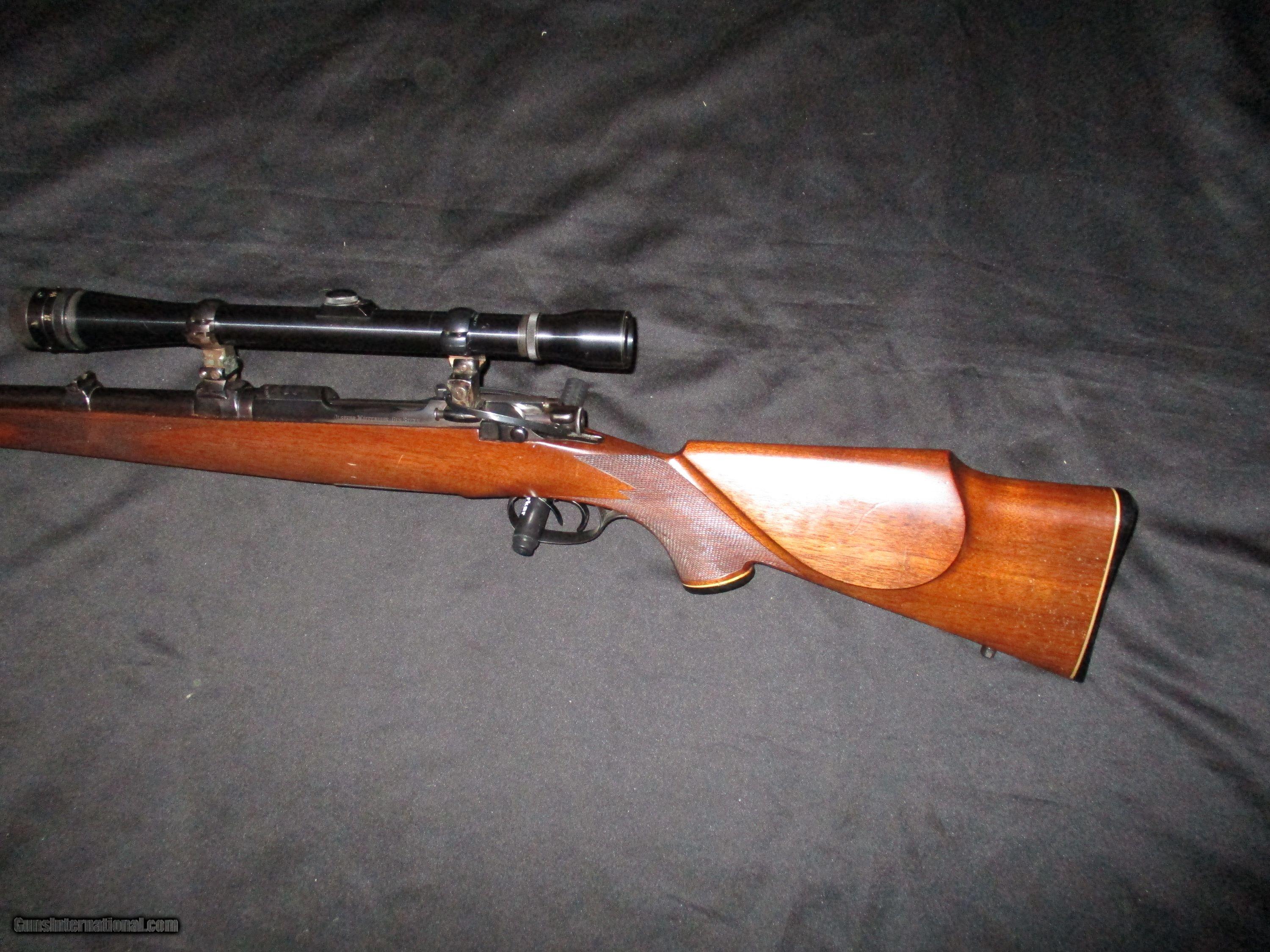 Description: 20" fullstock, end medal band, double set triggers, spoon bolt, quick detatch see- thru. mounts, period Weaver 10X steel tube scope with adj. objective, Euro. style checkered walnut stock, all original in pristine 98% condition, perfect bore so only! SOLD |
