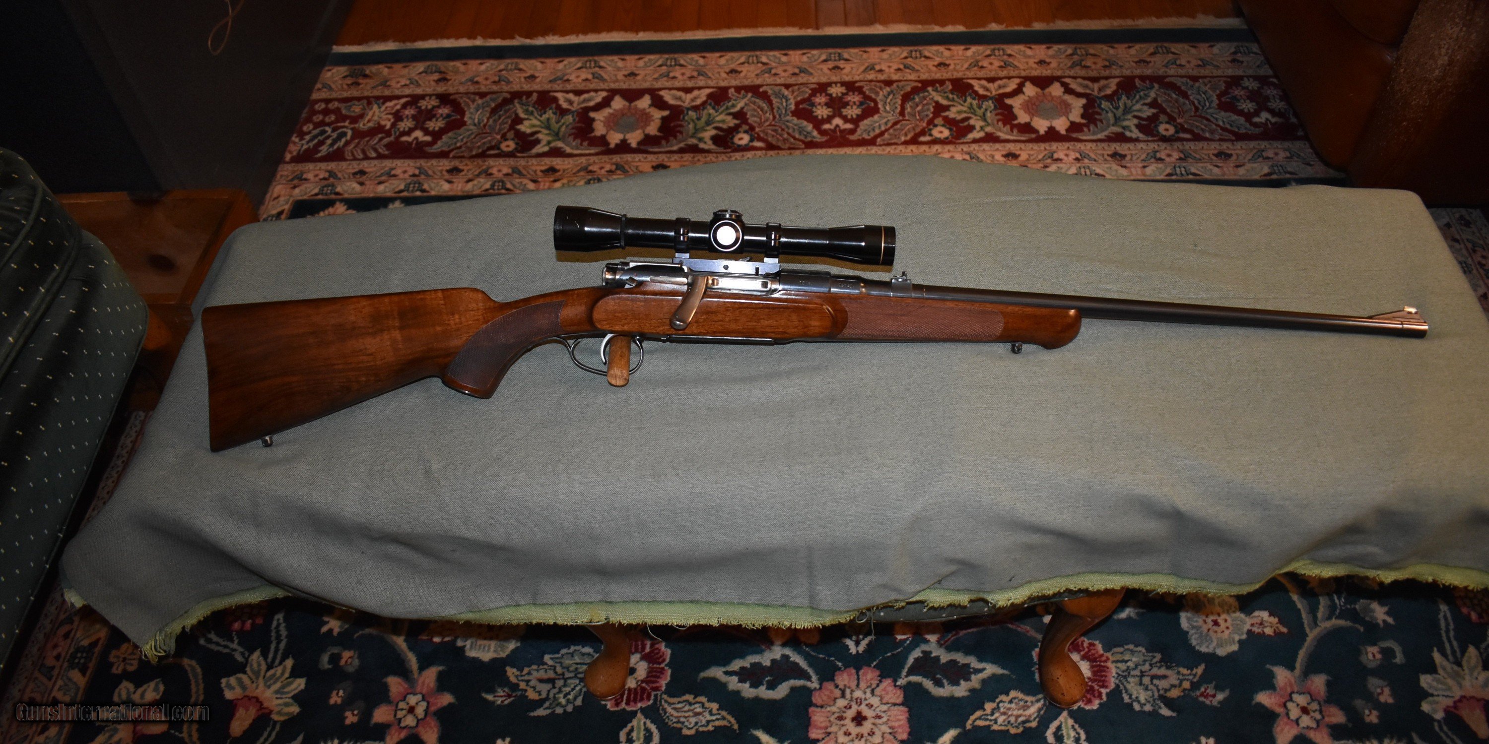 Description: Mannlicher Schonauer model 1956 sporting rifle in 30-06 Springfield. This rifle is in excellent all original condition. It retains 99% of the original blue and wood finishes. It has one standing one folding express sights and a Paul Jaeger quick detach mount with a Leupold 4Xscope installed. The stock is free of any handling marks or cracks and is hand checkered. The 22" barrel has a mint bore. This is a classic sporting rifle in great condition. Price includes shipping to your FFL. SOLD Curio/Relic: Yes Rifle Caliber: .30-06 Springfield Manufacturer: Mannlicher Schonauer Model: 1956 Serial Number: 23740 Barrel Length: 22 Condition: mint Metal Condition: mint Wood Condition: mint Bore Condition: mint Action: Bolt Butt Pad: Factory Buttplate |