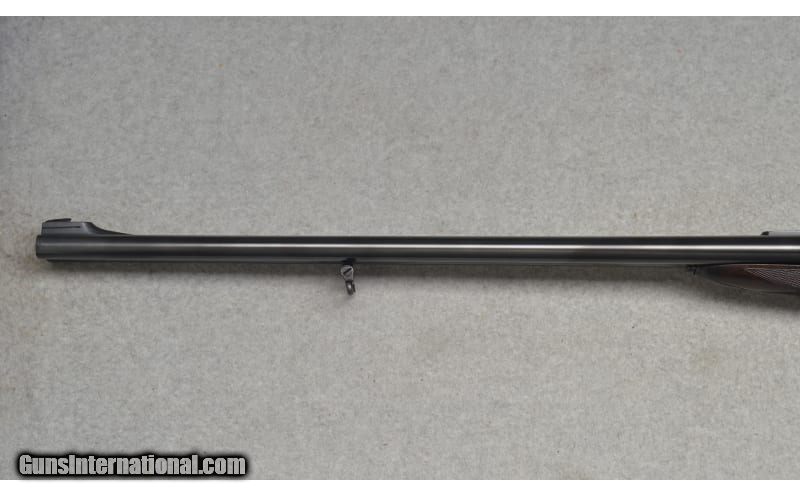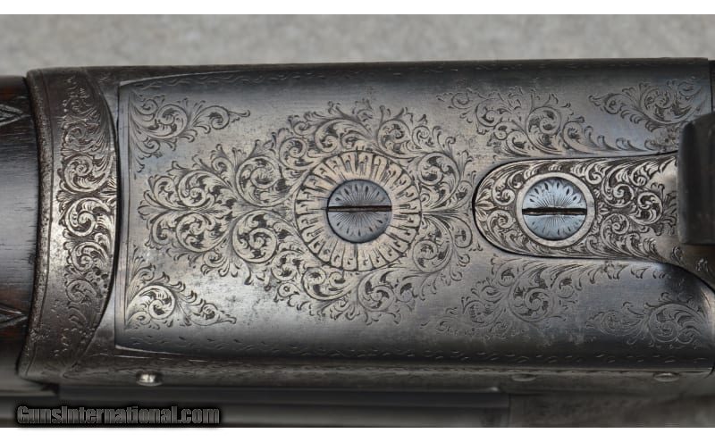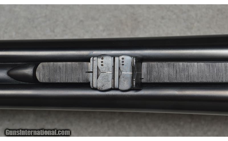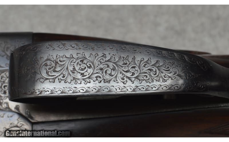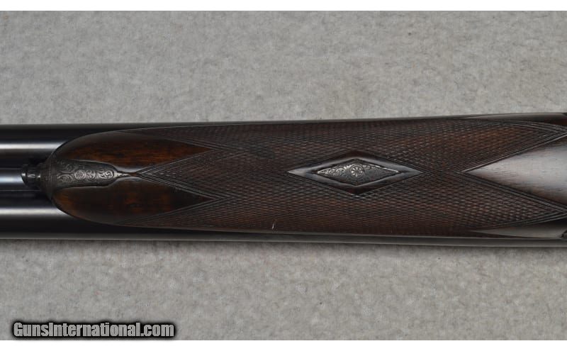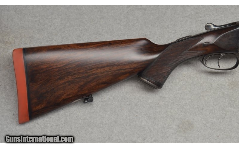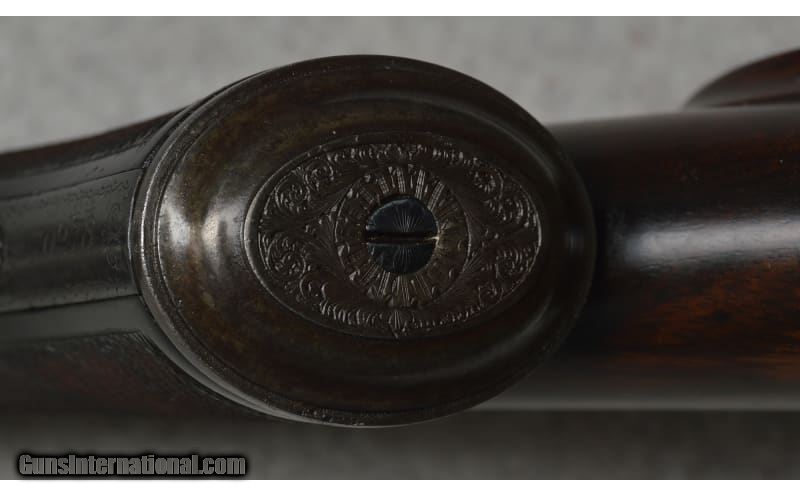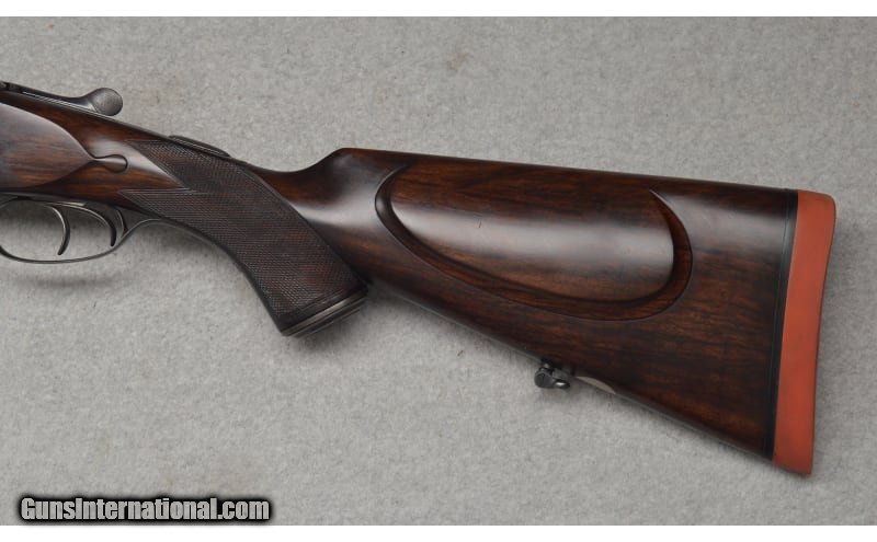 Description: Factory Engraved Manton & Co. Boxlock Double rifle in excellent condition. This rifle is in .450/.400 Nitro Express and is marked for "3 1/4 CASE" as written on the barrel. The case-hardened action displays beautiful floral scroll enraging that covers nearly the entire surface, and extends to the trigger guard and both tangs. It has a single extractor, period London nitro proofs, and replacement buttpad. This rifle also features bushed firing pins, double triggers, and an automatic tang safety with gold inlay. The steel grip cap is engraved and has blank silver inscription oval. Very good reblued finish, mostly darkened gray patina with some traces of case colors on the action, and some scattered pitting in the wood junctions. Wood has some light handling and wear at the forend. SN: 70278 None SOLD Chambers: 2 3/4 Metal Condition: Good Wood Condition: Good Bore Condition: Bright and shiny Barrels: 26 1/4" Solid Rib Barrel Triggers: Double Stock Dimensions: 14 5/8" LOP Butt Pad: Winchester Weight: 10 lb 14 oz Sights: Brass bead Chokes: Top: Improved Modified. Bottom: Improved Cylinder Item Location: Fort Worth, TX |