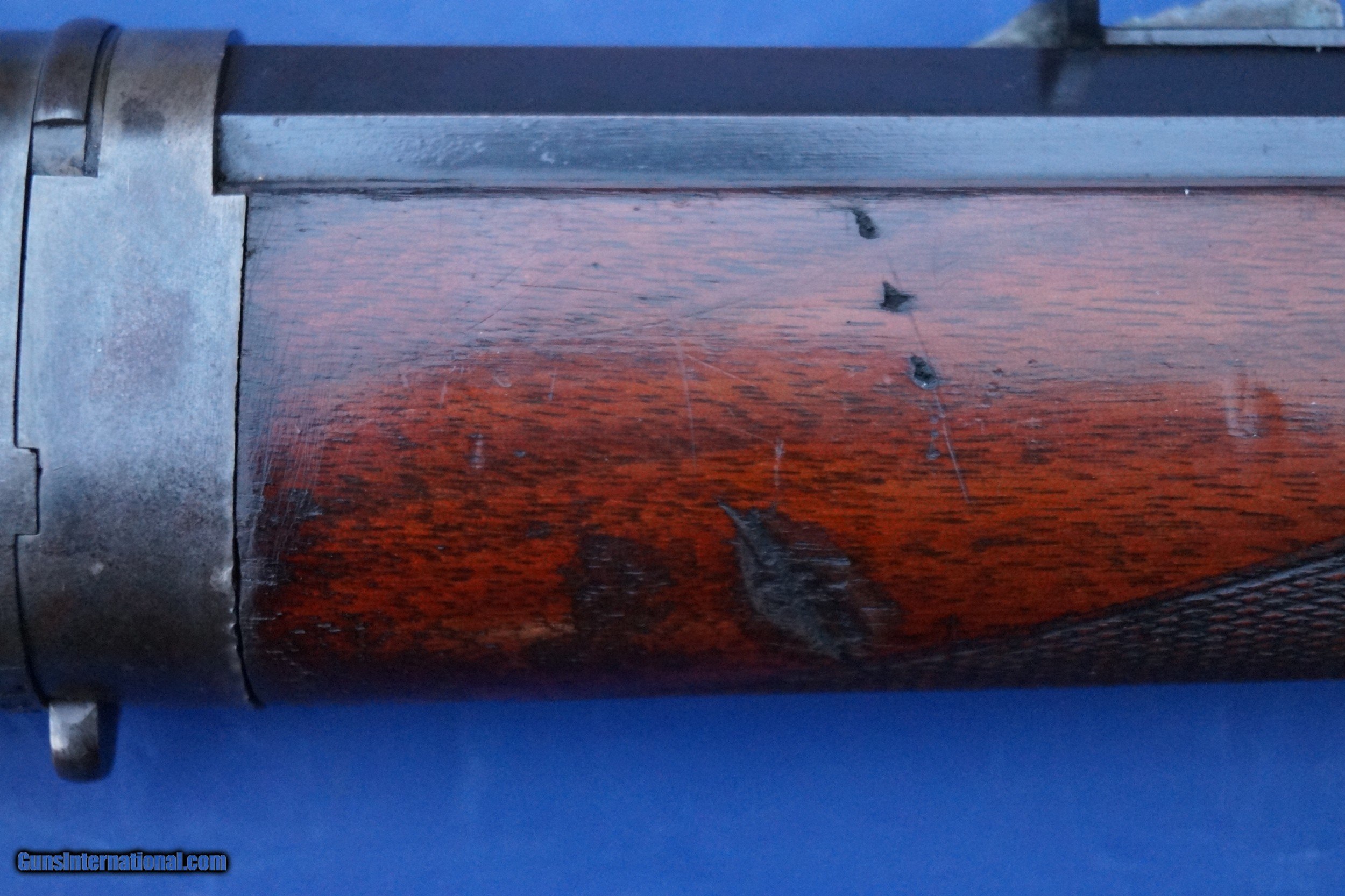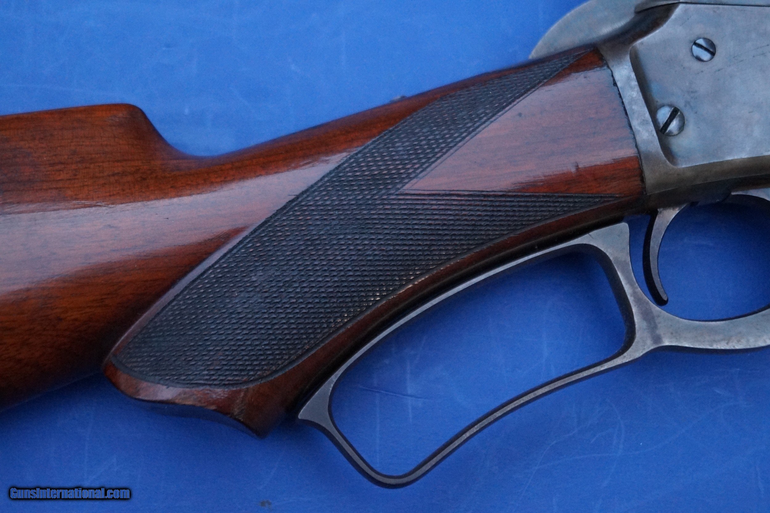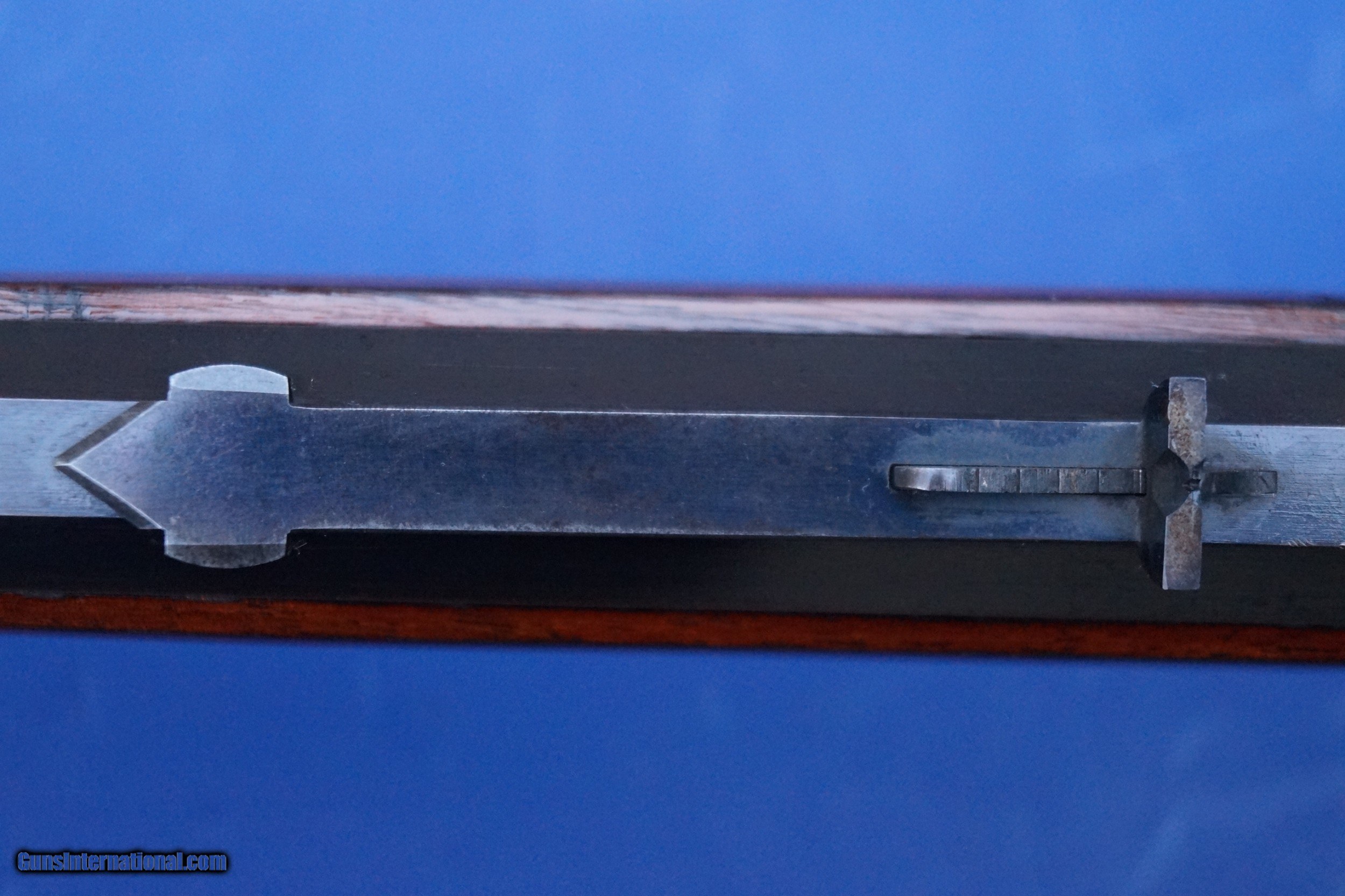 Description: This is a scarce Model 1895 Deluxe Rifle with Special Order Pistol Grip Checkered Stock and the scarce Take Down Frame. Standard 26" Octagon Barrel, Full Magazine, and Crescent Rifle Buttplate. Caliber is 40-82. It also has a desirable Pre-1898 Antique Serial Number in the 137,000 range. Serial numbers start at around 131,000 for this model (All Marlins shared the same consecutive serial range) so this one is probably first or second year production. Marlin only made the original Model 1895 from 1895 to about 1917 with just 18,000 units produced. To put that into perspective, the Model 1886 Winchester Rifle, this Marlin's main competitor, outnumbers the Model 1895 at an almost 10:1 ratio. Today, a Model 1895 is a scarce and desirable gun and the deluxe and takedown features put this rifle on another level. During the latter half of the 19th Century, traveling out West by Train became popular for many hunters. Magazines like Forest and Stream (aka later as Field and Stream) had advertisements from Railroads offering trips out West for hunters living in the East. This is where the takedown frame came into play as this rifle could be broken down and either placed into a custom luggage case or a soft canvas case for ease of travel. Overall Condition Grades to NRA Antique Fine+ to Excellent witih 50-60% fading case colors on the receiver and 97% original blue remaining on the barrel and magazine tube. The wood retains 95% original varnish with very good checkering that shows light usage that isn't worn down. No cracks or repairs but does show some handling marks including what looks like a boot spur once rolled across the right side of the forend....which is not uncommon on 19th century rifles. Fine Plus wood overall and Exc. Wood to Metal Fit. The takedown mechanism works and is still very tight. Excellent Bore. Original Sights include the Marlin Ballard Rear Sight and the Standard Rocky Mountain Front sight with German Silver Blade. This is a very rare rifle in great shape that is priced for about half that of a comparable Winchester 1886 Deluxe Rifle. SOLD Antique: Yes Manufacturer: Marlin Model: 1895 Caliber Info: 40-82 Condition: NRA Antique Fine+ to Exc. Barrel Type: Octagon |