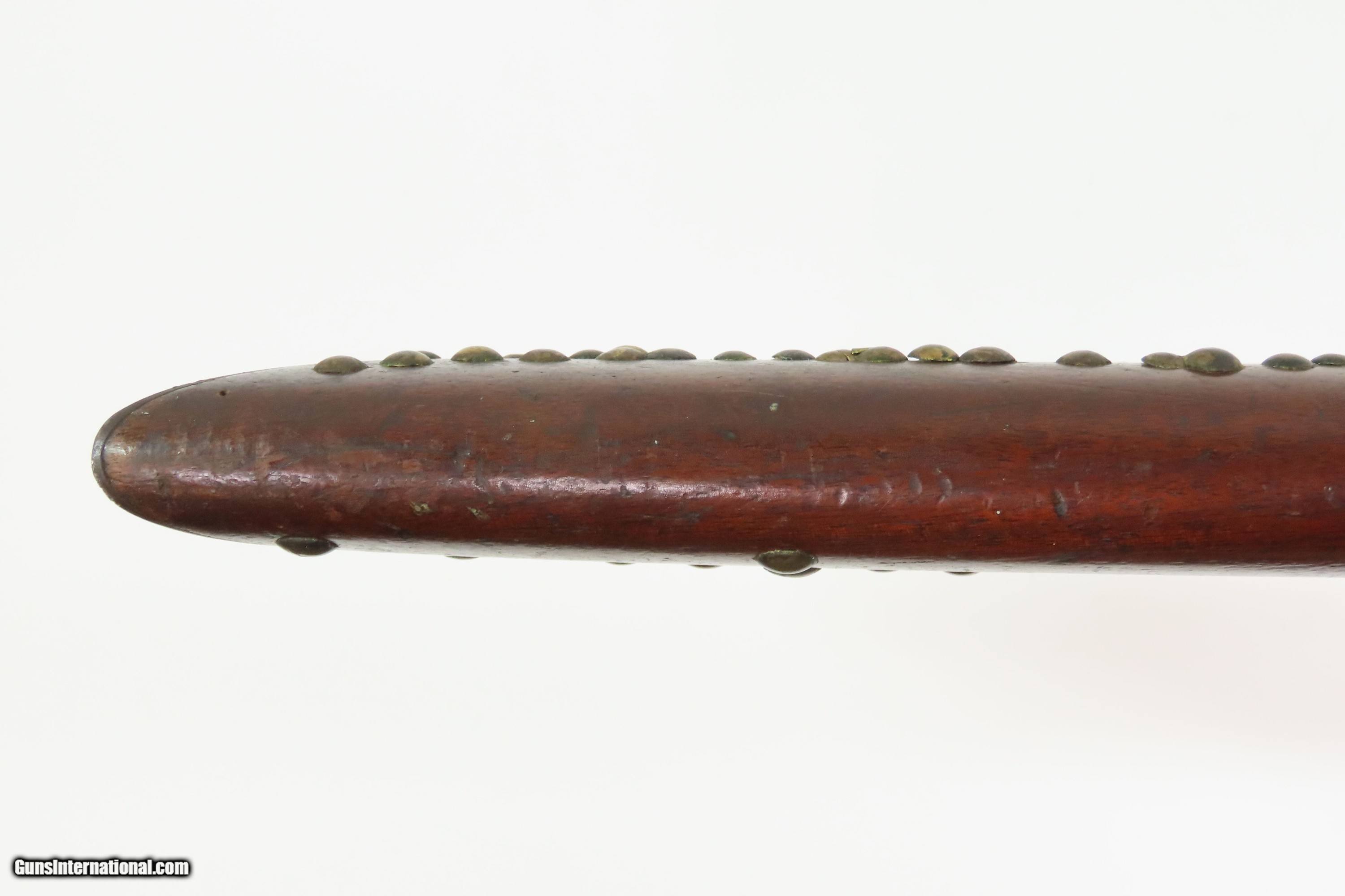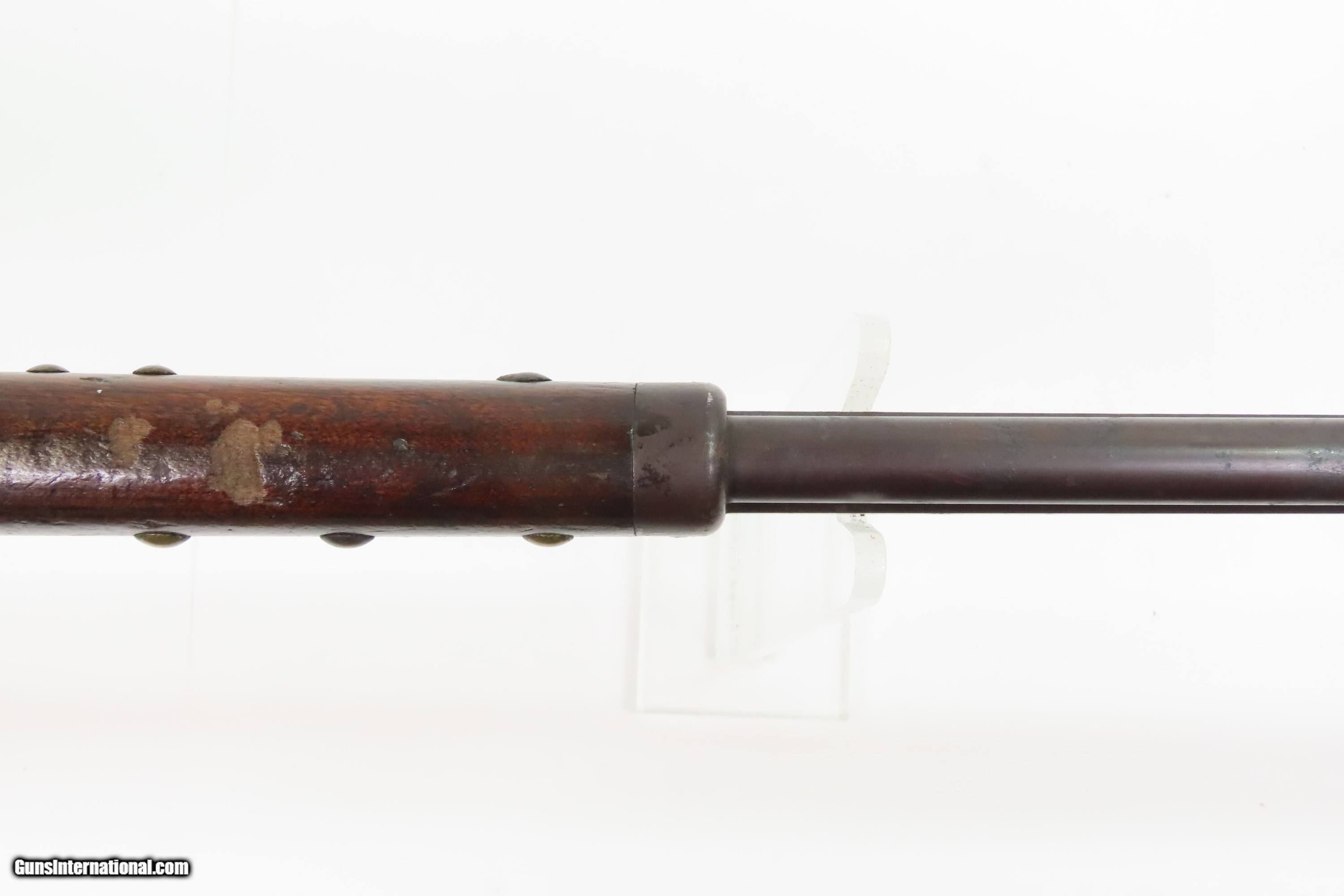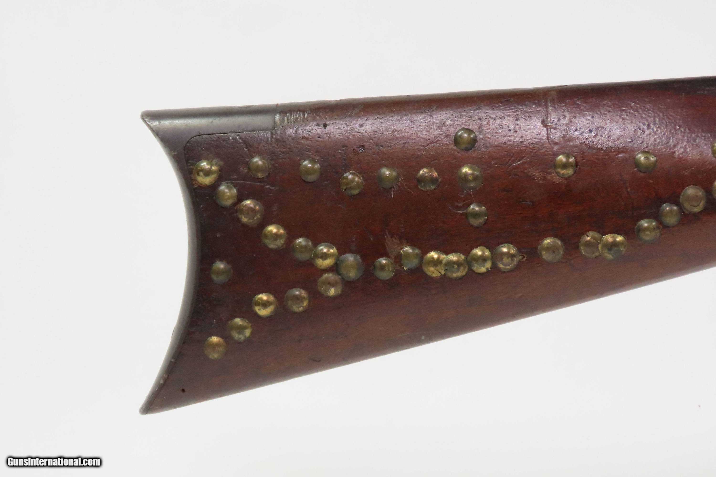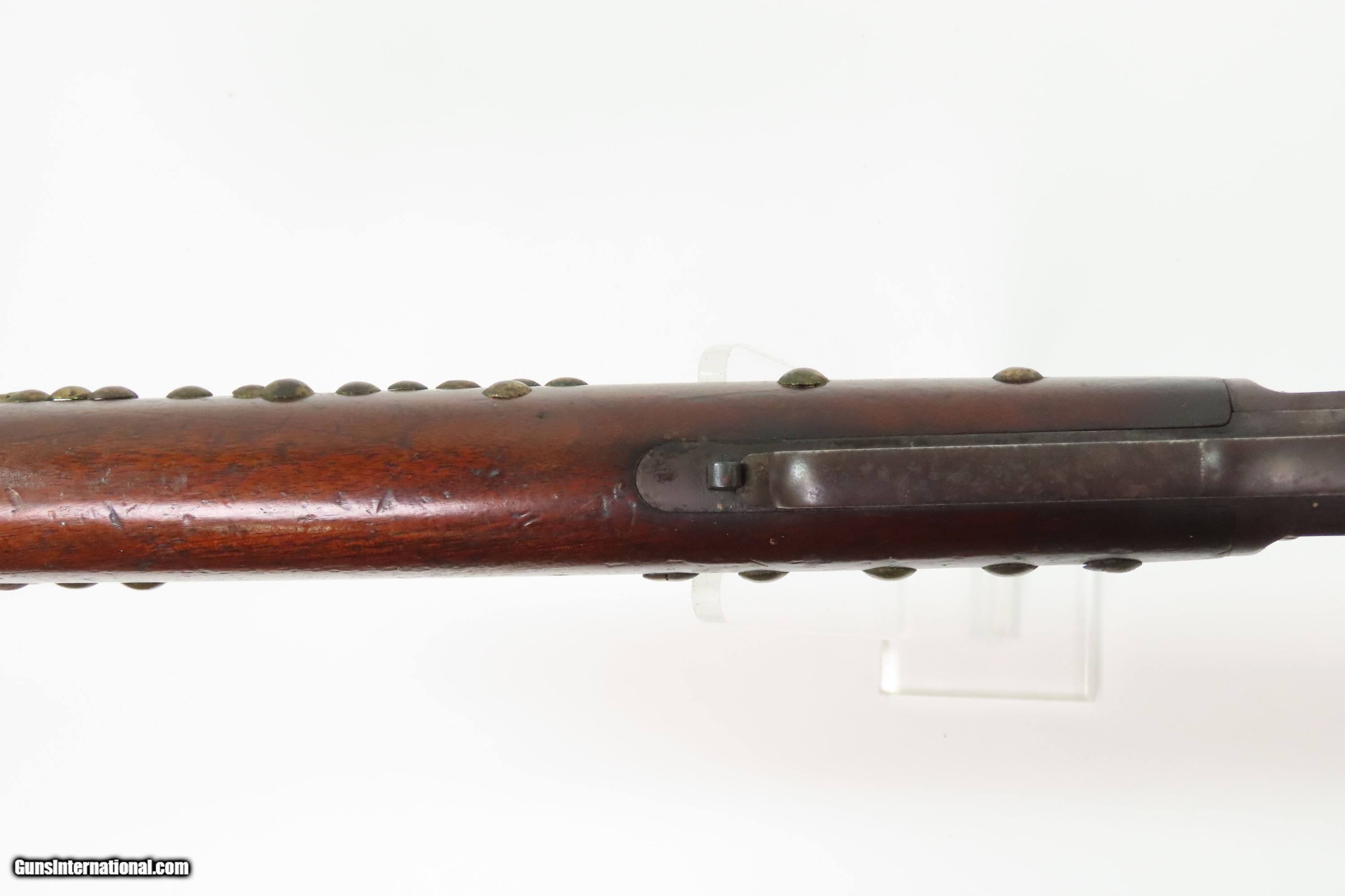 Description: 1890 mfg. TACK DECORATED Antique J.M. MARLIN M1889 .38-40 WCF Lever Rifle NATIVE AMEREICAN Style BRASS Tack Decoration Here we present an antique J.M. Marlin Model 1889 Rifle in .38-40 WCF, made in 1890 in New Haven, Connecticut. Dubbed as the “New Safety Repeating Rifle,” the 1889 Marlin was a mid-sized, redesigned 1888 model. Many key features of these style lever action rifles had already been patented by several people, but John Martin incorporated all the features into a single functional firearm. The most noticeable difference is the solid top with its side-ejection system. The new model also utilized a cartridge carrier that raised automatically, closing the end of the magazine after the head of the cartridge had passed into the carrier preventing the next cartridge from entering the carrier and jamming the action. This was an important feature, since the rifle was produced in a variety of calibers ranging from .32-20 to .45-70 GOVT, a feature that would not be duplicated by competing Winchesters for several more years. The similarity between the .38-55 and the .44-40 cartridges sometimes caused confusion for shooters. If a shooter accidentally loaded a .44-40 into a .38-55, the lever would not close properly. With the ’89 Marlin, he simply had to lever downward, as if the .44-40 was an empty shell, and the oversized cartridge would be thrown to the side. Overall, the 1889 Marlin was well received on the frontier and nationwide. More than 55,000 guns left the factory between 1889 and 1903. In its day, the model was considered state-of-the-art. Now, 130+ years later, this 1889 Marlin is an extremely collectible firearm. The overall condition is very good. Nice even brown patina throughout. The action is strong, but the lever is a little sticky. The bore is reflective, slightly dims toward the muzzle and has serviceable rifling. The stock and forend are solid. Legible markings. Rear sight elevator is absent. The muzzle has been cleaned. Own the original! This is a legitimate antique and not a reproduction. Barrel is 24 inches. Caliber: .38 Winchester Center Fire Overall condition as seen in photos. Very Fast. Very Safe. FREE SHIPPING WORLDWIDE. Delivered directly to your door by express mail! Guaranteed AUTHENTIC & Includes CERTIFICATE OF AUTHENTICITY. ancestryguns $1600 #250170 SOLD Antique: Yes |