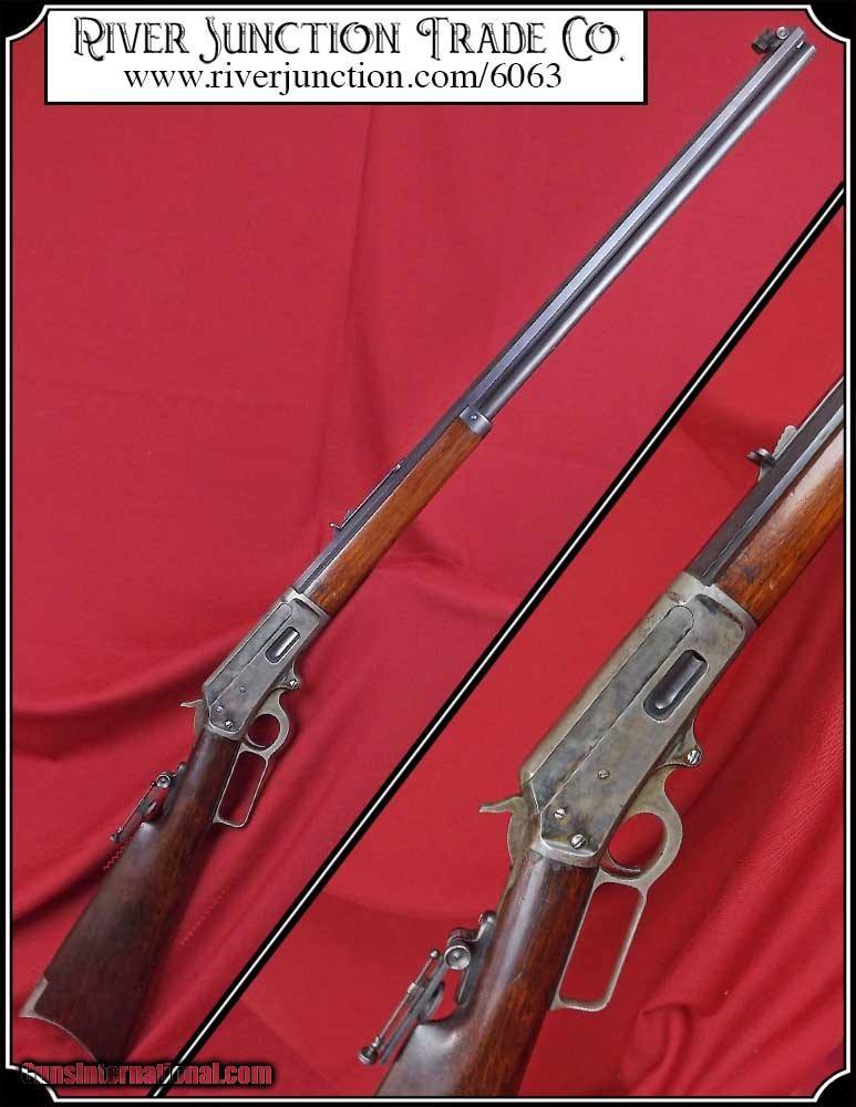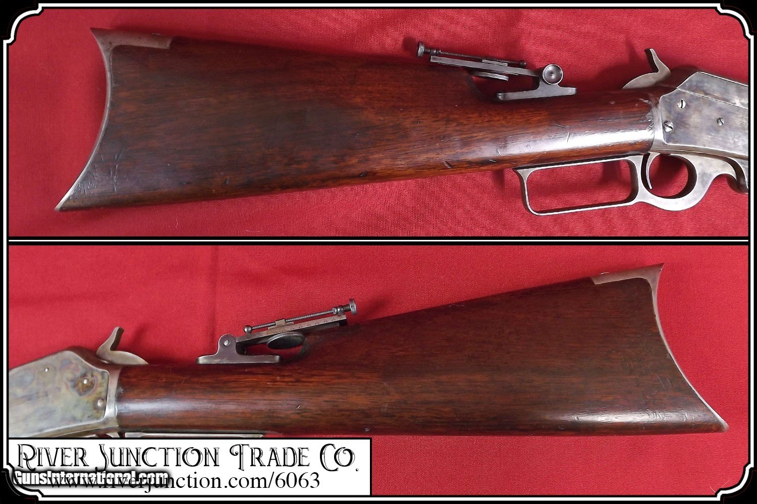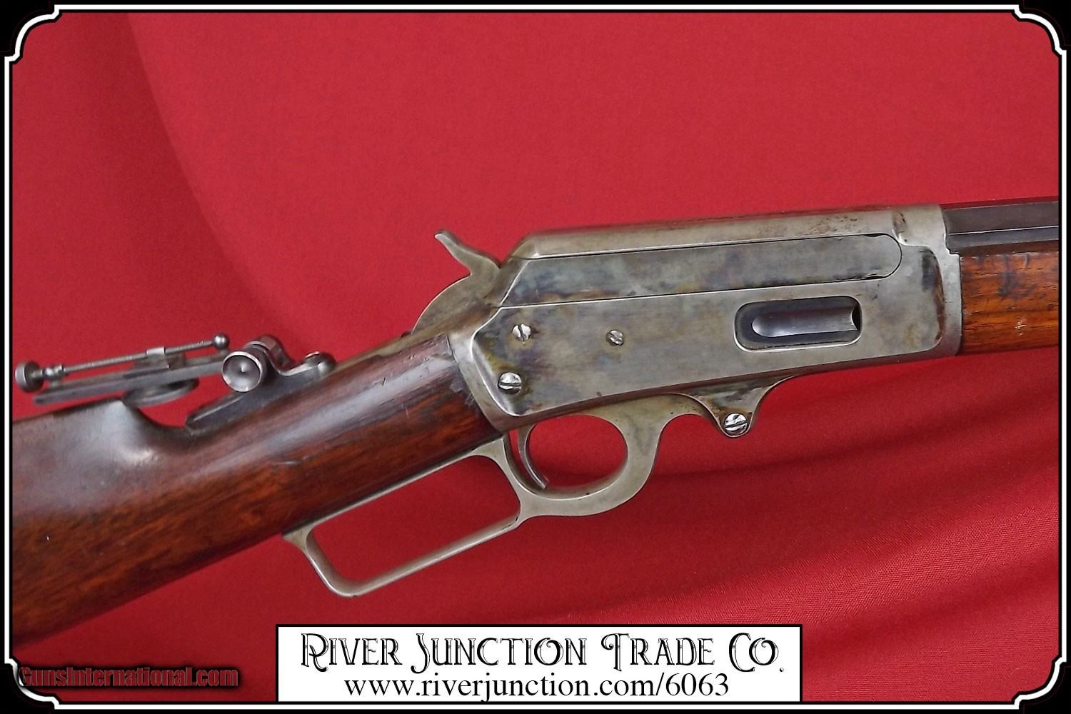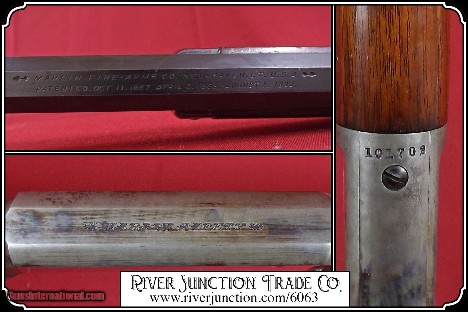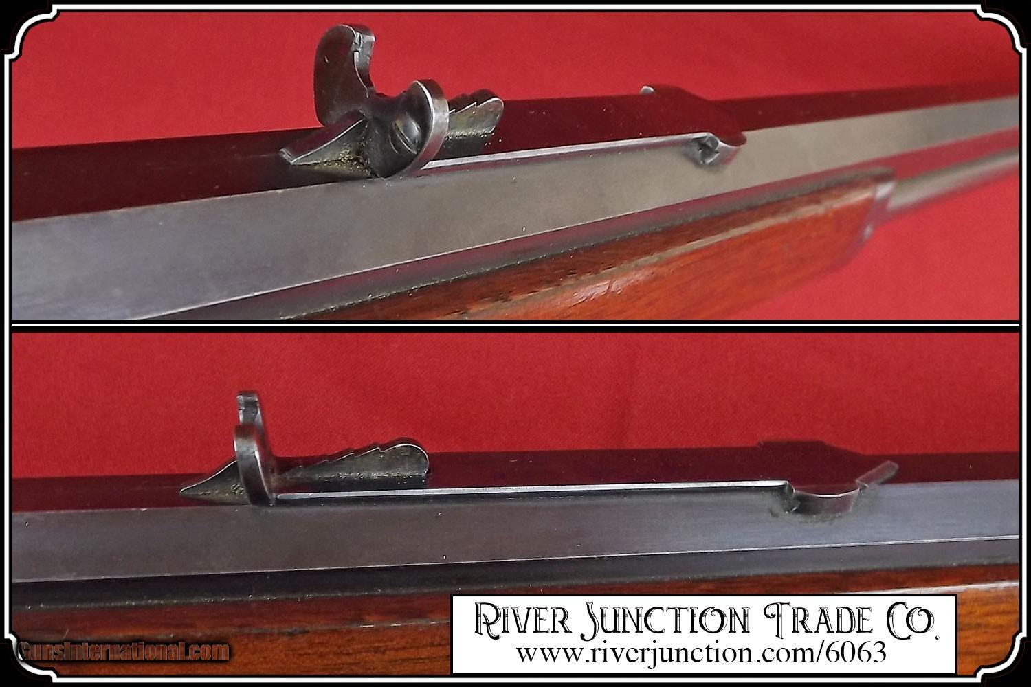 Description: This is an early Model 1893 Marlin Sporting Rifle in caliber 38-55. with extra long 28” octagon barrel and is not marked, “For Black Powder” nor ”Special Smokeless Steel". Serial number is 101702 which makes it an antique of 1894 production. The sights include, this early Winchester Mid-Rang Vernier Tang Sight with the thick base plate. It's in excellent shape with no problems or damage and blue overall and the globe front sight is likewise. Top of barrel marked "38-55" with Marlin address and 1887, '89, and '93 patent dates. I have not removed the tang sight but, I assume it denotes "Model 1893". The 38-55 is an all-around great calibers for both hunting and target shooting in their original black powder loads. The bore is bright and shiny as new. This is an "A" grade rifle, a very nice example! Overall, NRA Antique Fine+ Condition. Barrel, magazine tube, and forend cap retain 95% original blue. The frame shows 75% faded colors on the right side and around 40% on the left side. Bolt has about 60% faded colors. Top of the frame is marked "Marlin Safety" and shows smoky shadows of mottled colors. Lever retains 10% colors while the hammer has fared a little better with 70% faded colors. Loading port has 75% bright original blue. The original walnut stocks are in Fine condition showing only light handling marks with perfect wood to metal fit and 95% original varnish. No chips, cracks, or repairs. Action is still nice and smooth with an Excellent bore. A very clean example of a Marlin 1893 in a great configuration and caliber. This is an ANTIQUE and can be shipped directly to you. Sold as an Antique ~ no guarantees, warranties, or liabilities for any actual usage. If any firearms are to be used for shooting purposes, a qualified gunsmith should inspect them first. Payment: Item, can be ordered with a credit card or paypal on our sight. Just Google (riverjunction) and type in the River Junction Trade Co. item number (6063) in the search box. Before you checkout you will see shipping cost and total. OR If you prefer: Pay by cash, postal money order, cashiers check, personal & business checks. We wait for checks to clear. Call me 563-880-4588. Jim We qualify some of our items as eligible for our LAYAWAY PROGRAM. We accept Bank Check, Money order, Personal checks or wire transfer. Items over $1000.00 can layaway at 1/3 down and 1/3 in 30 days and balance in the following 30 days. No discount is offered on layaway items. We are open to offers at any other time. SOLD |