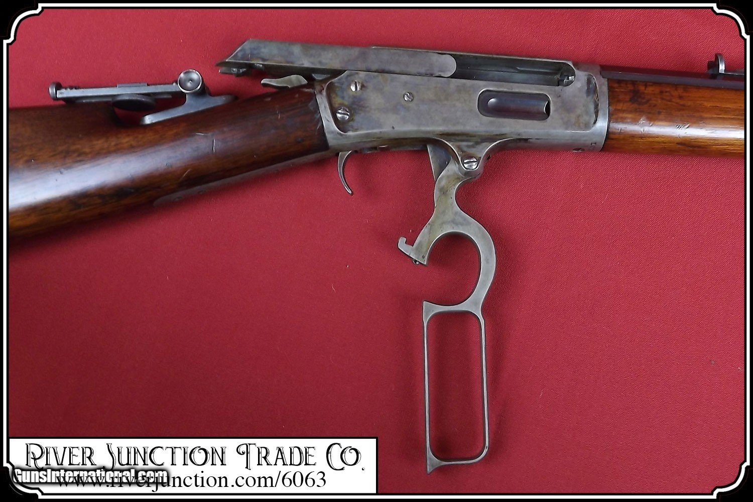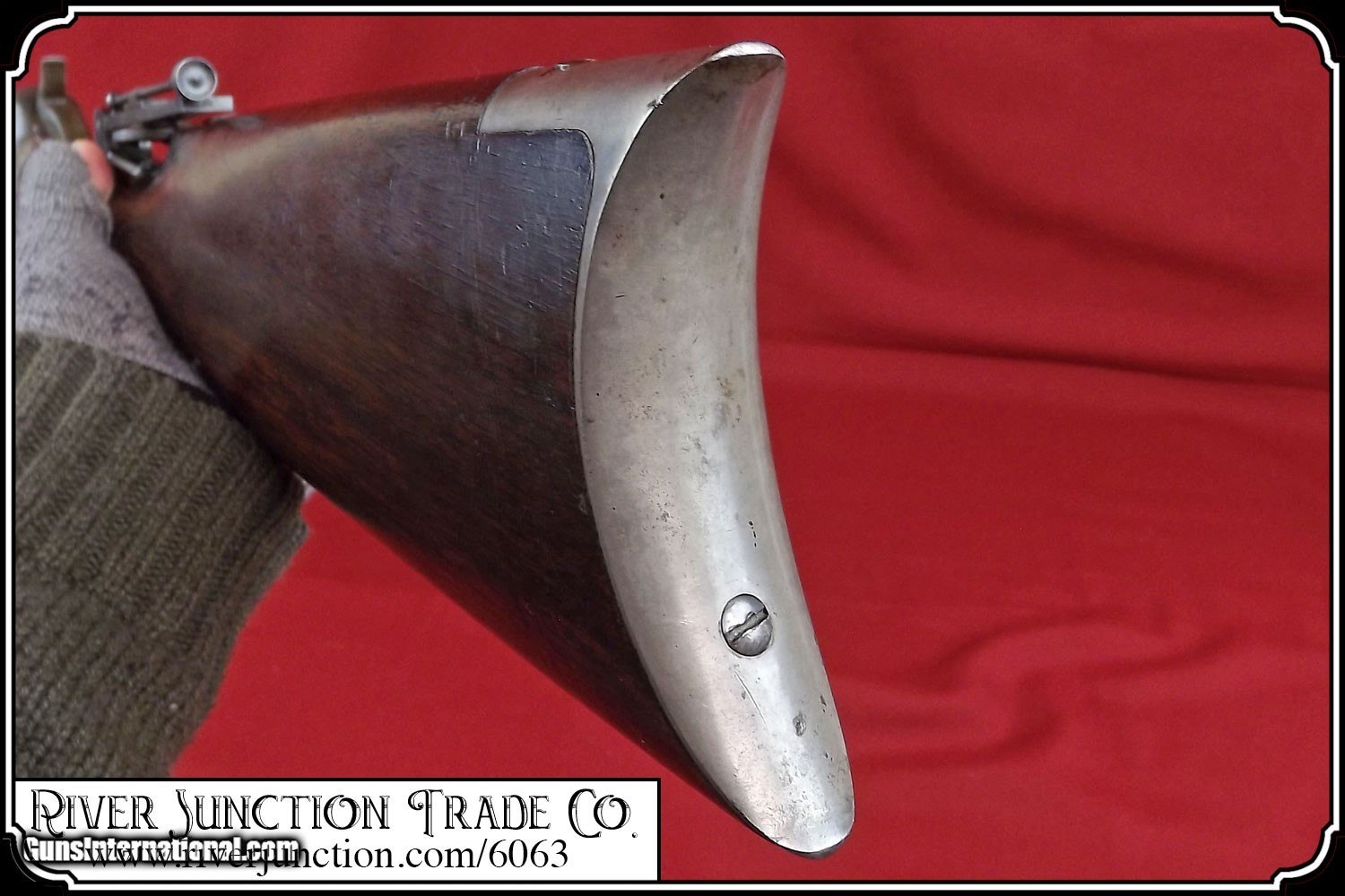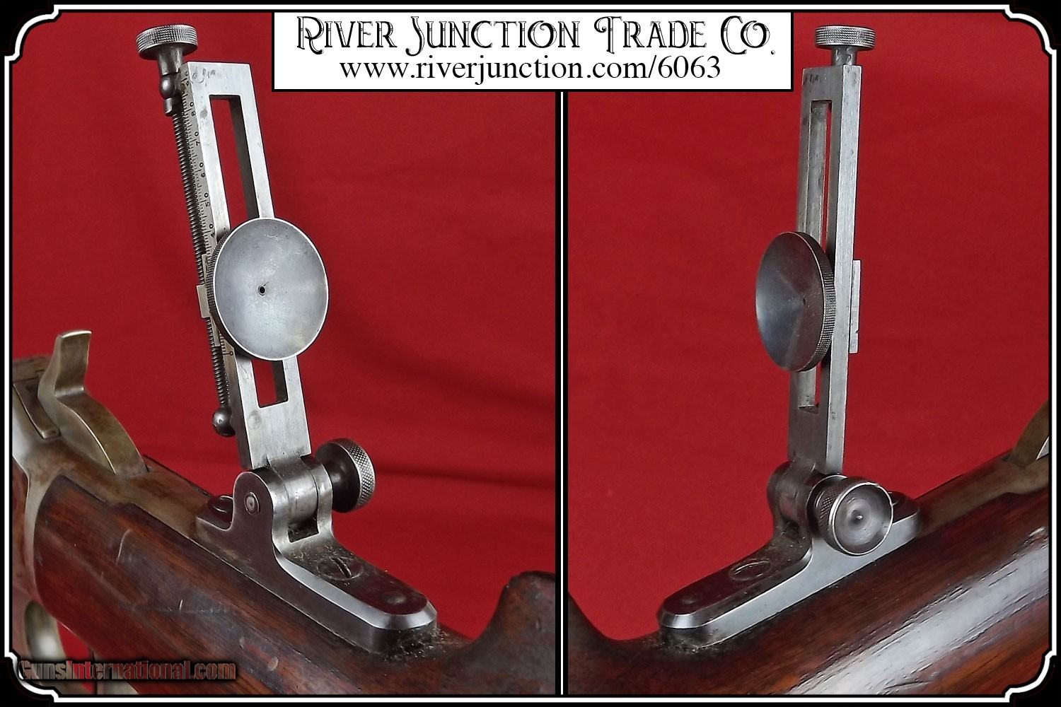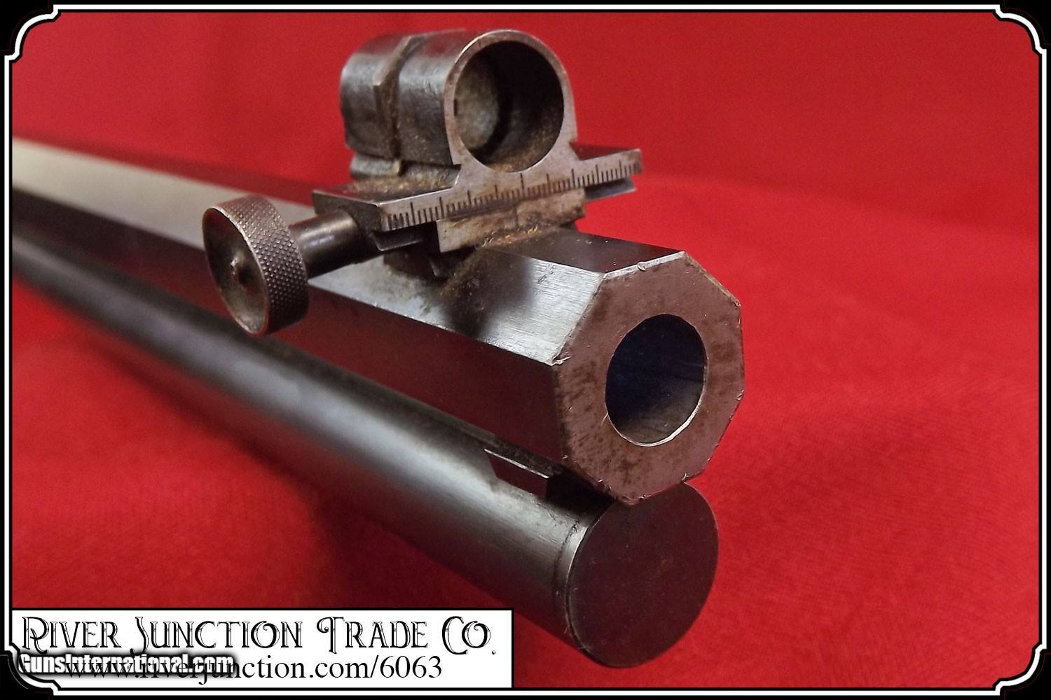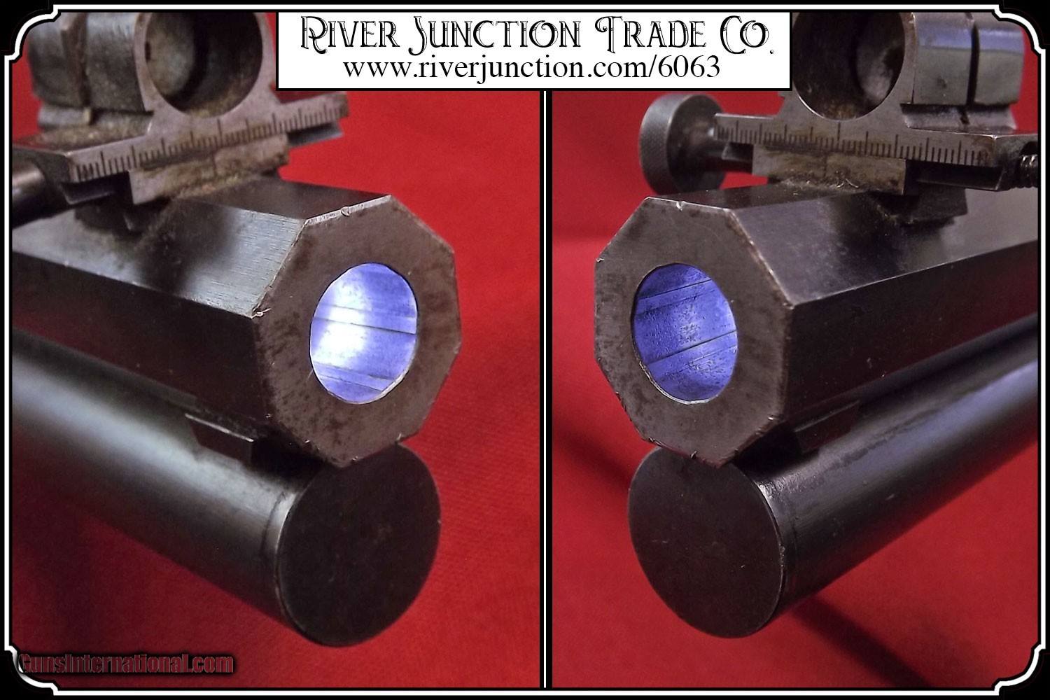 Description: This is an early Model 1893 Marlin Sporting Rifle in caliber 38-55. with extra long 28” octagon barrel and is not marked, “For Black Powder” nor ”Special Smokeless Steel". Serial number is 101702 which makes it an antique of 1894 production. The sights include, this early Winchester Mid-Rang Vernier Tang Sight with the thick base plate. It's in excellent shape with no problems or damage and blue overall and the globe front sight is likewise. Top of barrel marked "38-55" with Marlin address and 1887, '89, and '93 patent dates. I have not removed the tang sight but, I assume it denotes "Model 1893". The 38-55 is an all-around great calibers for both hunting and target shooting in their original black powder loads. The bore is bright and shiny as new. This is an "A" grade rifle, a very nice example! Overall, NRA Antique Fine+ Condition. Barrel, magazine tube, and forend cap retain 95% original blue. The frame shows 75% faded colors on the right side and around 40% on the left side. Bolt has about 60% faded colors. Top of the frame is marked "Marlin Safety" and shows smoky shadows of mottled colors. Lever retains 10% colors while the hammer has fared a little better with 70% faded colors. Loading port has 75% bright original blue. The original walnut stocks are in Fine condition showing only light handling marks with perfect wood to metal fit and 95% original varnish. No chips, cracks, or repairs. Action is still nice and smooth with an Excellent bore. A very clean example of a Marlin 1893 in a great configuration and caliber. This is an ANTIQUE and can be shipped directly to you. Sold as an Antique ~ no guarantees, warranties, or liabilities for any actual usage. If any firearms are to be used for shooting purposes, a qualified gunsmith should inspect them first. Payment: Item, can be ordered with a credit card or paypal on our sight. Just Google (riverjunction) and type in the River Junction Trade Co. item number (6063) in the search box. Before you checkout you will see shipping cost and total. OR If you prefer: Pay by cash, postal money order, cashiers check, personal & business checks. We wait for checks to clear. Call me 563-880-4588. Jim We qualify some of our items as eligible for our LAYAWAY PROGRAM. We accept Bank Check, Money order, Personal checks or wire transfer. Items over $1000.00 can layaway at 1/3 down and 1/3 in 30 days and balance in the following 30 days. No discount is offered on layaway items. We are open to offers at any other time. SOLD |