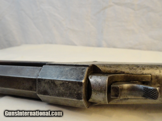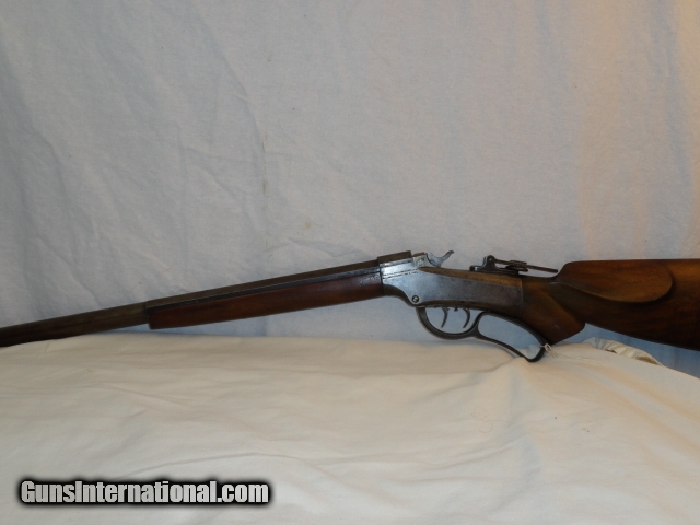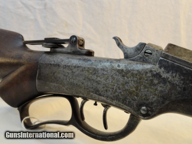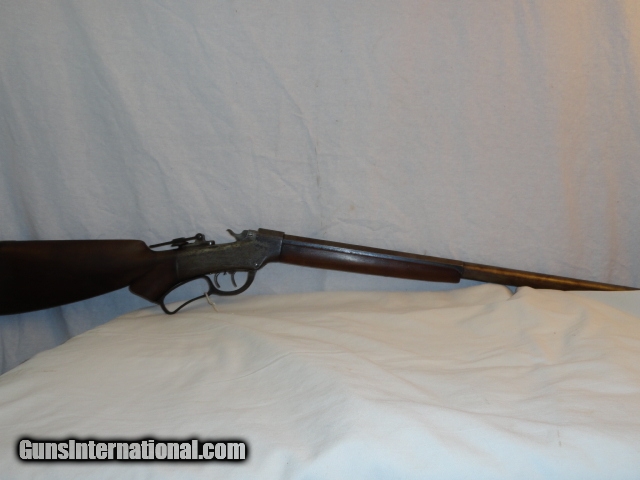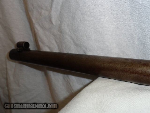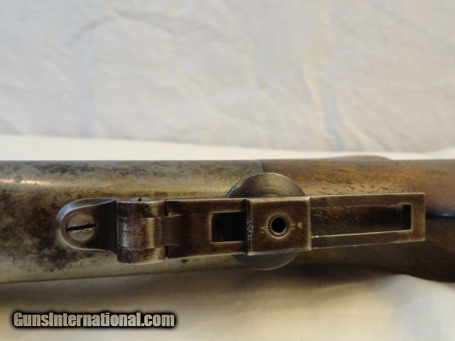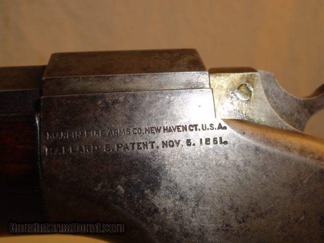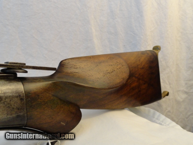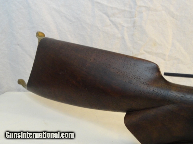Description: Offered is a Marlin Ballard single shot rifle chambered for the 38-55 cartridge. It sports a 30" heavy part octagon barrel. Single shot with lever and brass swiss butt plate. No provision in barrel for rear sight with an original tang sight and globe front. Non checkered pistol grip walnut stock. Excellent wood stocks proud to metal with good figure. Metal is basically a smooth blue gray patina. Bore has strong rifling with some abrasions. Works perfectly. Has fine double set triggers. Nice example of an early sporting heavy barrel single shot rifle. I looked at the Ballard book by Dutcher and did not find another rifle that sported the pistol grip , loop lever and double set triggers that did not have a checkered stock, only the working rifles such as the Pacific has these features Serial number 22277. Antique so can be shipped anywhere. SOLD Antique: Yes |