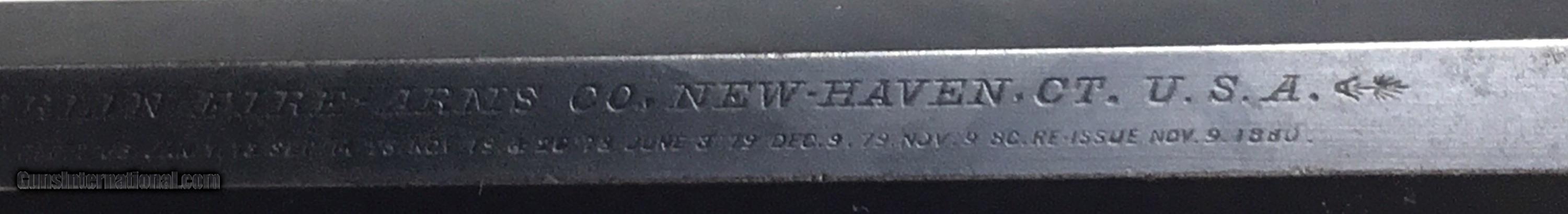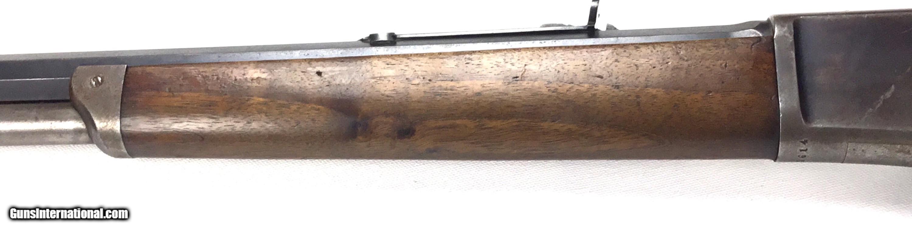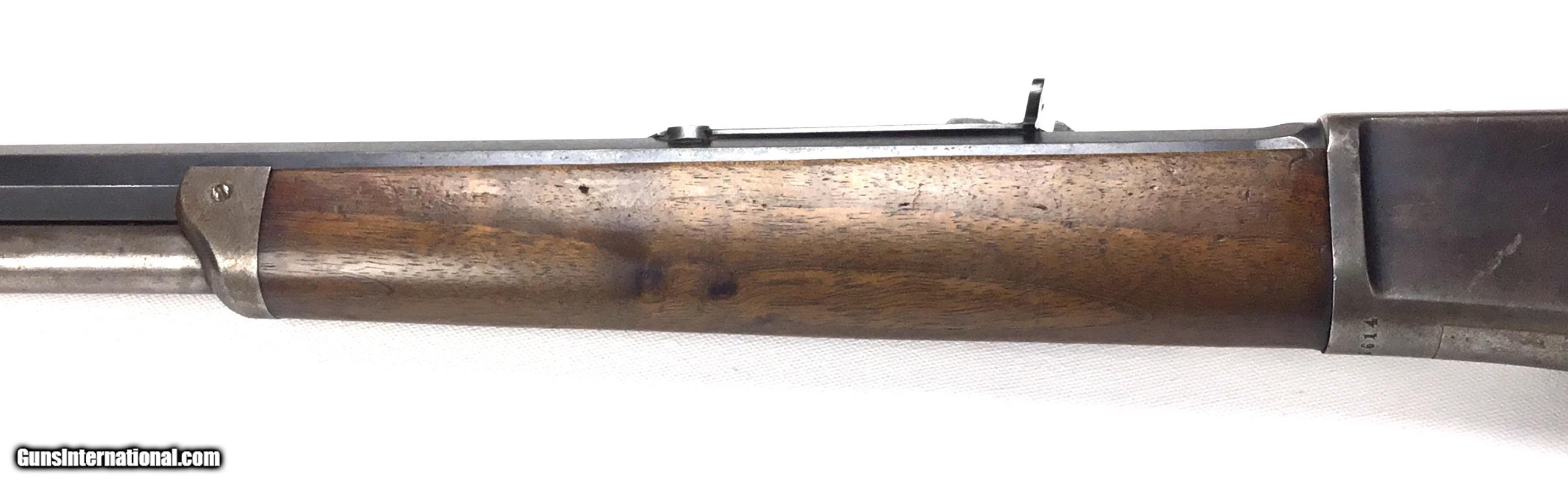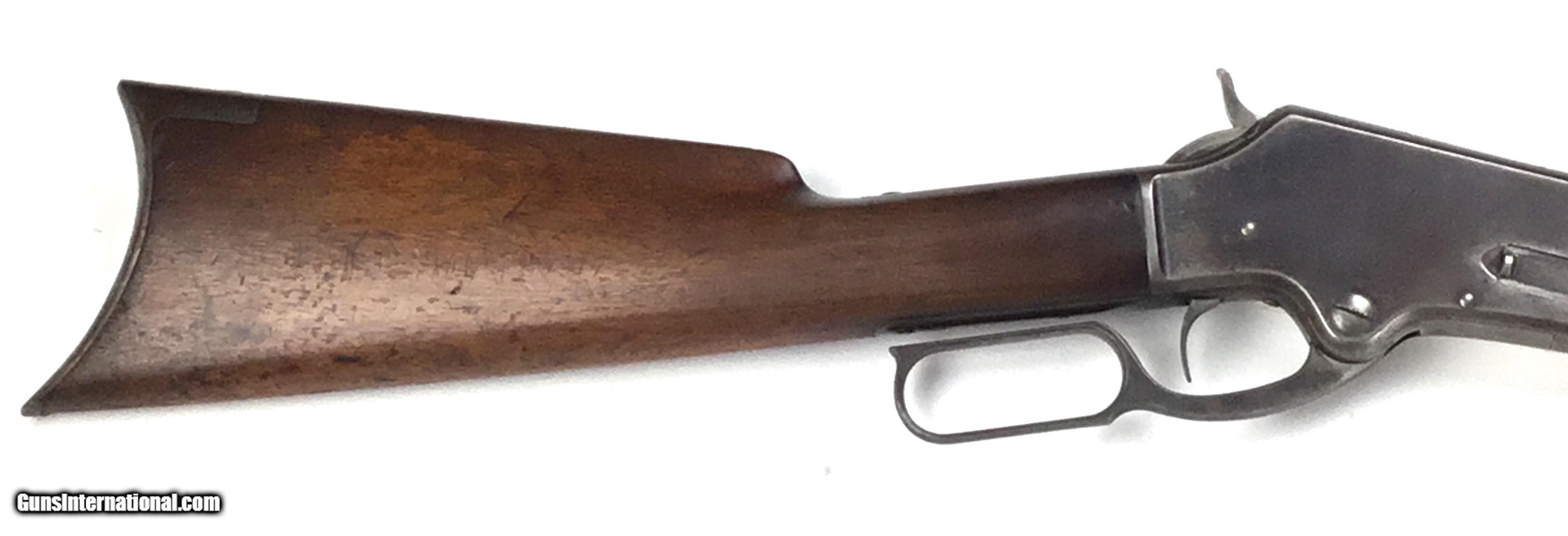 Description: MARLIN 1881 .38-55, Straight Stock with Curved Metal Butt Plate, Forearm has Two Cracks on Right Side Next to Receiver, Brass Blade Front Sight, Dovetailed Rear Sight, Manufactured by Marlin Fire-Arms Company, New Haven Connecticut Circa 1886, SN-13614, #2741, $1495.00, HAMPELSGUNCO SINCE 1919. SOLD Antique: Yes |