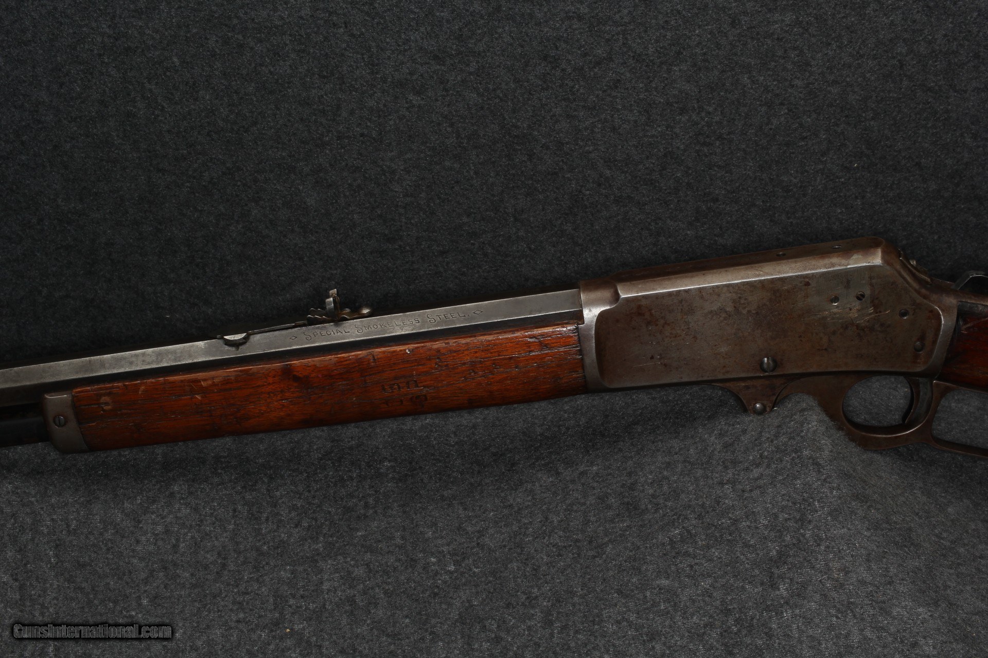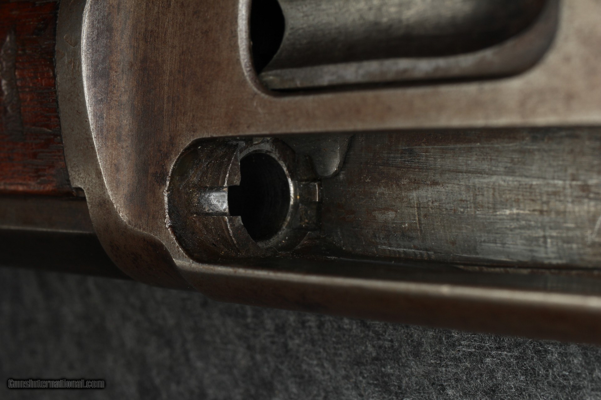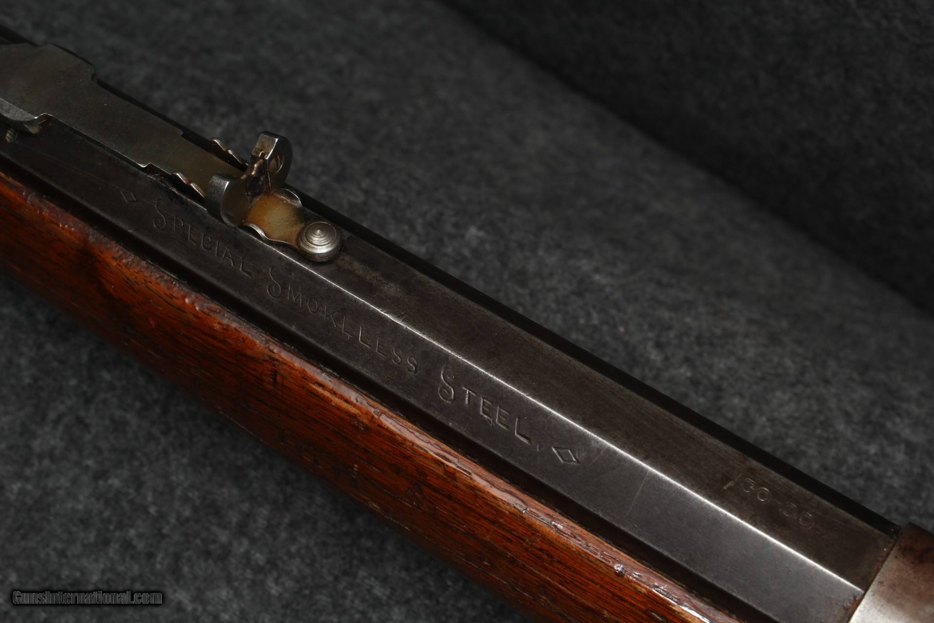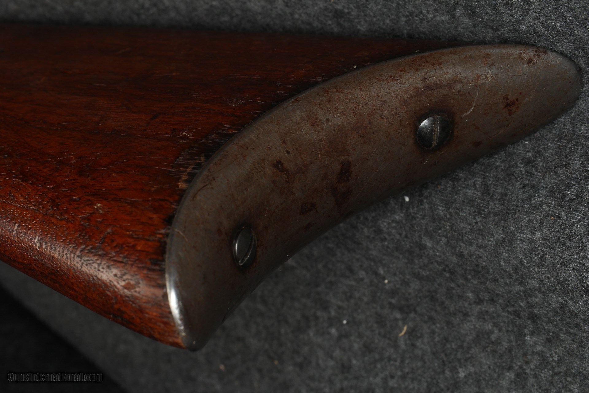 Description: 30-30 Win, serial number D51XX. 26" octagon barrel, rifle buttplate. Appears all original except for sights and finish added. Receiver light patina, no blue remains, light freckle pitting in places. Barrel 40% thinning blue with patches of light rust freckling. Magazine tube 50% blue. Aftermarket semi-buckhorn rear sight and unmarked front sight. Bore is very good, minor pitting. Sound, solid mechanical. Correct buttstock shows wear, possible finish added. "05CP" stamped on both sides of stock and forend, probable rack mark. Possible continentail railroad. Forend shows wear and continual splitting on both sides. Forend also shows softened gauging. Remains serviceable. Sold AS-IS. More photos on request. Please contact for shipping and insurance. Will ship direct to C&R holder. SOLD Curio/Relic: Yes Rifle Caliber: .30-30 Winchester |