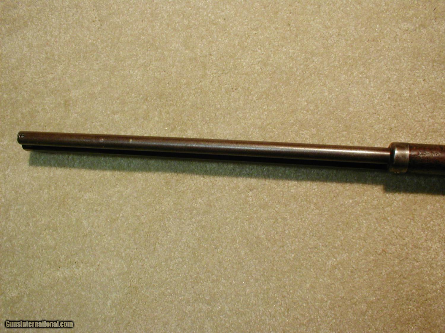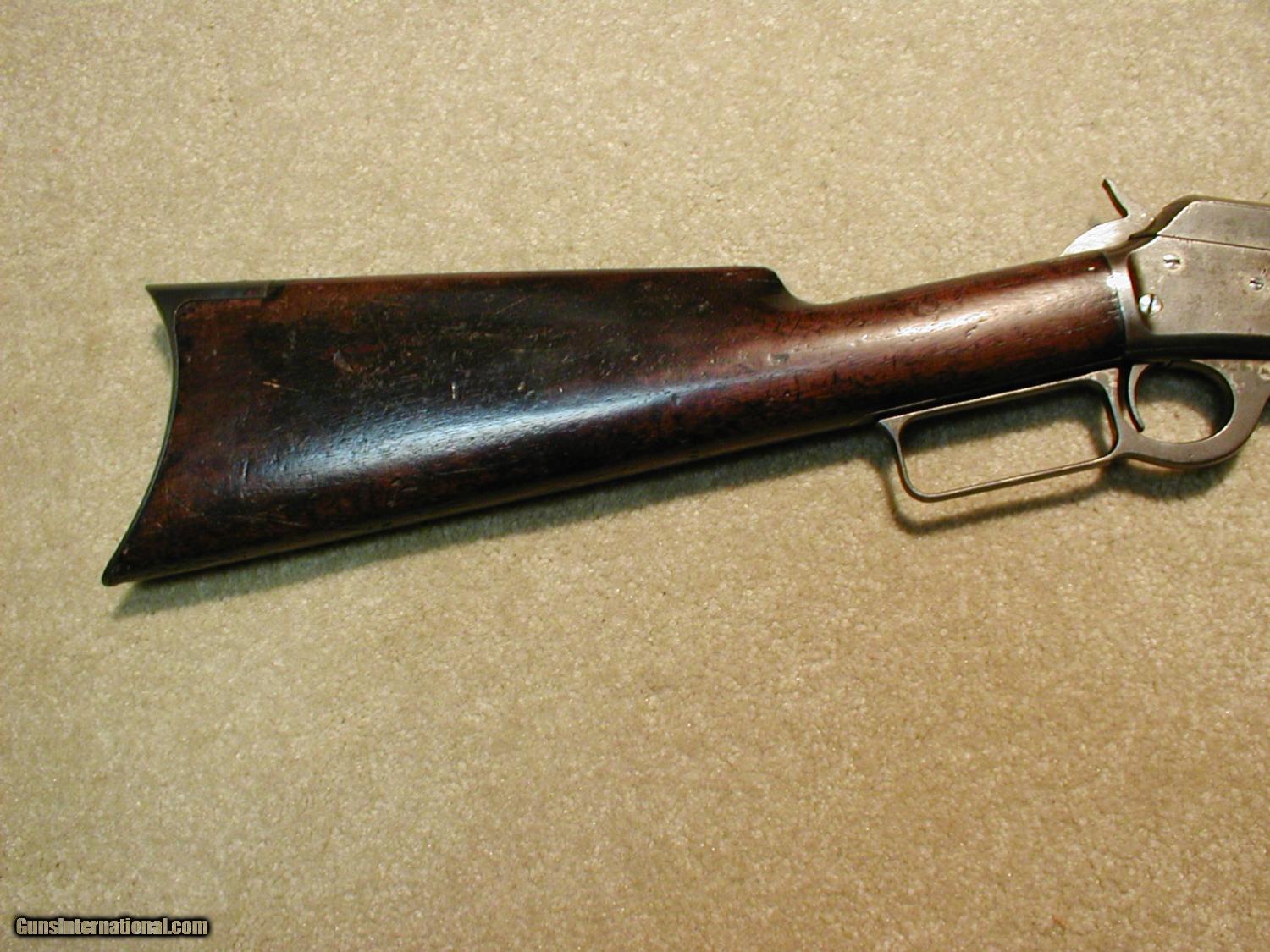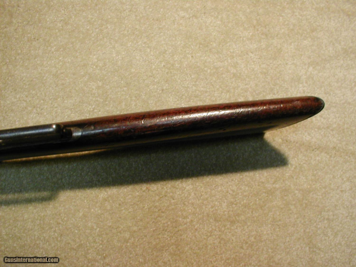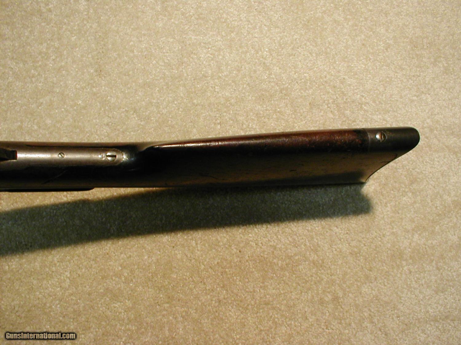 Description: EARLIEST FIRST TYPE 1893 .38-55 OCTAGON RIFLE MADE WITHOUT THE MODEL MARKING ON THE UPPER TANG, #99XXX, MADE 1894, only the first year or so of production had an unmarked upper tang after which "Model 1893" was stamped, this one came out of here in Montana and has heavy saddle wear on the left rear of the forearm (as carried over the front of a saddle by a right handed rider), still retains some very aged blue on the barrel, but is mostly an honest and uncleaned aged brown patina, fine butt stock, dark patina receiver with some blue on the loading gate, may have a couple of correctly replaced screws, original front and rear sights, tight action, bore a little dark but with good rifling all the way through, a nice uncleaned very early example that saw real hunting use in Montana! SOLD Antique: Yes Manufacturer: Marlin Model: 1893 early oct, c.1894 Serial Number: 99XXX Caliber Info: .38-55 Condition: VG-Fine |
