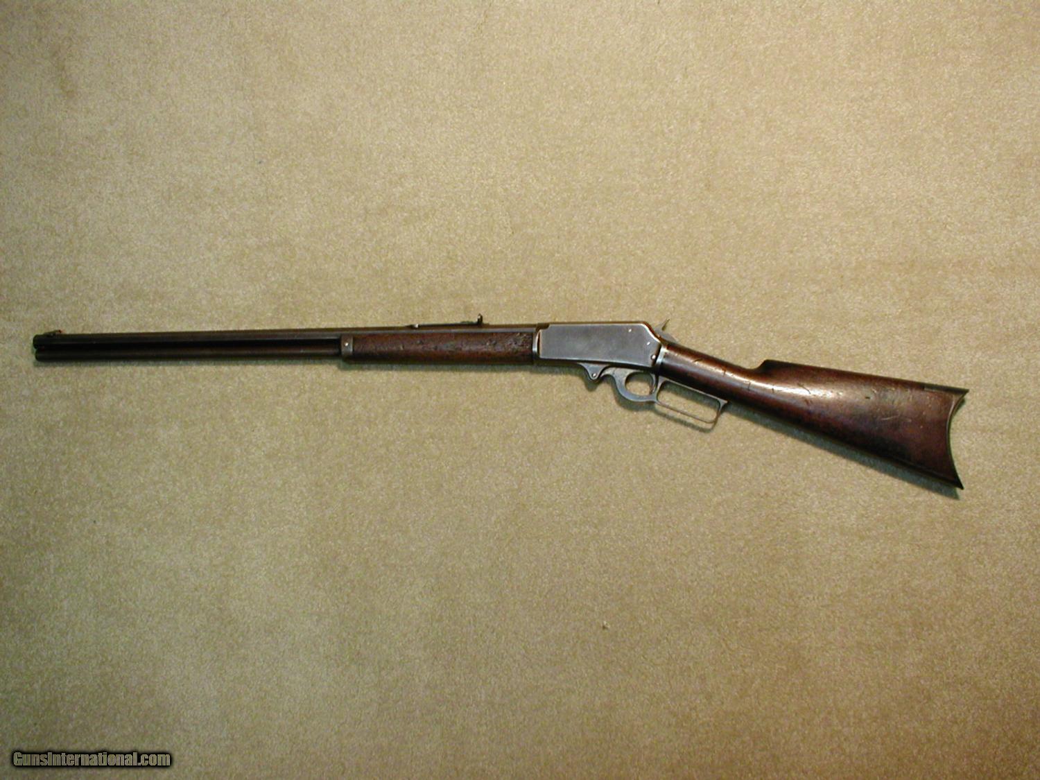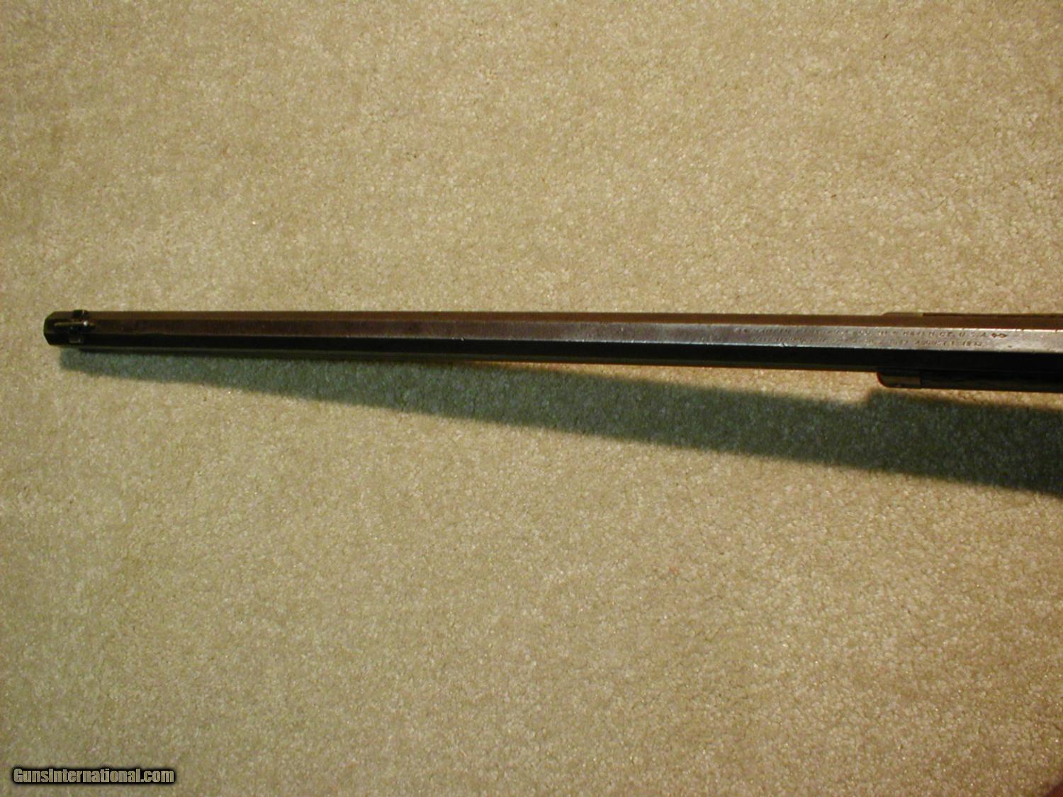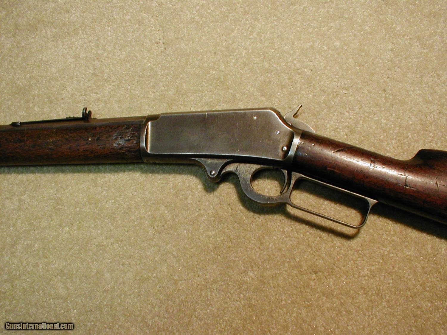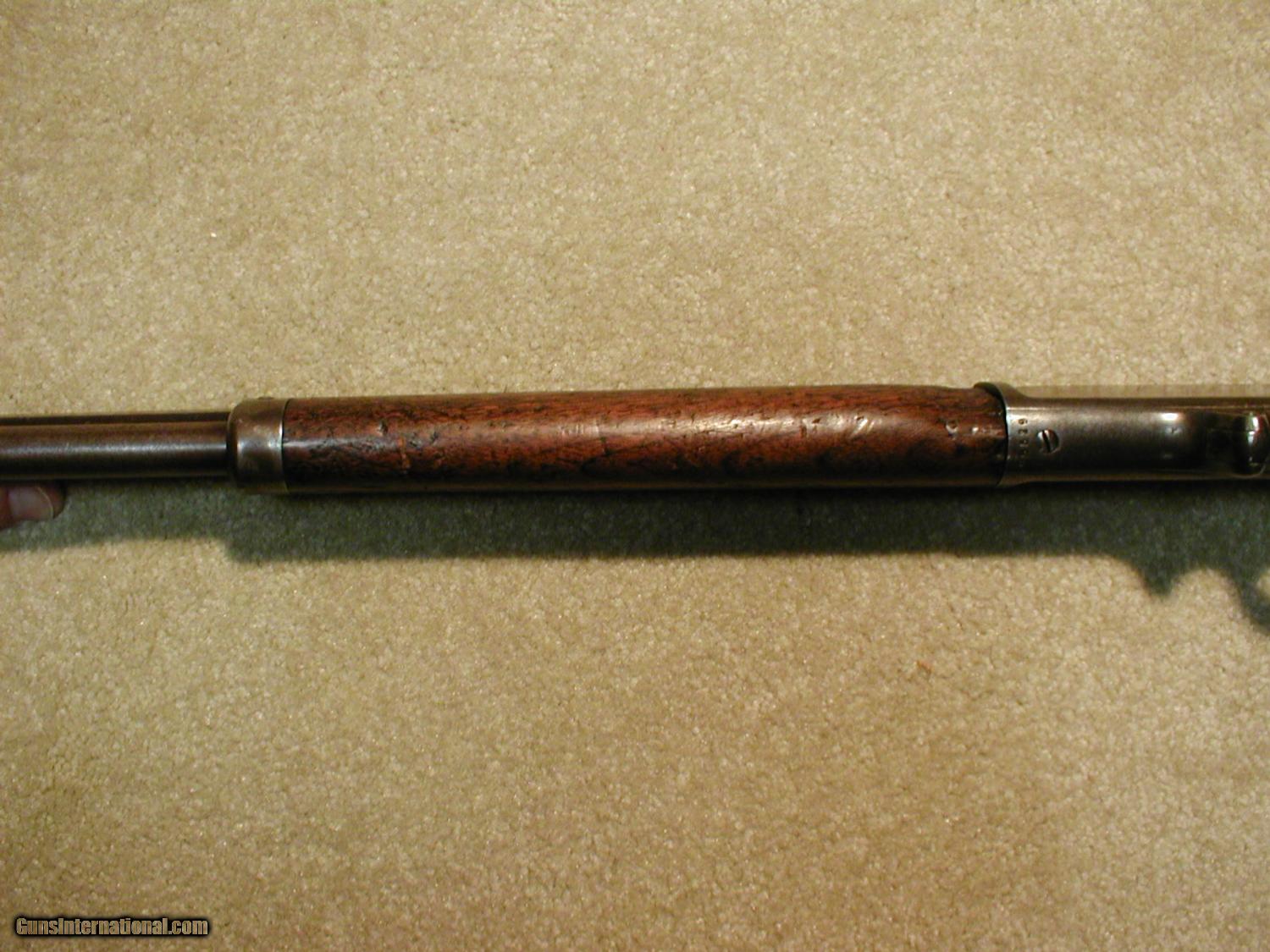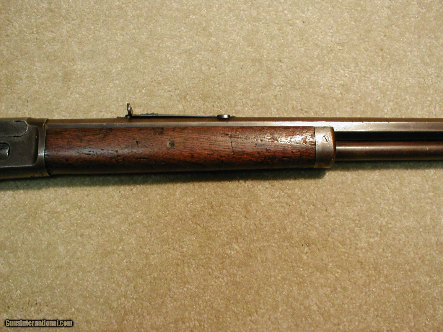 Description: EARLIEST FIRST TYPE 1893 .38-55 OCTAGON RIFLE MADE WITHOUT THE MODEL MARKING ON THE UPPER TANG, #99XXX, MADE 1894, only the first year or so of production had an unmarked upper tang after which "Model 1893" was stamped, this one came out of here in Montana and has heavy saddle wear on the left rear of the forearm (as carried over the front of a saddle by a right handed rider), still retains some very aged blue on the barrel, but is mostly an honest and uncleaned aged brown patina, fine butt stock, dark patina receiver with some blue on the loading gate, may have a couple of correctly replaced screws, original front and rear sights, tight action, bore a little dark but with good rifling all the way through, a nice uncleaned very early example that saw real hunting use in Montana! SOLD Antique: Yes Manufacturer: Marlin Model: 1893 early oct, c.1894 Serial Number: 99XXX Caliber Info: .38-55 Condition: VG-Fine |
