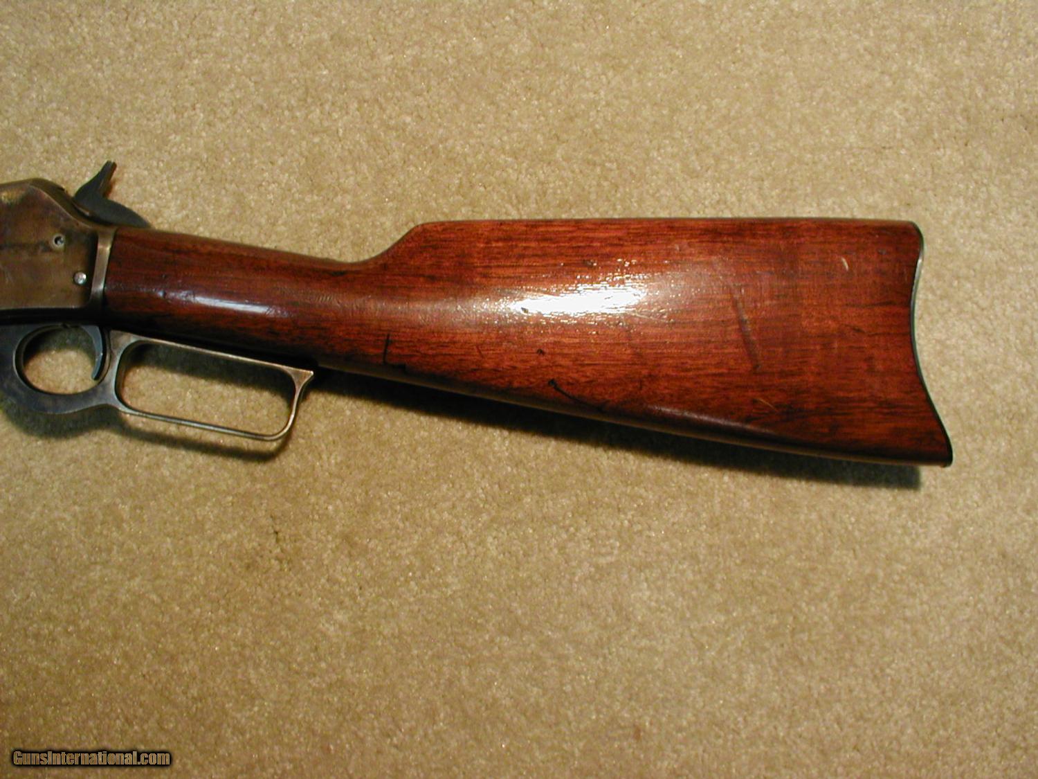 Description: 8) BEAUTIFUL CONDITION AND RARE M-93 .38-55 SPORTING CARBINE WITH 18" BARREL, also has the seldom seen MARLIN FIREARMS CORPORATION barrel address that was only used from 1922 to 1924, very unusual to find a carbine in this caliber at this late date as by this time most were .30-30 or .32WS, exc. barrel and mag. blue. correct 2/3 mag., exc. markings, vivid case colors showing only minor age/fading, exc. blue on the butt plate and barrel band with only edge wear, exc. wood, buckhorn rear sight with blade/bead front sight, MINT BORE, exc. markings with Special Smokeless Steel marking on the barrel. SOLD Curio/Relic: Yes Manufacturer: Marlin Model: M-93 18" Sporting Carbine Serial Number: L 8XX Caliber Info: 38-55 Condition: Excellent |