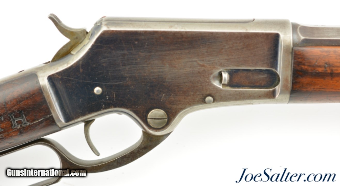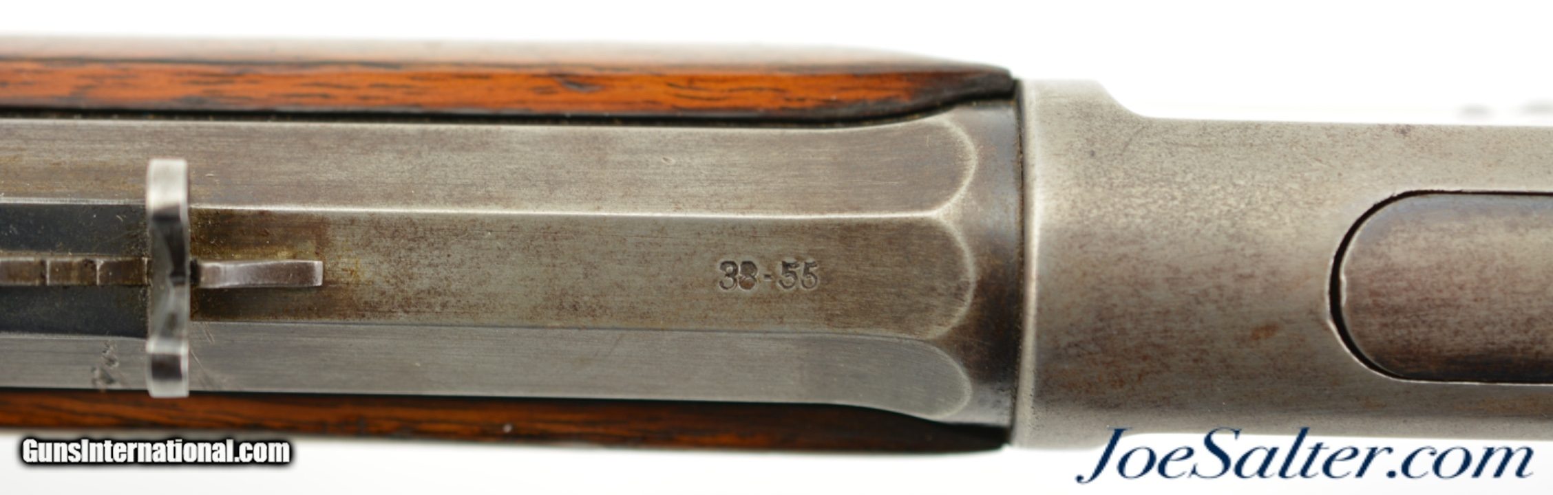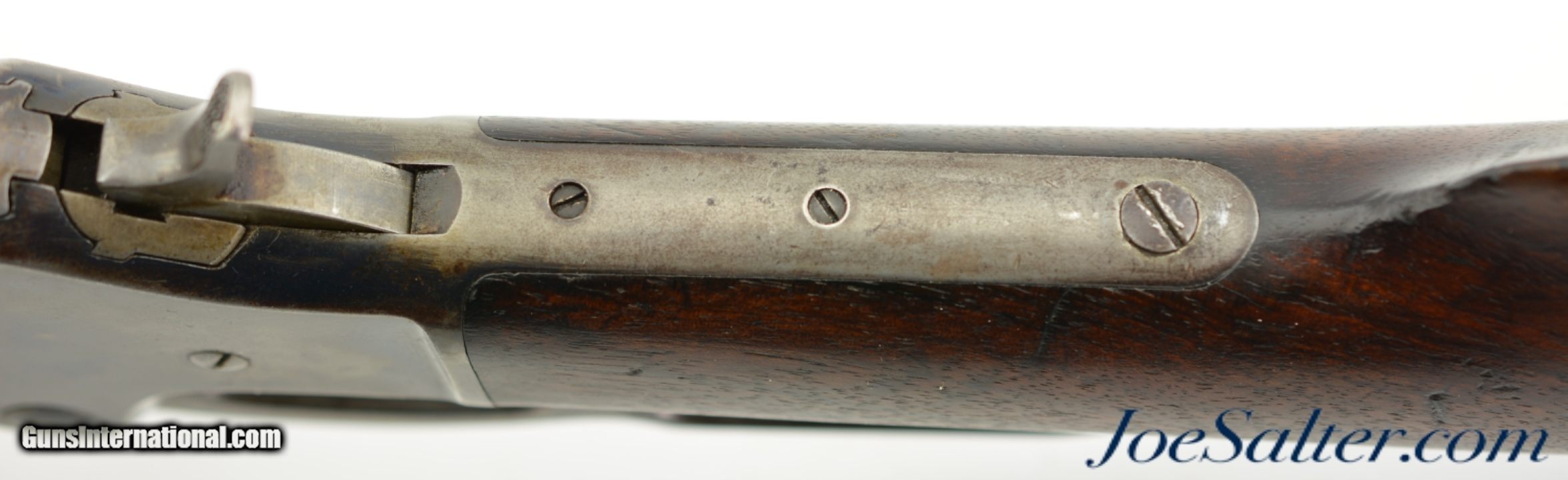 Description: Serial #14068, .38-55, 24" octagon barrel with a fine, bright bore that has some trace freckling within the grooves. This is a great looking rifle that has some of the original blue remaining on the protected areas of the barrel and magazine tube. The frame retains about 30-40% of the original blue finish, with the balance either faded to speckled gray, or lightly cleaned to a dull pewter gray patina. Some bright fire blue can still be seen on the loading gate, and muted color case-hardening is still just visible on the lever. The walnut forend and buttstock are in very good condition with minor handling marks scattered about the original oil finish, and a short, with-the-grain crack at the frame juncture of the wrist on the right side. A previous owner stamped their name in neat block letters on the right side of the wrist as well: "S.P. HEATH." The action functions smoothly and fully, and the rifle rates fine plus overall. Antique; SOLD |