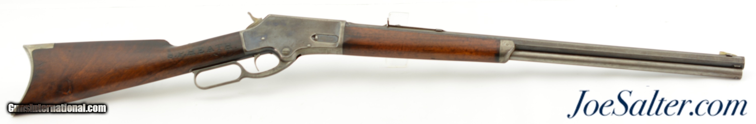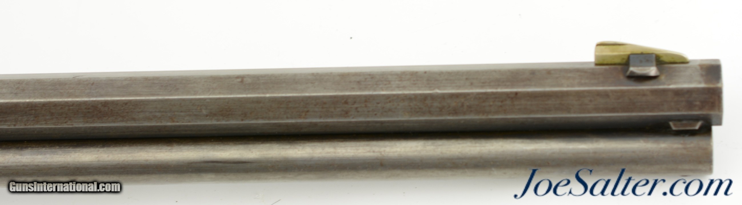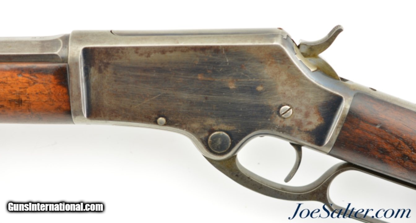 Description: Serial #14068, .38-55, 24" octagon barrel with a fine, bright bore that has some trace freckling within the grooves. This is a great looking rifle that has some of the original blue remaining on the protected areas of the barrel and magazine tube. The frame retains about 30-40% of the original blue finish, with the balance either faded to speckled gray, or lightly cleaned to a dull pewter gray patina. Some bright fire blue can still be seen on the loading gate, and muted color case-hardening is still just visible on the lever. The walnut forend and buttstock are in very good condition with minor handling marks scattered about the original oil finish, and a short, with-the-grain crack at the frame juncture of the wrist on the right side. A previous owner stamped their name in neat block letters on the right side of the wrist as well: "S.P. HEATH." The action functions smoothly and fully, and the rifle rates fine plus overall. Antique; SOLD |
