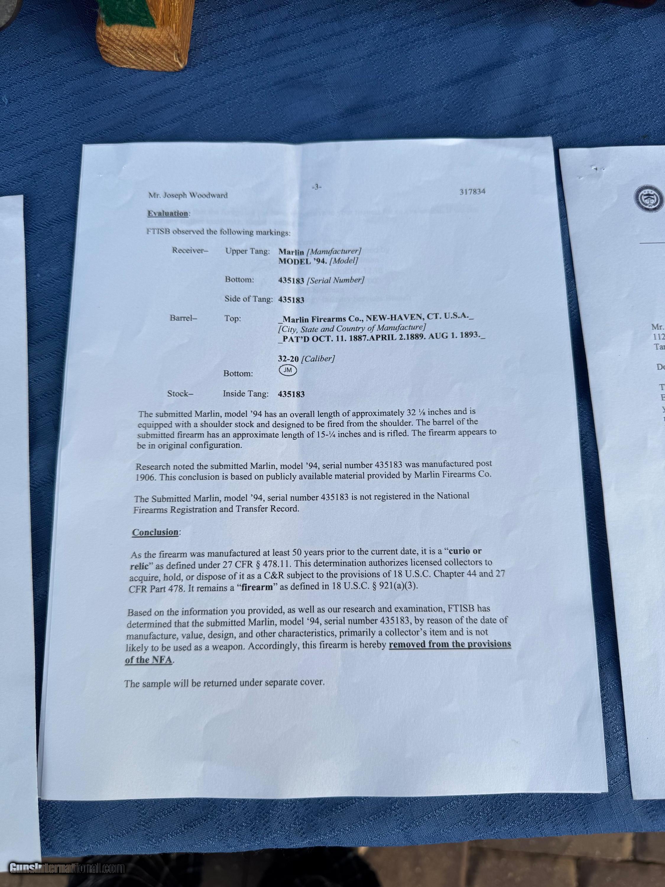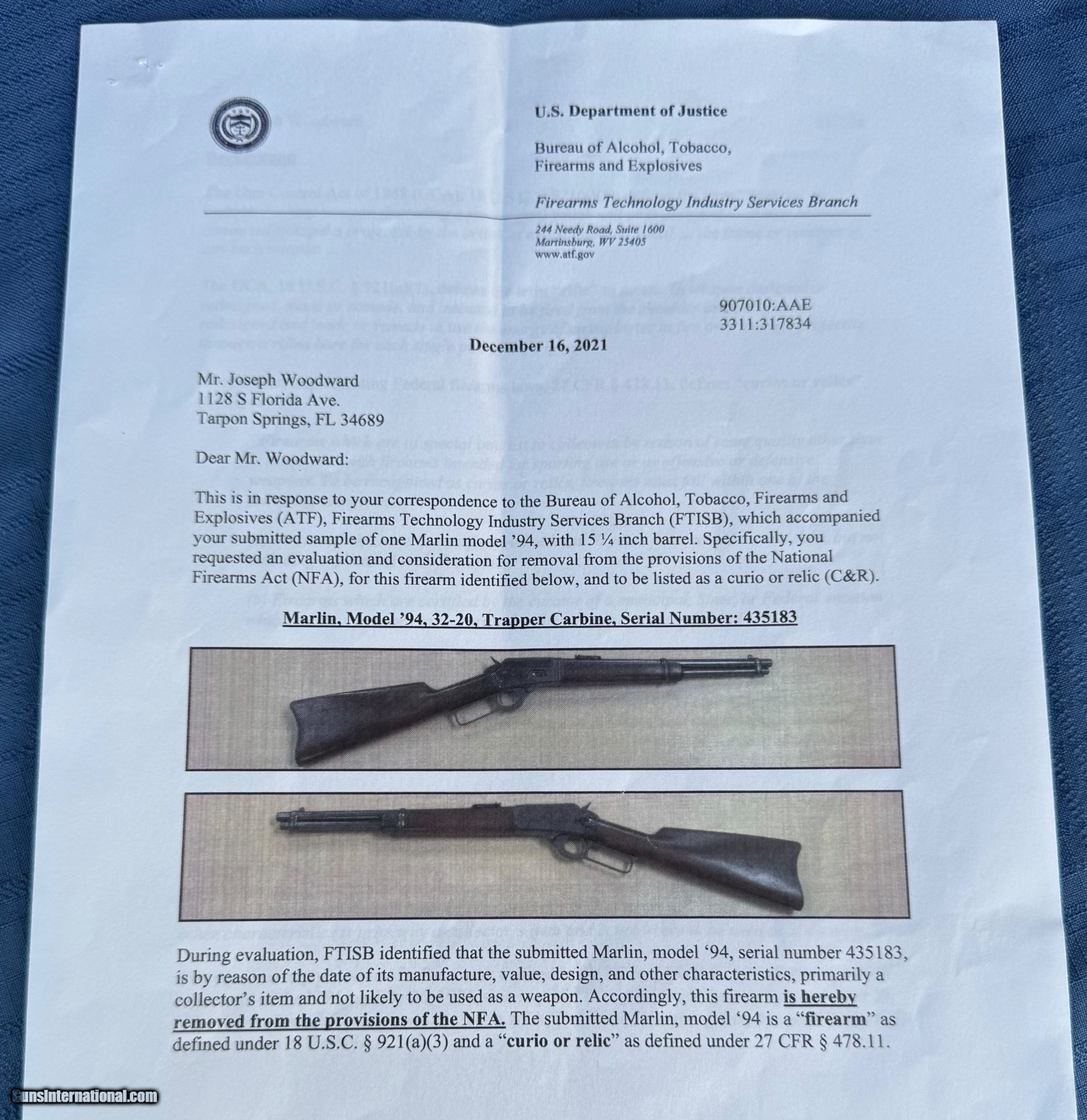 MARLIN Model 1894 TRAPPER 15” ATF CLEARED