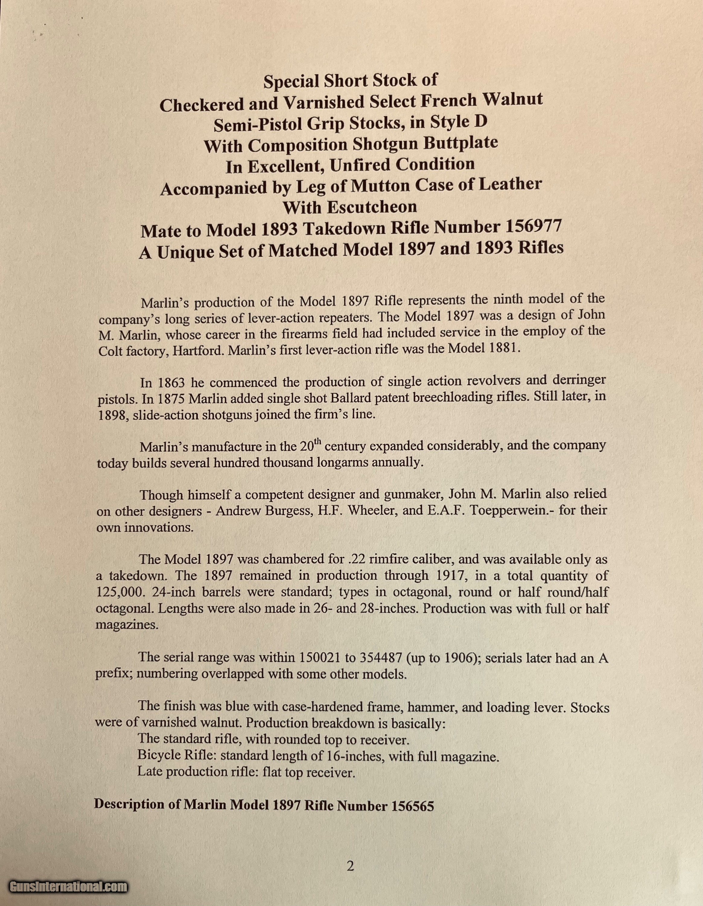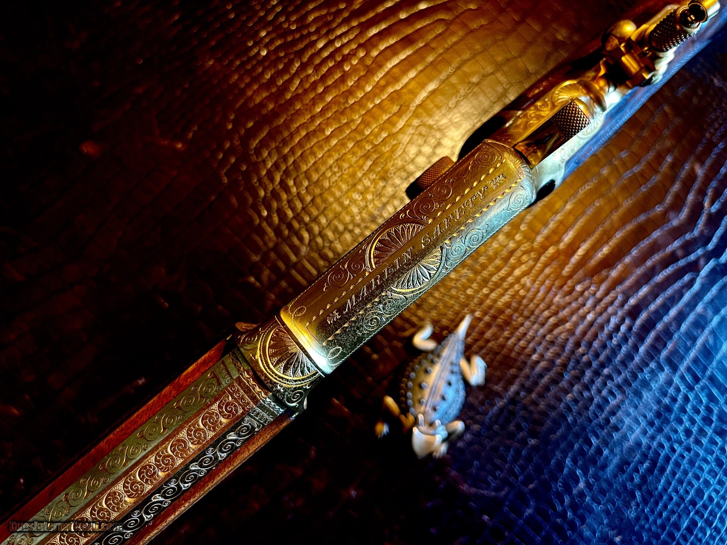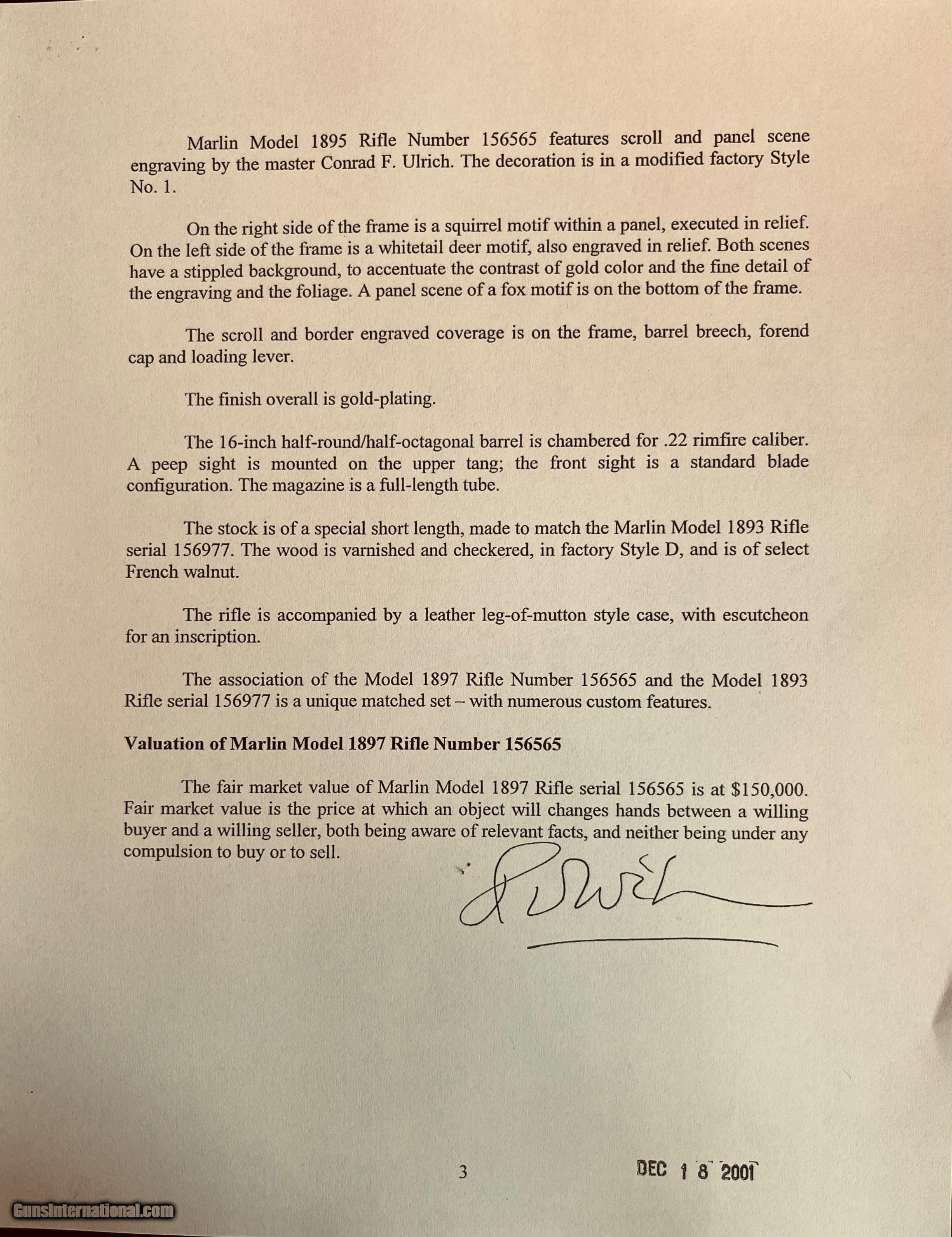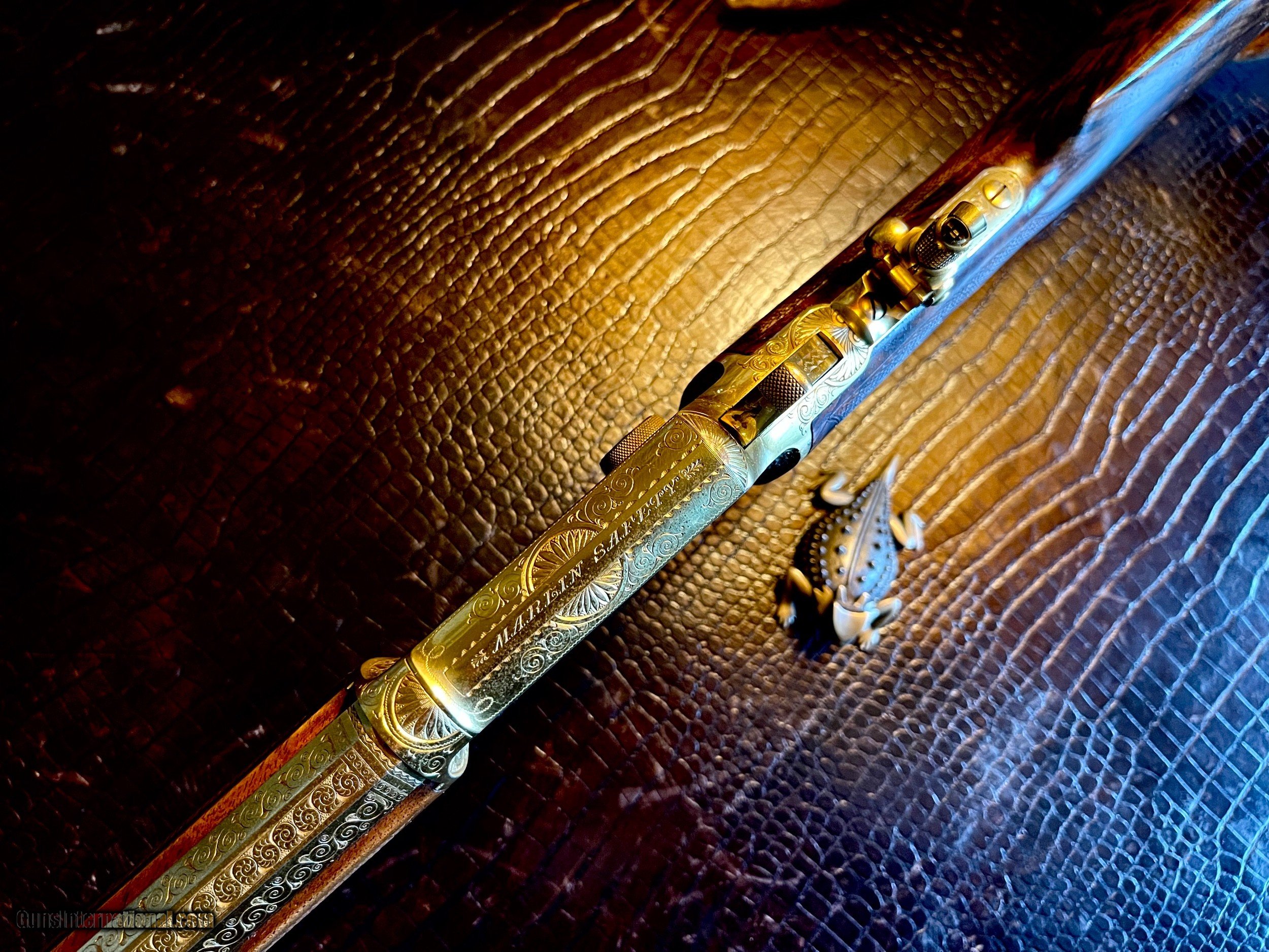 Description: *****SOLD SOLD SOLD***** Marlin Model 1897 Lever Action Rifle - Serial Number 156565 - Scroll and Panel-Scene Engraved by Conrad F. Ulrich - Modified Style No. 1 Engraving R.L. Wilson Letter Data and Description: (leg-o-mutton case is displaced and not included) "Marlin Model 1897 Lever Action Rifle - Serial Number 156565 - Scroll and Panel-Scene Engraved by Conrad F. Ulrich - Modified Style No. 1 Engraving - Squirrel Motif Relief Engraved Panel Scene on Right Side of Frame - Whitetail Deer Relief Engraved Panel Sceneon Left Side of Frame - Both Scenes with Stippled Background - Fox Panel Scene on Bottom of Frame - Engraved Frame, Barrel Breech, Forend Cap, and Loading Lever - Gold-Plated Finish Overall - 16-inch Half Round/Half Octagonal Barrel, .22 Rimfire Caliber - Tang Peep Sight, with Blade Front Sight - Full-Length Tubular Magazine. Special Short Stock of Checkered and Varnished Select French Walnut - Semi-Pistol Grip Stocks, in Style D With Composition Shotgun Buttplate - In Excellent, Unfired Condition - Accompanied by Leg of Mutton Case of Leather with Escutcheon Mate to Model 1893 Takedown Rifle Number 156977 A Unique Set of Matched Model 1897 and 1893 Rifles" As stated in Cowan's Description: .22LR caliber, 16" half-octagonal barrel, S/N 156565. Gold-plated finish, full-length magazine, deluxe D-grade checkered highly figured walnut stock with pistol grip and checkered hard rubber Marlin buttplate, checkered fore-end. Two-line barrel marking: MARLIN FIRE-ARMS CO. NEW-HAVEN, CT U.S.A. / PAT'D JAN. 1887. APRIL 2, 1889, AUGUST 12, 1890. March 1, 1892. Top of receiver marked MARLIN SAFETY, tang marked MODEL / 1897 under peep sight base. Adjustable peep tang sight, dovetailed blade front sight with ivory bead. Receiver profusely engraved with flowing Arabesque foliate scrolls with punch-dot shading with a dot-matted central panel in low relief on the reverse showing a buck in full flight, with the obverse panel depicting two squirrels in a tree as the central theme the panel in low relief. A small circular panel on the bottom of the receiver depicts a wolf's head. All of the surrounding metal shows the foliate scrolls, which extend about 3.5" onto the barrel, with the lever and hammer adorned with geometric border patterns. The upper receiver combines the scrolls with starburst foliate patterns and geometric borders. The work is most likely that of Conrad Ulrich Jr. who worked at Marlin during this period as their master engraver. This is one of the very finest and rarest of all decorated Marlins, an exhibition gold-plated and engraved Marlin Model 1897 rifle that is the ultimate in a .22 caliber antique lever action. This gun shipped on the same day, November 10, 1897 as the Ulrich engraved gold Model 1893 rifle offered in this sale. These splendid rifles were likely produced for display at the California Golden Jubilee held in San Francisco January 24-29, 1898, hence their brilliant arresting gold finish and the superb exhibition quality engraving. Condition: Excellent. Retains nearly all of the gold plating with only the most minor thinning, perfect markings . Mint bore and action. The stocks with nearly all the factory high polish piano varnish finish.The most remarkable and beautiful antique Marlin it has been our pleasure Further Disclosures: please read attached documents in photos for all data available... **scroll down for specs** Quillen & Worfe Fine Guns Disclosures and Important Information: