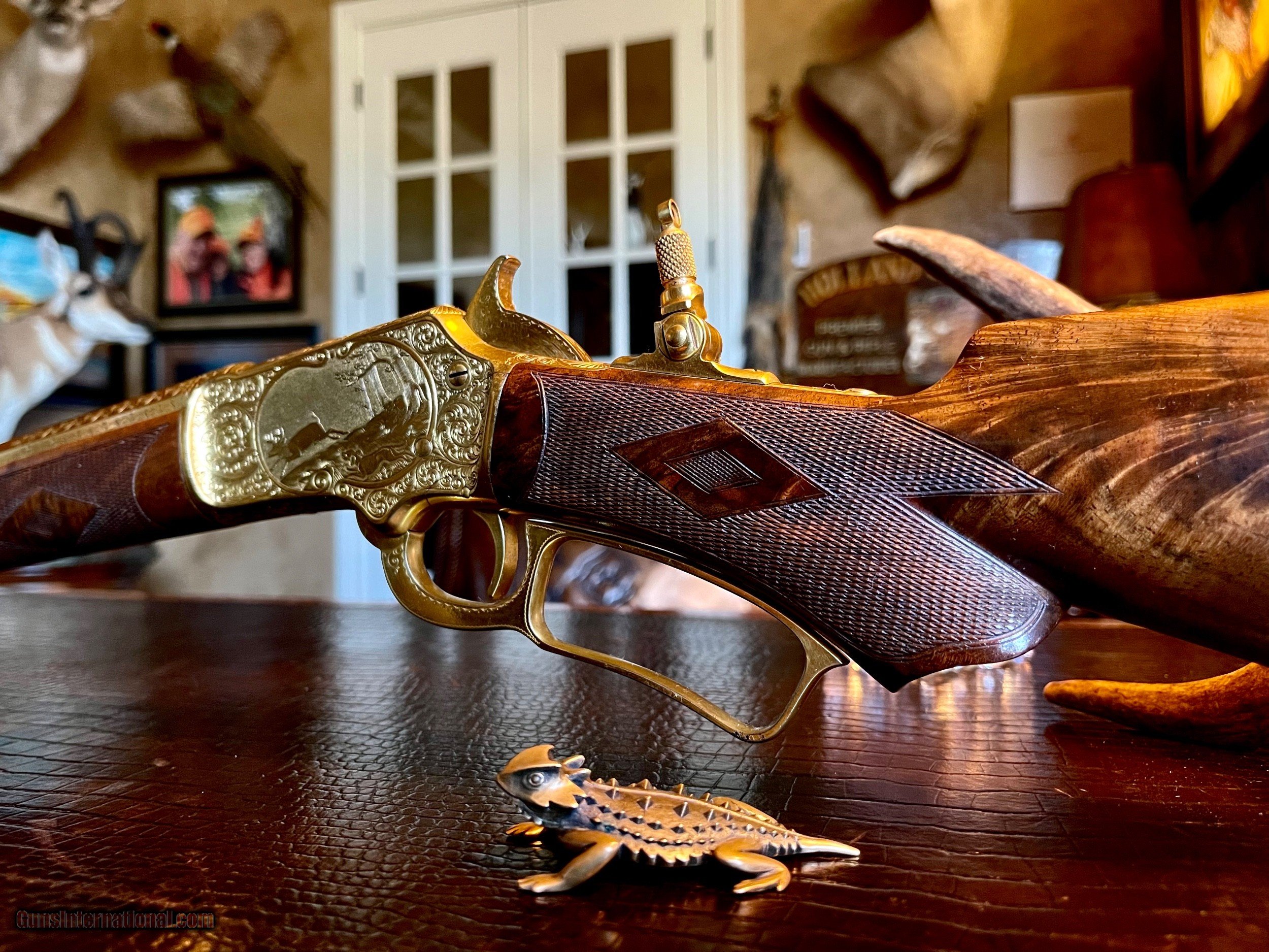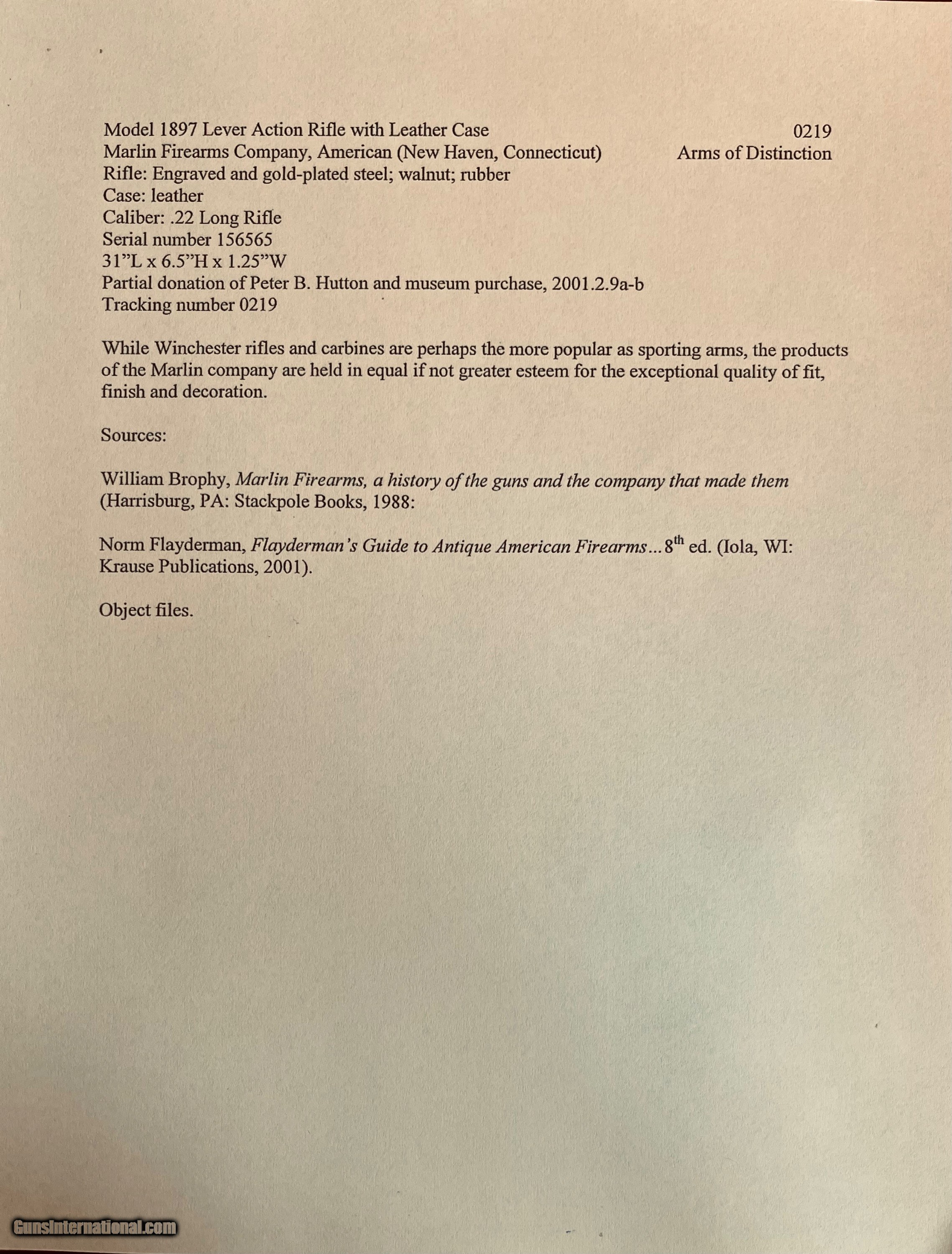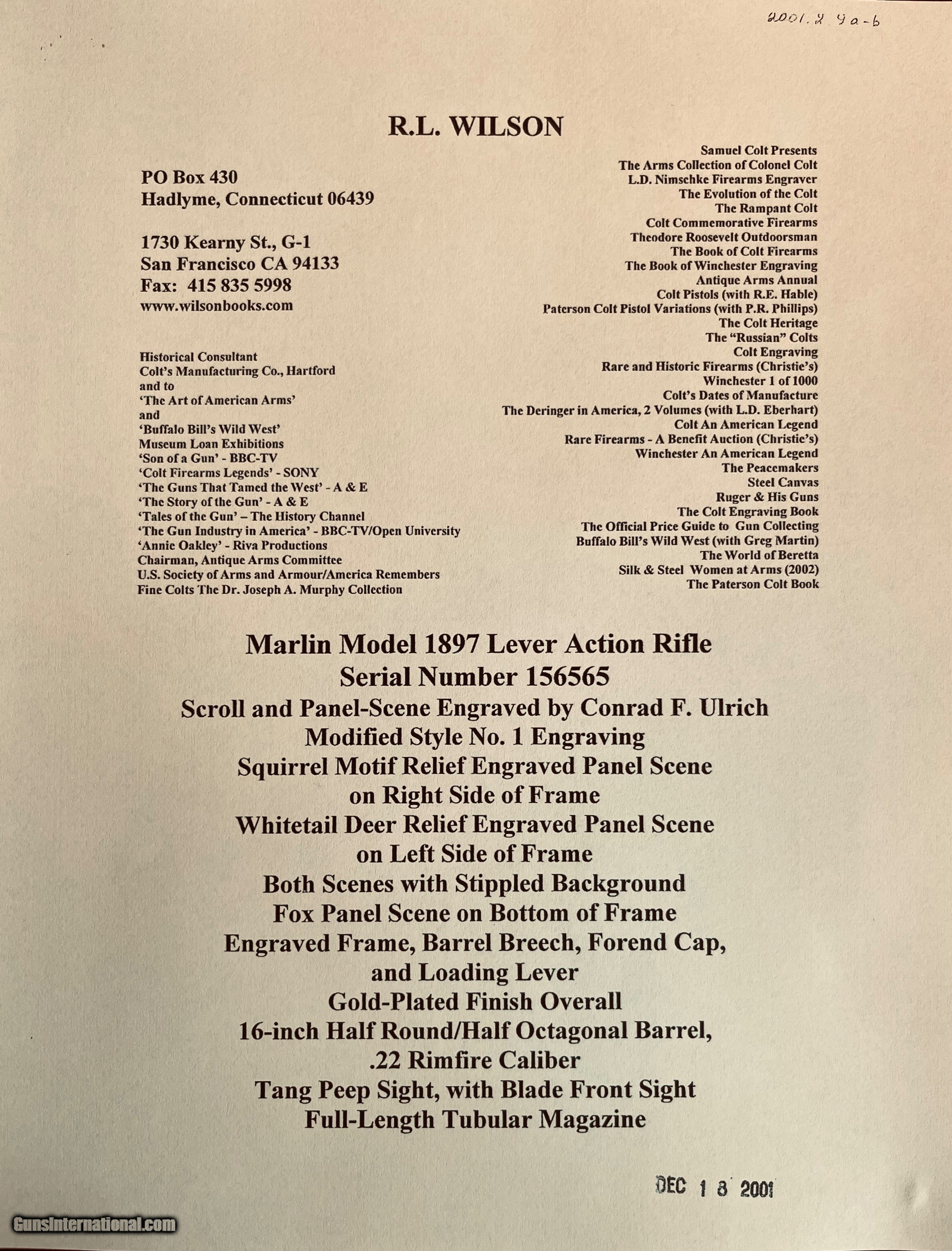 Description: *****SOLD SOLD SOLD***** Marlin Model 1897 Lever Action Rifle - Serial Number 156565 - Scroll and Panel-Scene Engraved by Conrad F. Ulrich - Modified Style No. 1 Engraving R.L. Wilson Letter Data and Description: (leg-o-mutton case is displaced and not included) "Marlin Model 1897 Lever Action Rifle - Serial Number 156565 - Scroll and Panel-Scene Engraved by Conrad F. Ulrich - Modified Style No. 1 Engraving - Squirrel Motif Relief Engraved Panel Scene on Right Side of Frame - Whitetail Deer Relief Engraved Panel Sceneon Left Side of Frame - Both Scenes with Stippled Background - Fox Panel Scene on Bottom of Frame - Engraved Frame, Barrel Breech, Forend Cap, and Loading Lever - Gold-Plated Finish Overall - 16-inch Half Round/Half Octagonal Barrel, .22 Rimfire Caliber - Tang Peep Sight, with Blade Front Sight - Full-Length Tubular Magazine. Special Short Stock of Checkered and Varnished Select French Walnut - Semi-Pistol Grip Stocks, in Style D With Composition Shotgun Buttplate - In Excellent, Unfired Condition - Accompanied by Leg of Mutton Case of Leather with Escutcheon Mate to Model 1893 Takedown Rifle Number 156977 A Unique Set of Matched Model 1897 and 1893 Rifles" As stated in Cowan's Description: .22LR caliber, 16" half-octagonal barrel, S/N 156565. Gold-plated finish, full-length magazine, deluxe D-grade checkered highly figured walnut stock with pistol grip and checkered hard rubber Marlin buttplate, checkered fore-end. Two-line barrel marking: MARLIN FIRE-ARMS CO. NEW-HAVEN, CT U.S.A. / PAT'D JAN. 1887. APRIL 2, 1889, AUGUST 12, 1890. March 1, 1892. Top of receiver marked MARLIN SAFETY, tang marked MODEL / 1897 under peep sight base. Adjustable peep tang sight, dovetailed blade front sight with ivory bead. Receiver profusely engraved with flowing Arabesque foliate scrolls with punch-dot shading with a dot-matted central panel in low relief on the reverse showing a buck in full flight, with the obverse panel depicting two squirrels in a tree as the central theme the panel in low relief. A small circular panel on the bottom of the receiver depicts a wolf's head. All of the surrounding metal shows the foliate scrolls, which extend about 3.5" onto the barrel, with the lever and hammer adorned with geometric border patterns. The upper receiver combines the scrolls with starburst foliate patterns and geometric borders. The work is most likely that of Conrad Ulrich Jr. who worked at Marlin during this period as their master engraver. This is one of the very finest and rarest of all decorated Marlins, an exhibition gold-plated and engraved Marlin Model 1897 rifle that is the ultimate in a .22 caliber antique lever action. This gun shipped on the same day, November 10, 1897 as the Ulrich engraved gold Model 1893 rifle offered in this sale. These splendid rifles were likely produced for display at the California Golden Jubilee held in San Francisco January 24-29, 1898, hence their brilliant arresting gold finish and the superb exhibition quality engraving. Condition: Excellent. Retains nearly all of the gold plating with only the most minor thinning, perfect markings . Mint bore and action. The stocks with nearly all the factory high polish piano varnish finish.The most remarkable and beautiful antique Marlin it has been our pleasure Further Disclosures: please read attached documents in photos for all data available... **scroll down for specs** Quillen & Worfe Fine Guns Disclosures and Important Information:
