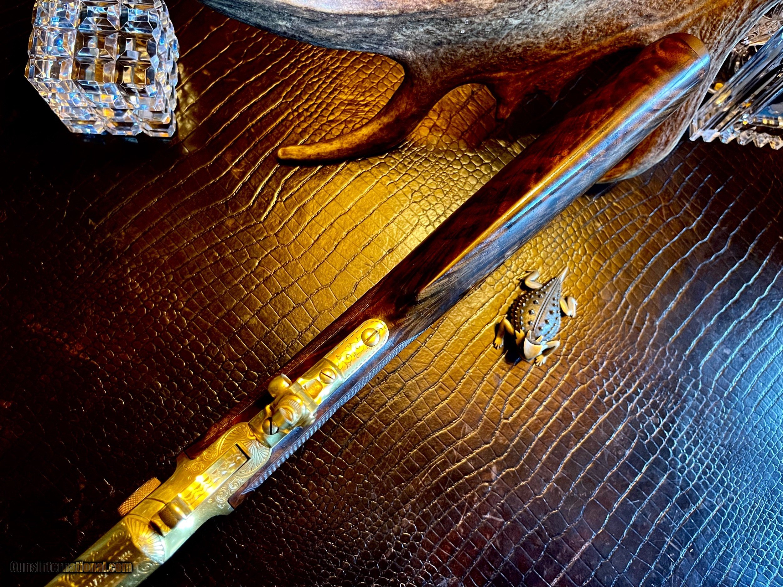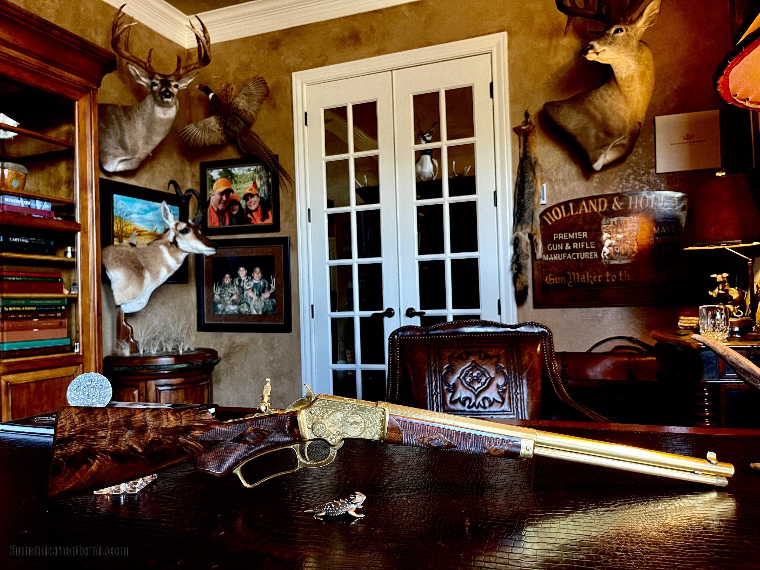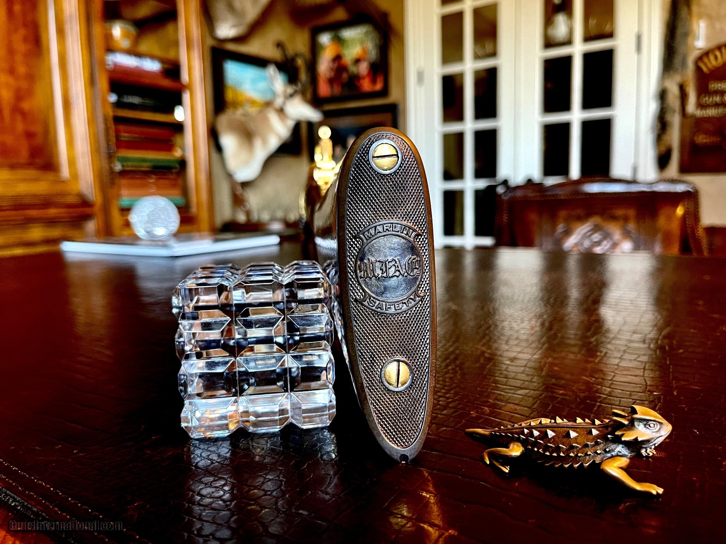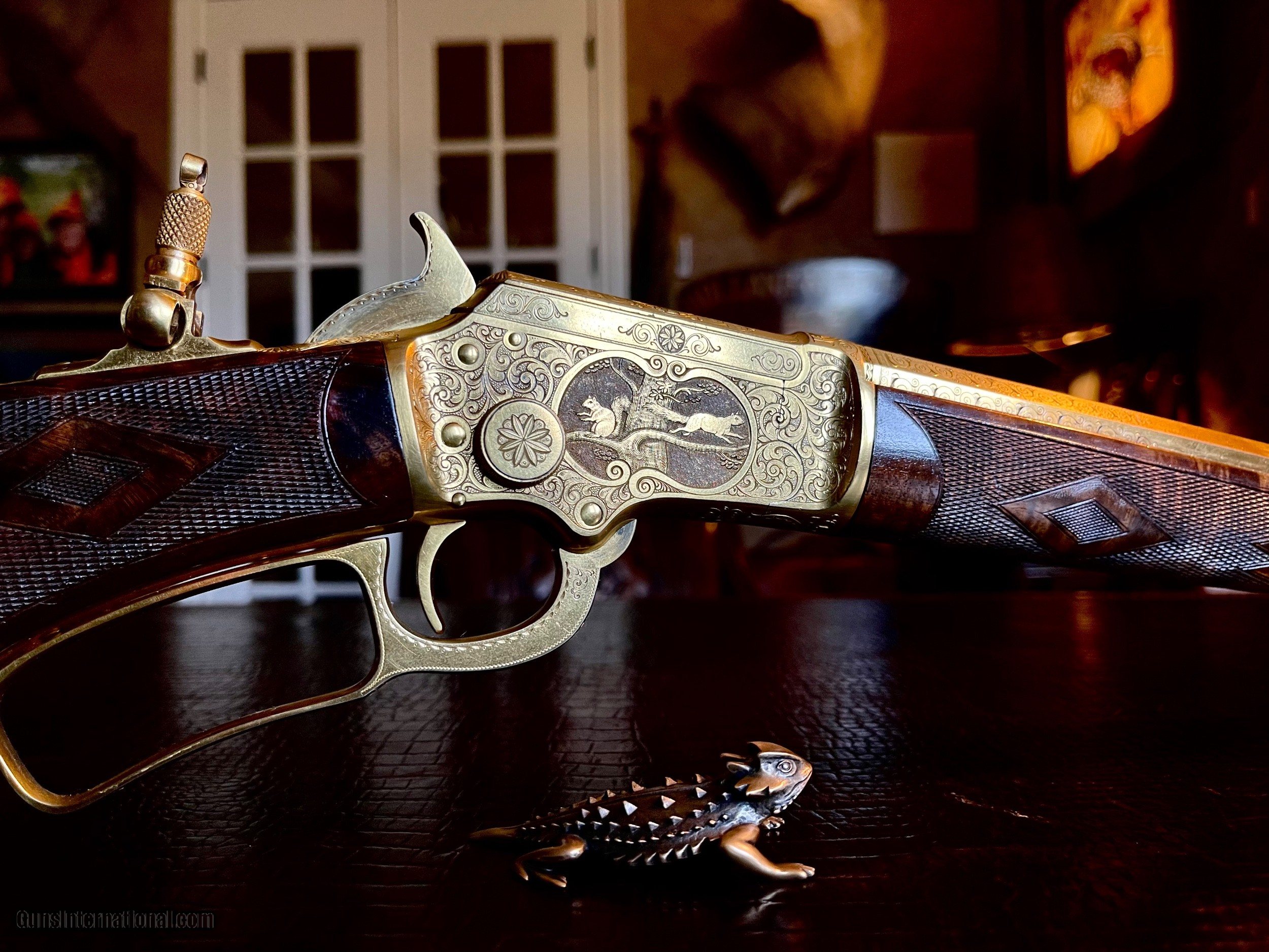 Description: *****SOLD SOLD SOLD***** Marlin Model 1897 Lever Action Rifle - Serial Number 156565 - Scroll and Panel-Scene Engraved by Conrad F. Ulrich - Modified Style No. 1 Engraving R.L. Wilson Letter Data and Description: (leg-o-mutton case is displaced and not included) "Marlin Model 1897 Lever Action Rifle - Serial Number 156565 - Scroll and Panel-Scene Engraved by Conrad F. Ulrich - Modified Style No. 1 Engraving - Squirrel Motif Relief Engraved Panel Scene on Right Side of Frame - Whitetail Deer Relief Engraved Panel Sceneon Left Side of Frame - Both Scenes with Stippled Background - Fox Panel Scene on Bottom of Frame - Engraved Frame, Barrel Breech, Forend Cap, and Loading Lever - Gold-Plated Finish Overall - 16-inch Half Round/Half Octagonal Barrel, .22 Rimfire Caliber - Tang Peep Sight, with Blade Front Sight - Full-Length Tubular Magazine. Special Short Stock of Checkered and Varnished Select French Walnut - Semi-Pistol Grip Stocks, in Style D With Composition Shotgun Buttplate - In Excellent, Unfired Condition - Accompanied by Leg of Mutton Case of Leather with Escutcheon Mate to Model 1893 Takedown Rifle Number 156977 A Unique Set of Matched Model 1897 and 1893 Rifles" As stated in Cowan's Description: .22LR caliber, 16" half-octagonal barrel, S/N 156565. Gold-plated finish, full-length magazine, deluxe D-grade checkered highly figured walnut stock with pistol grip and checkered hard rubber Marlin buttplate, checkered fore-end. Two-line barrel marking: MARLIN FIRE-ARMS CO. NEW-HAVEN, CT U.S.A. / PAT'D JAN. 1887. APRIL 2, 1889, AUGUST 12, 1890. March 1, 1892. Top of receiver marked MARLIN SAFETY, tang marked MODEL / 1897 under peep sight base. Adjustable peep tang sight, dovetailed blade front sight with ivory bead. Receiver profusely engraved with flowing Arabesque foliate scrolls with punch-dot shading with a dot-matted central panel in low relief on the reverse showing a buck in full flight, with the obverse panel depicting two squirrels in a tree as the central theme the panel in low relief. A small circular panel on the bottom of the receiver depicts a wolf's head. All of the surrounding metal shows the foliate scrolls, which extend about 3.5" onto the barrel, with the lever and hammer adorned with geometric border patterns. The upper receiver combines the scrolls with starburst foliate patterns and geometric borders. The work is most likely that of Conrad Ulrich Jr. who worked at Marlin during this period as their master engraver. This is one of the very finest and rarest of all decorated Marlins, an exhibition gold-plated and engraved Marlin Model 1897 rifle that is the ultimate in a .22 caliber antique lever action. This gun shipped on the same day, November 10, 1897 as the Ulrich engraved gold Model 1893 rifle offered in this sale. These splendid rifles were likely produced for display at the California Golden Jubilee held in San Francisco January 24-29, 1898, hence their brilliant arresting gold finish and the superb exhibition quality engraving. Condition: Excellent. Retains nearly all of the gold plating with only the most minor thinning, perfect markings . Mint bore and action. The stocks with nearly all the factory high polish piano varnish finish.The most remarkable and beautiful antique Marlin it has been our pleasure Further Disclosures: please read attached documents in photos for all data available... **scroll down for specs** Quillen & Worfe Fine Guns Disclosures and Important Information:
