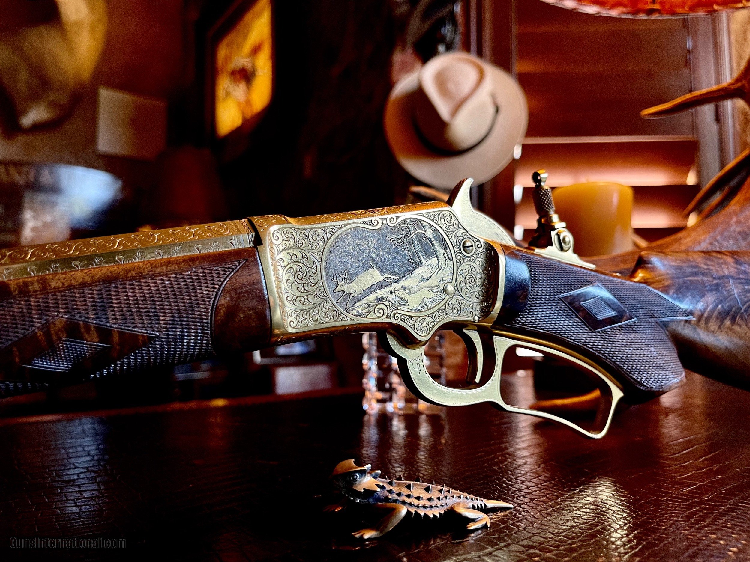 Marlin Model 1897 Lever Action Rifle Serial Number 156565 Scroll and Panel-Scene Engraved by Conrad F. Ulrich Modified Style No. 1 Engraving