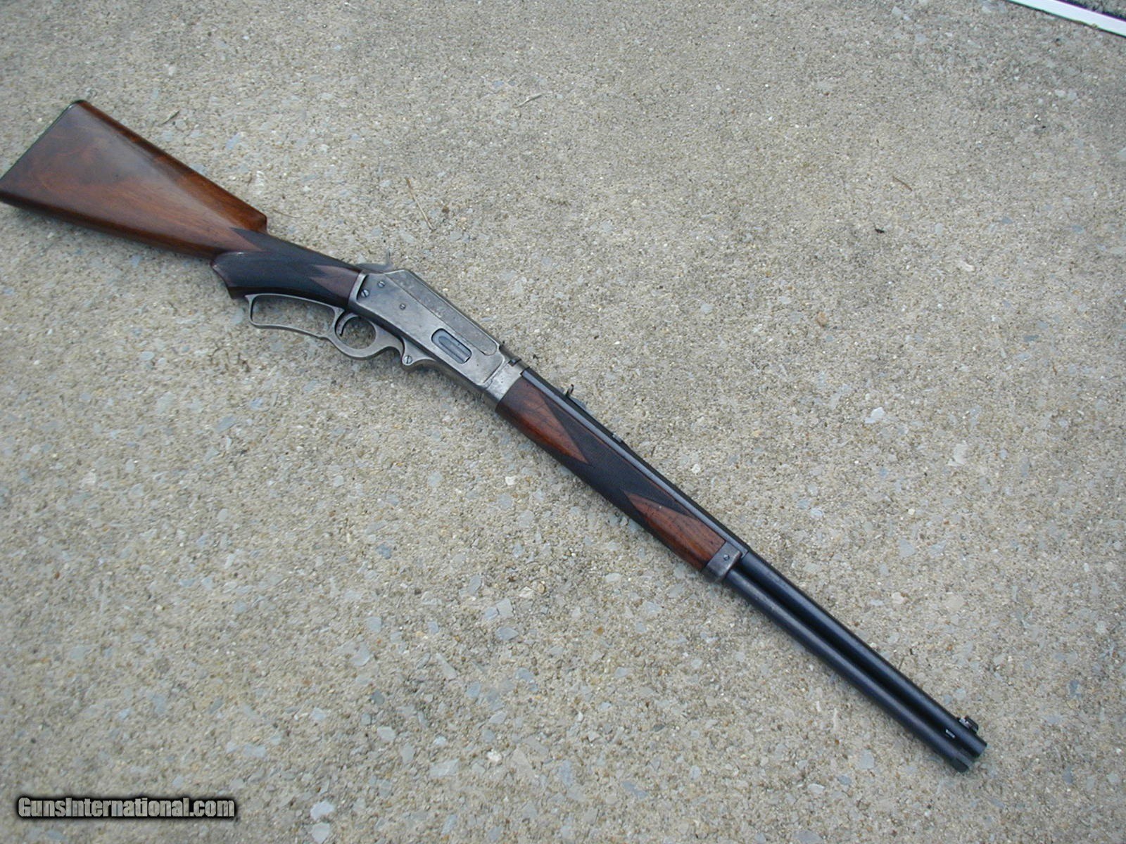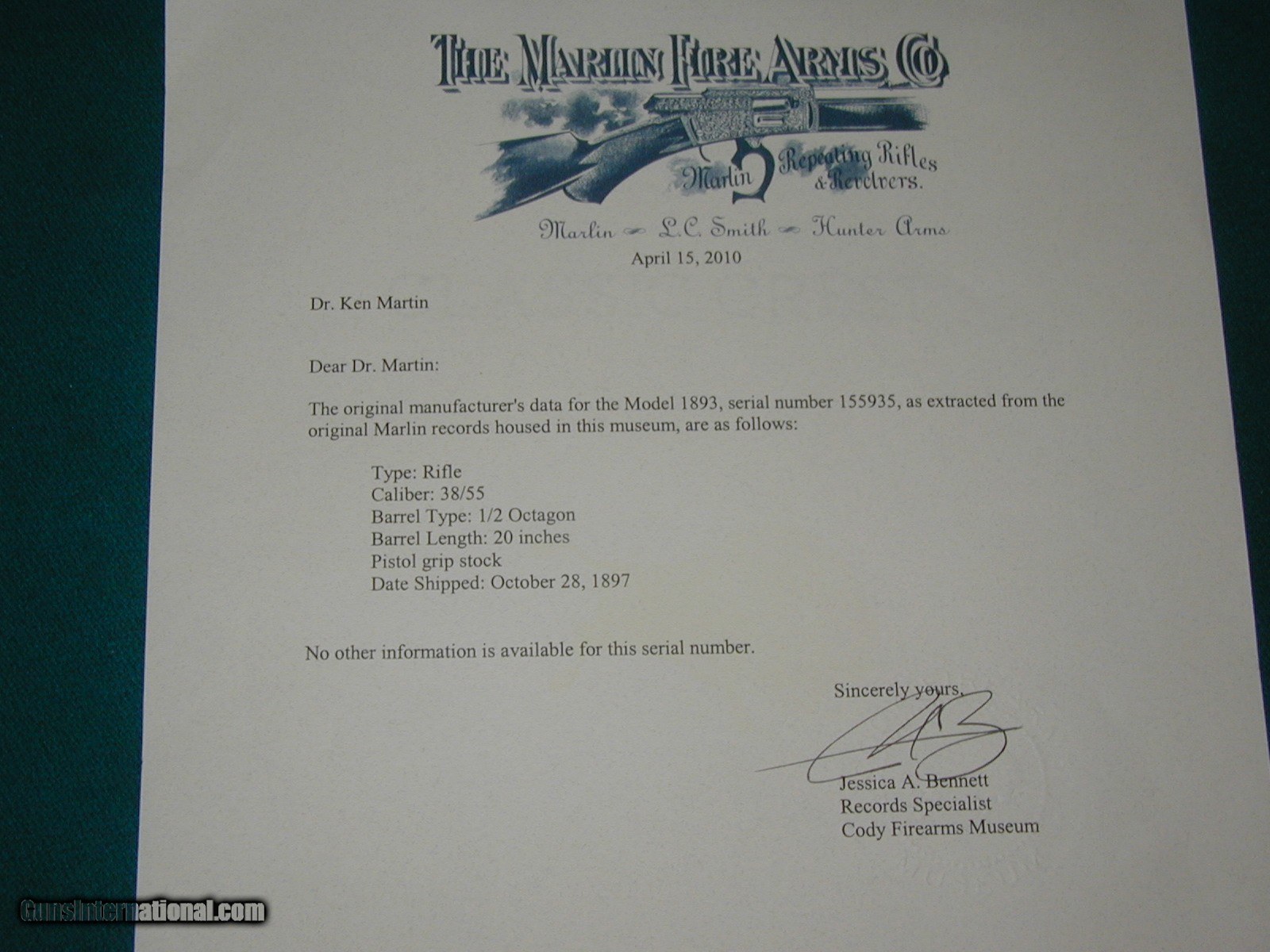 Description: From my pesonal collection, i am offering a beautiful little sweet rareity of a Marlin model 1893, full deluxe 38-55 takedown, 1/2 rnd. 1/2 oct. 20" short rifle...It also comes with a cody letter verifying the configuration, made in 1897 and is an antique.....The barrel has over 90% blue with about 20-30% case color on reciever...sharp and crisp throughout, the bore is super as well.....the checkering and extra varnish on the 1-2x wood is in excellent shape. A VERY RARE Marline deluxe short rifle in excellent original condition. SOLD Antique: Yes |