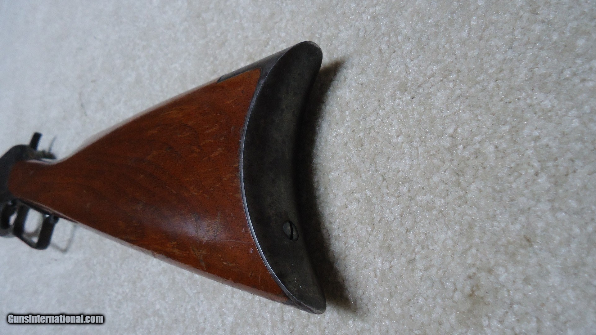 Description: VERY FINE CONDITION MARLIN MODEL 1889 ROUND BARREL RIFLE IN SCARCE .32-20 CALIBER, #95XXX, MADE 1893. The Model 1889 was Marlin's first side-eject lever action rifle- the previous Models 1881 and 1888 were top eject. The model was introduced in 1889 and was discontinued when the improved Model 1894 was introduced in that year. Aside from 34 rifles made in .25-20 (probably at the very end of production as this was a standard chambering for the Model 1894), the .32-20 was the least caliber produced with 15,441 made. For comparison there were 18,635 made in .38-40 and 20,934 made in .44-40. Considering they were made in both octagon and round variations, if made in equal quantities, that would mean there were less than 8,000 rifles made in .32-20 with round barrels. Most M-1889s that I've seen have seen hard service and finding a high condition example is difficult- especially considering their limited quantity produced over a few years worth of manufacturing before the model was discontinued. This example retains fine bright blue on the receiver with normal dulling/thinning on the edges and upper tang with the balance including the loading gate deep blue. The barrel shows fine blue with minor age/thinning only. The mag tube is similar to the barrel with some gray/brown mixing on part of the bottom section. There is some good case color on the hammer sides and some light, faded case color on the lever sides (more on the left side). Original buckhorn rear sight with elevator bar intact and factory Rocky Mountain blade front sight. The bore is surprisingly excellent with no pitting and the stock and forend are also excellent with most of the finish intact and tight wood to metal fit. Even the forend cap retains some fine blue. One of the better 1889s I've seen in a while and in the more scarce chambering. A really attractive 128 year old Marlin! SOLD Antique: Yes Manufacturer: MARLIN Model: 1889 RIFLE Serial Number: 95XXX Barrel Length: 24 Condition: EXCELLENT |