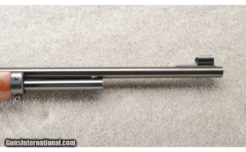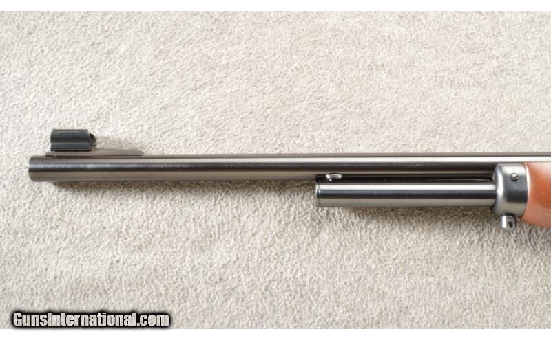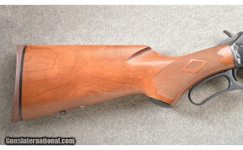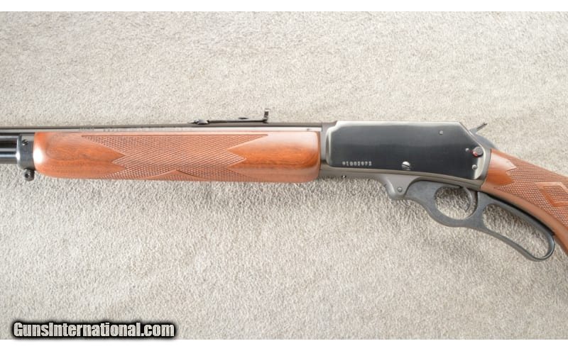 Description: This is a (JM) Marlin 338MX chambered for .338 Marlin Express. This rifle has the push safety on the receiver that blocks the hammer. Marking on the left side of the barrel "338MX", "THE MARLIN FIREARMS CO. NORTH HAVEN, CT. U.S.A. / * * * * MODEL 338MX – CAL. MARLIN EXPRESS * * * *". The left side of the barrel at the receiver is marked with the "JM" proof. The left side of the receiver is marked with the serial number "91003973". The right side of the barrel is marked with Marlin's two-lined warning. The front sight is a hooded brass bead blade atop a serrated ramped riser that is screwed to the barrel. The rear sight is a flip up semi-buckhorn U-notch elevator sight that is dovetailed to the barrel. The top of the receiver is drilled, tapped, and filled in four places for mounting a scope. The stocks are two-piece checkered wood with a banded forearm, capped pistol grip, fluted straight comb, sling stud front and rear, and a firm rubber Marlin buttpad with a black spacer. The Marlin Bullseye is present in the belly. This example is in excellent condition with a couple faint blemishes. No box. .338 MAG SOLD Chambers: Lever action. Metal Condition: 99%. Wood Condition: 99%. Barrels: 22" barrel. Triggers: Single. Stock Dimensions: LOP 13 5/8". Fore End: Checkered. Butt Pad: Rubber. Weight: 7 lbs Item Location: Owatonna, MN |