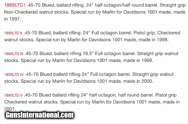 Description: Time to let someone else enjoy this rare collection. Up for sale are 5 Marlin 1895LTDs all chambered in 45-70 GOV. This set of Marlin 1895s were produced starting in 1997-2001. This is not the first set of 1895LTDs but what makes this set rare is all have the same serial numbers, 05! The set includes the 1895LTD I, 1895LTD II, 1895LTD III, 1895LTD IV and 189LTD V. All rifles are unfired from the factory and includes factory box and paperwork. Will not seperate set. Pictures will be provided for serious inquiries. For more information, pictures or offers text to (580) 320-3521. For Oklahoma residents the rifle can be picked up in Ada or Durant Oklahoma, buyer must be willing to sign BOS and have ID. For out of state Shipping/insurance is available at buyers expense to your FFL of choice. . I will be slowly listing more and more rifles, hunting handguns, scope and ammo. SOLD Rifle Caliber: .45-70 Government Manufacturer: Marlin Model: 1895LTD Condition: Excellent Metal Condition: Excellent Wood Condition: Excellent Bore Condition: Excellent Manufacture Date: 1999 Item Location: Ada, Durant Oklahoma |