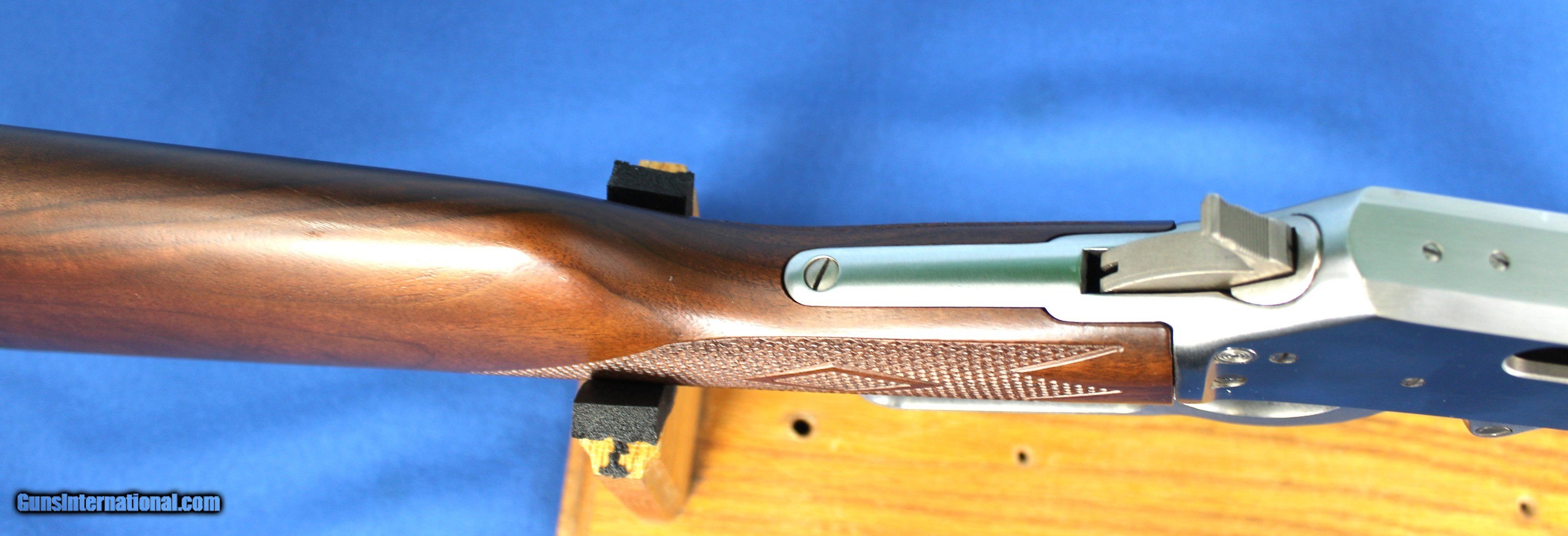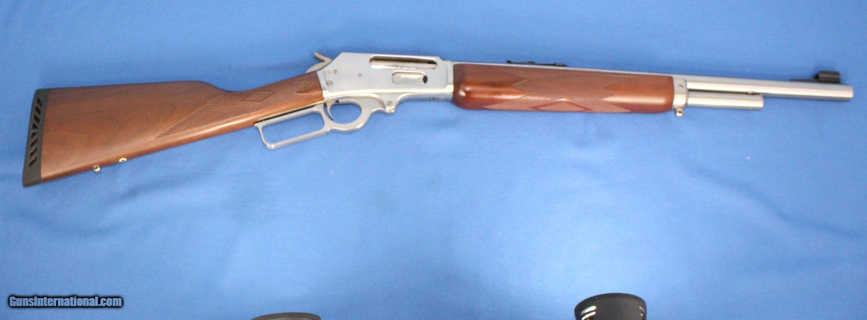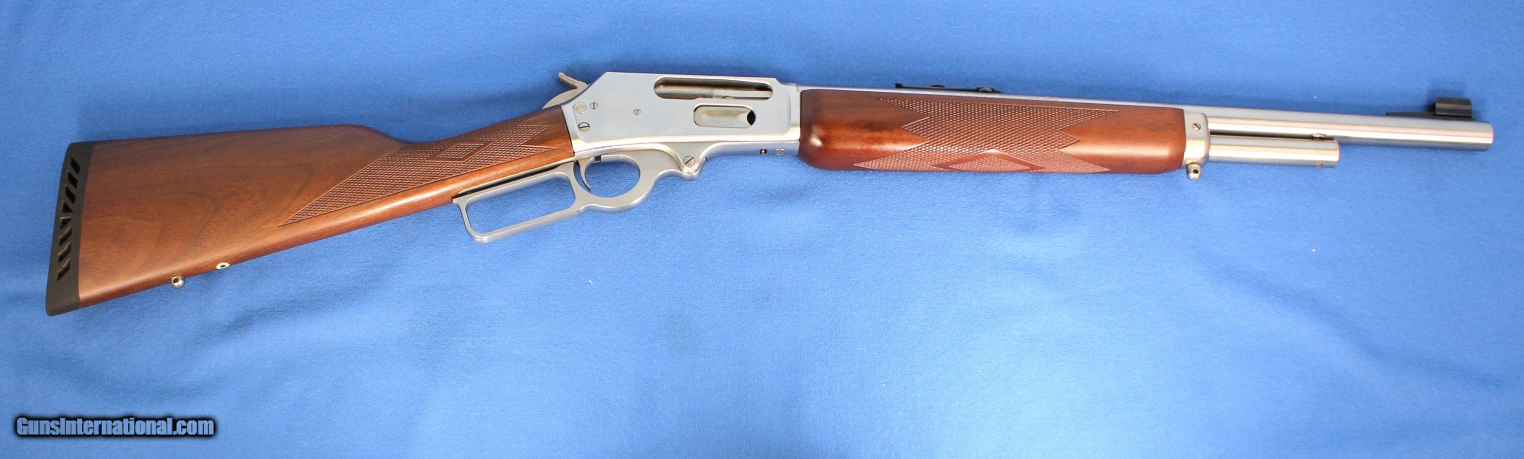 Description: MARLIN 1895GS 45-70 Specs: Caliber: .45-70 Government Capacity: 4-shot tubular magazine (JM) Barrel Length: 18.5 inches Overall Length: 37 inches Weight: 7 pounds Action: Lever action with side ejection Material: Stainless steel receiver, barrel, lever, trigger guard plate, magazine tube, and loading gate Stock: American black walnut with cut checkering and a ventilated recoil pad. Safety: Hammer block safety Sights: Semi-buckhorn rear (Damaged) and brass bead front. Condition: Used Excellent SOLD Rifle Caliber: .45-70 Government Manufacturer: MARLIN Model: 1895GS Barrel Length: 18.5 Condition: Used Excellent Metal Condition: Excellent Wood Condition: Excellent Weight: 7 lbs. |